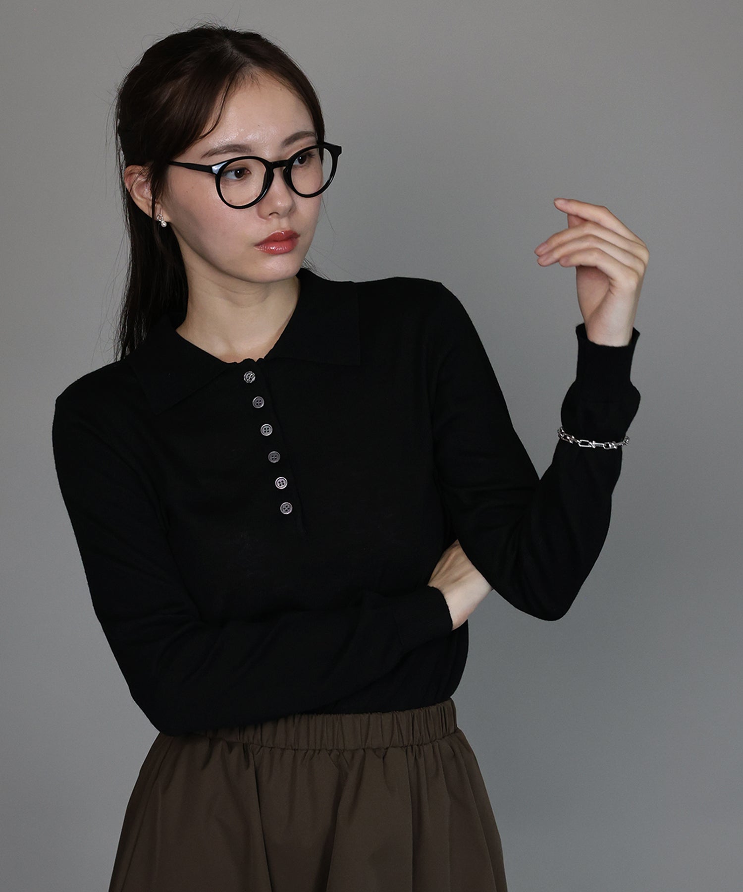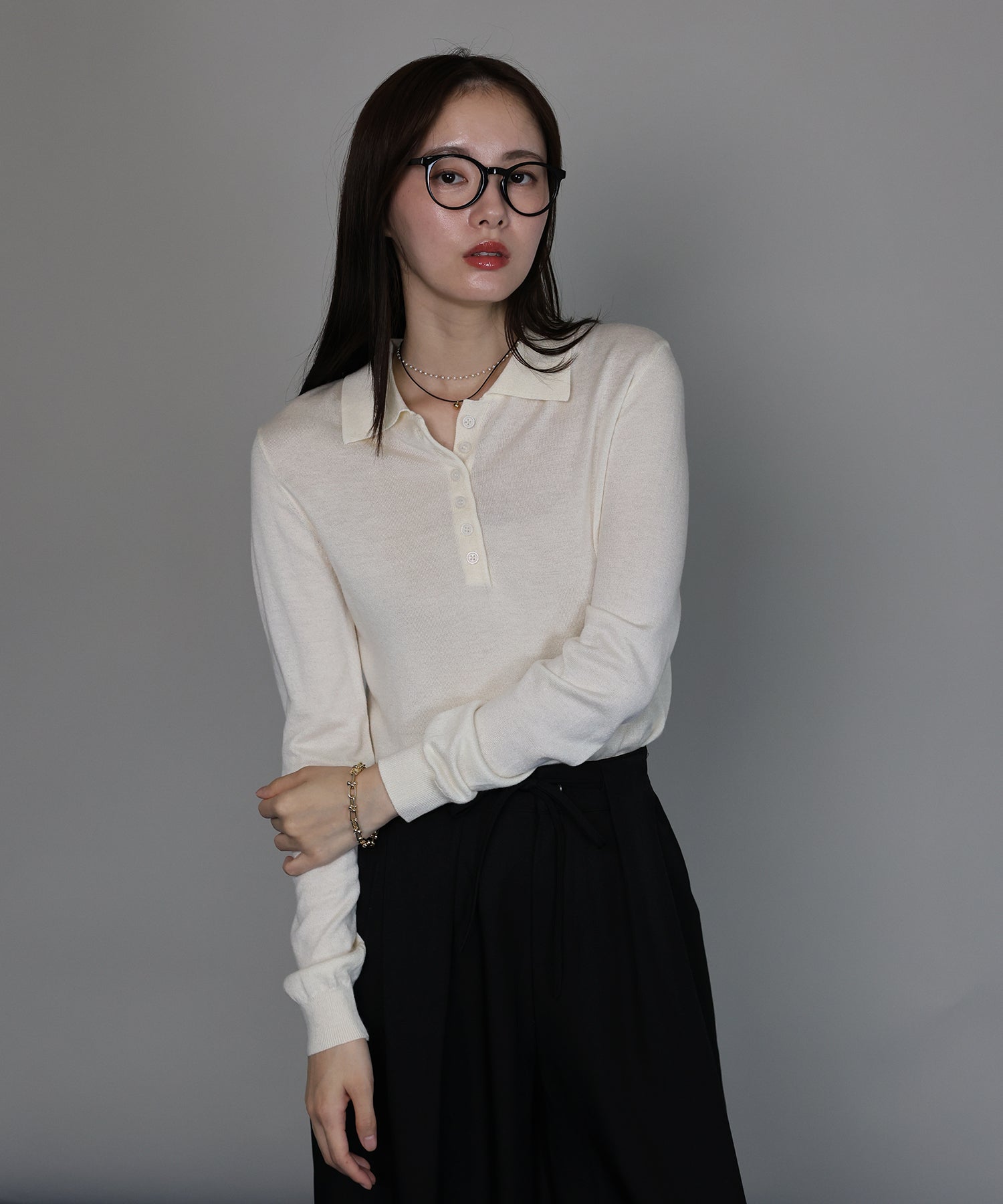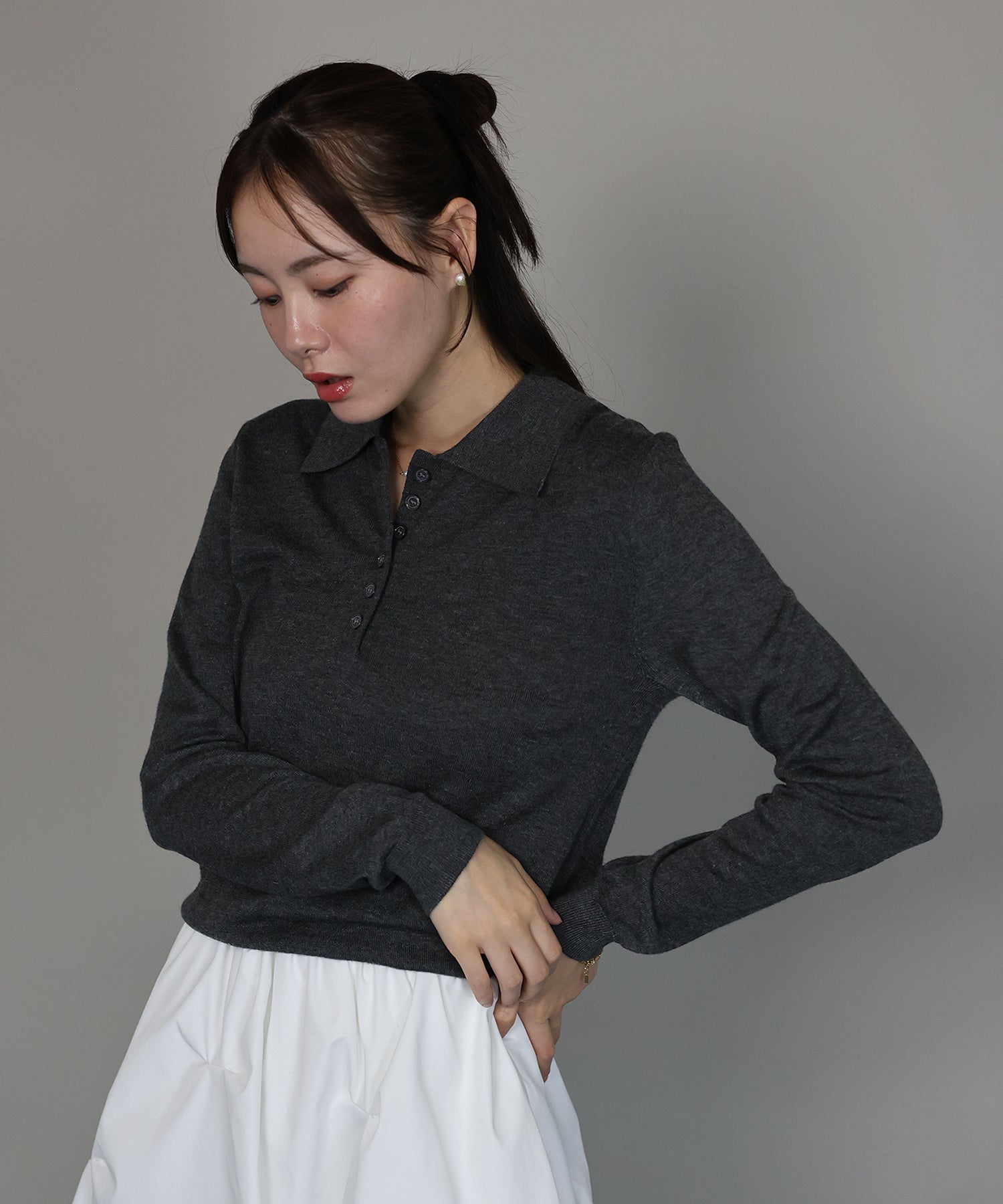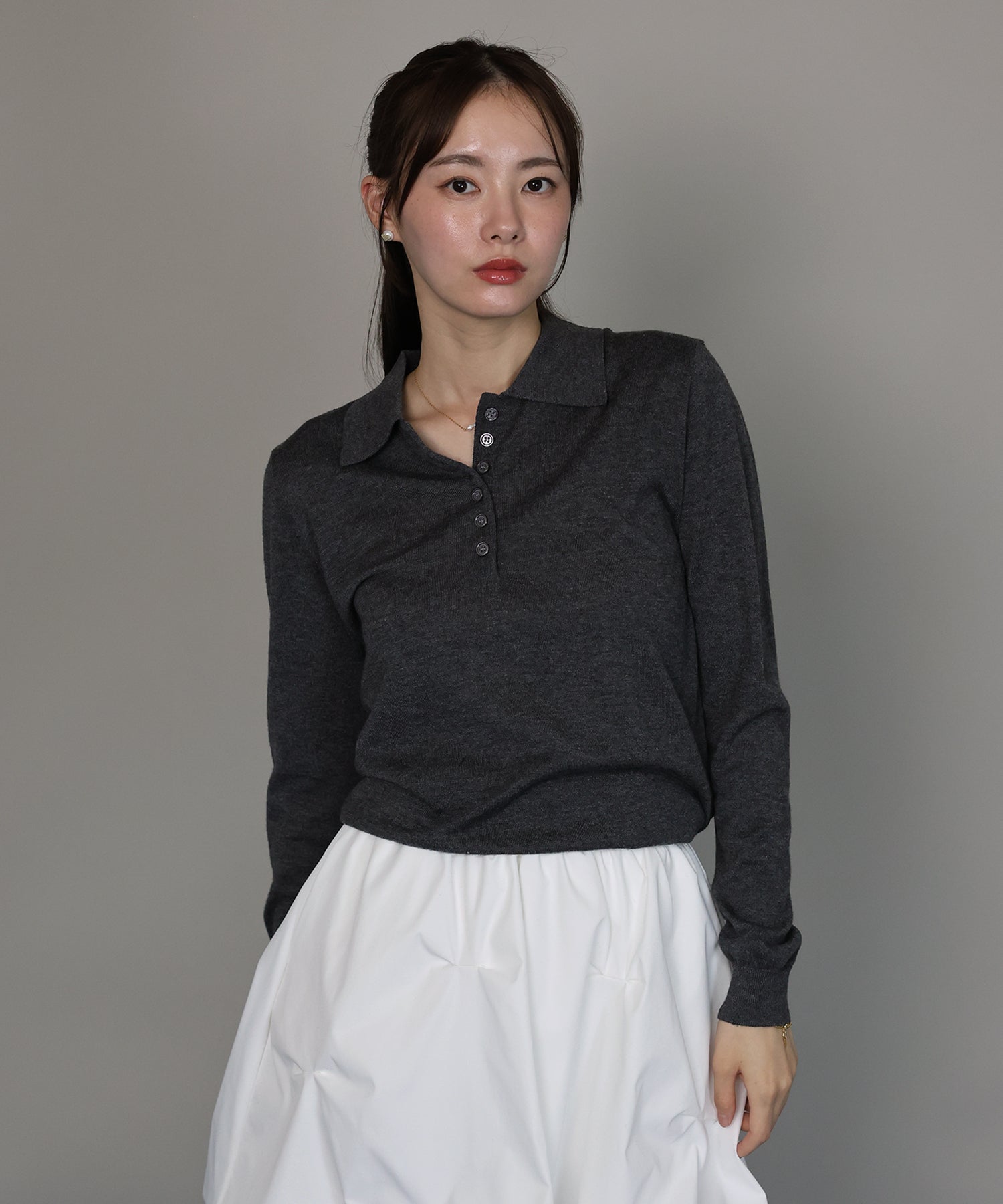 上質なウール混素材を使用し、薄手ながらも程よいあたたかみを感じられるポロニット。