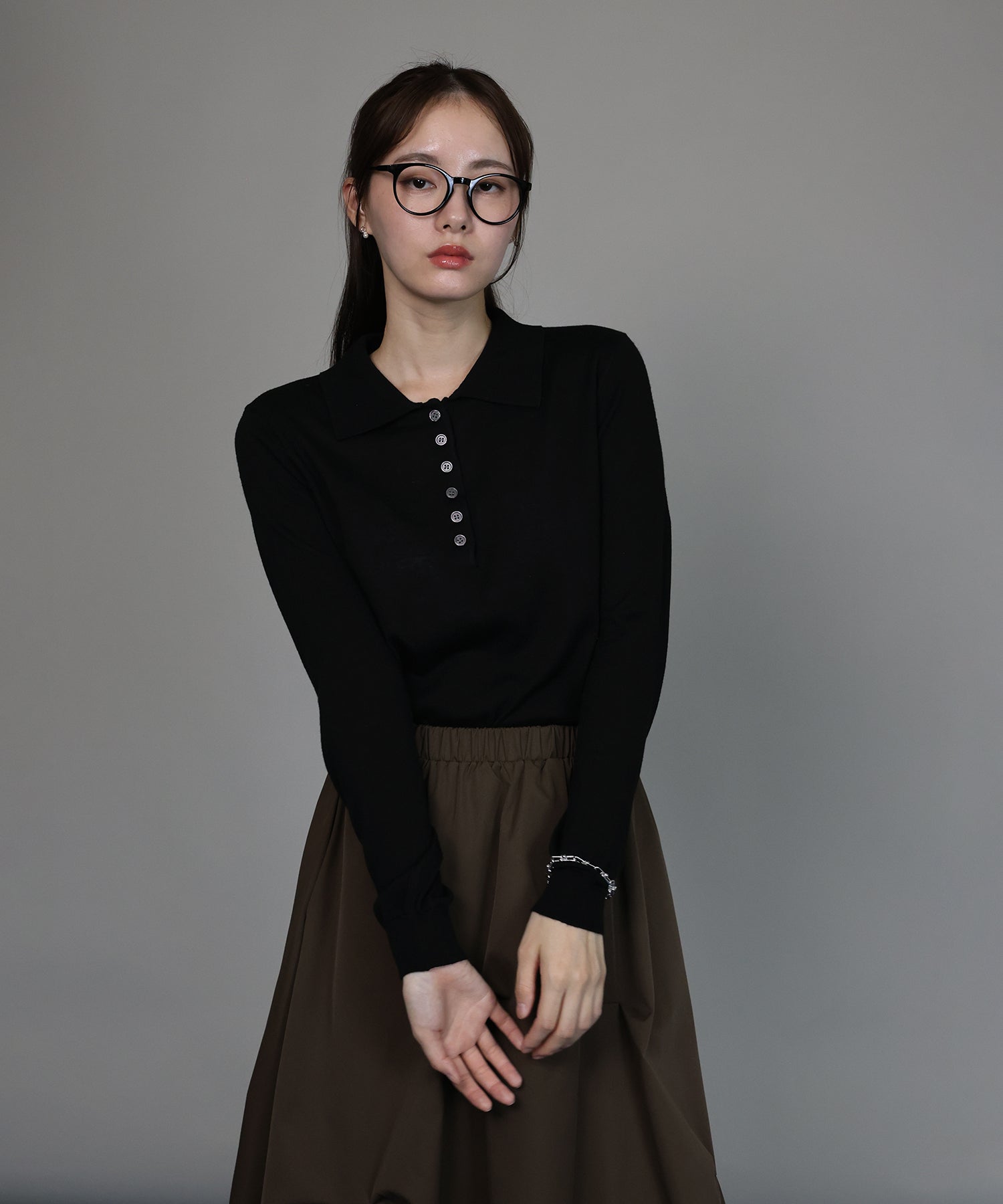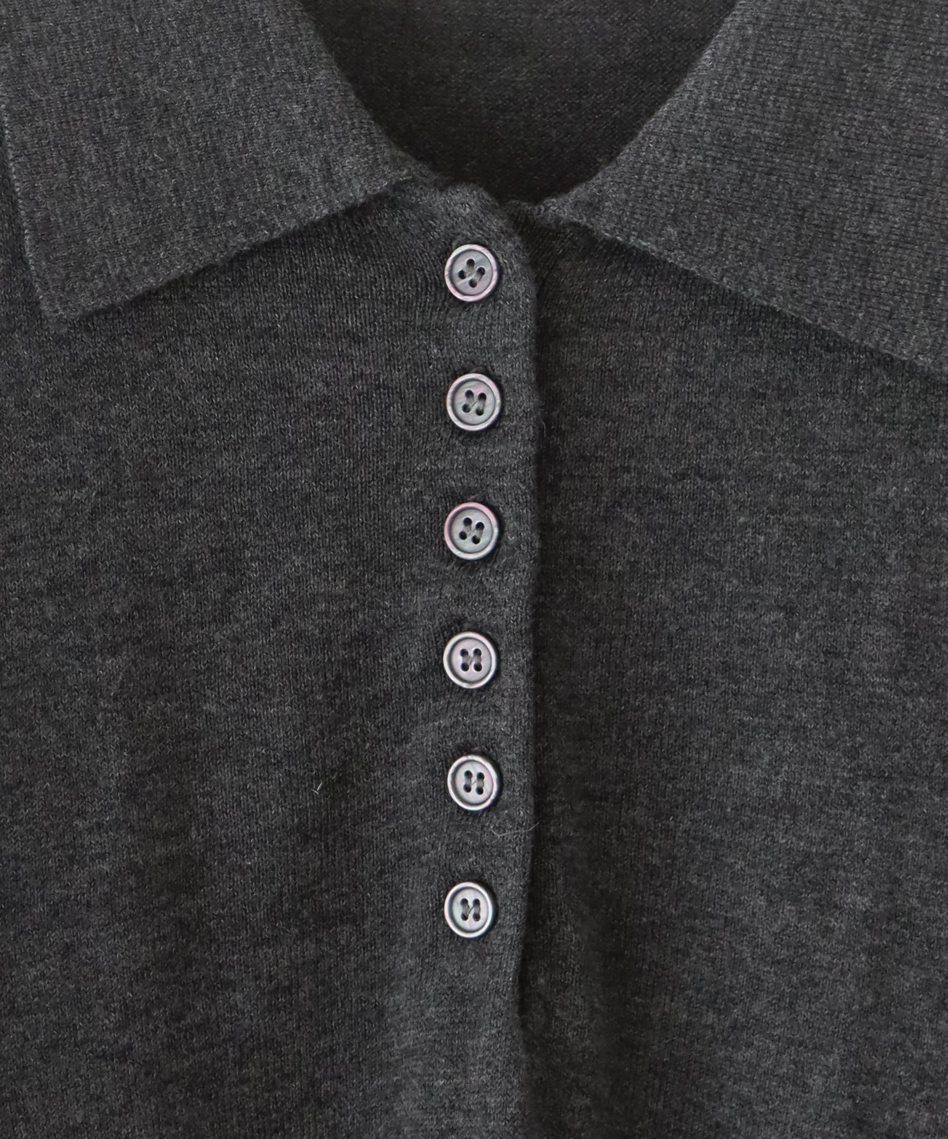 シェルボタンが上品なアクセントとなり、シンプルながらも洗練された雰囲気を演出します。