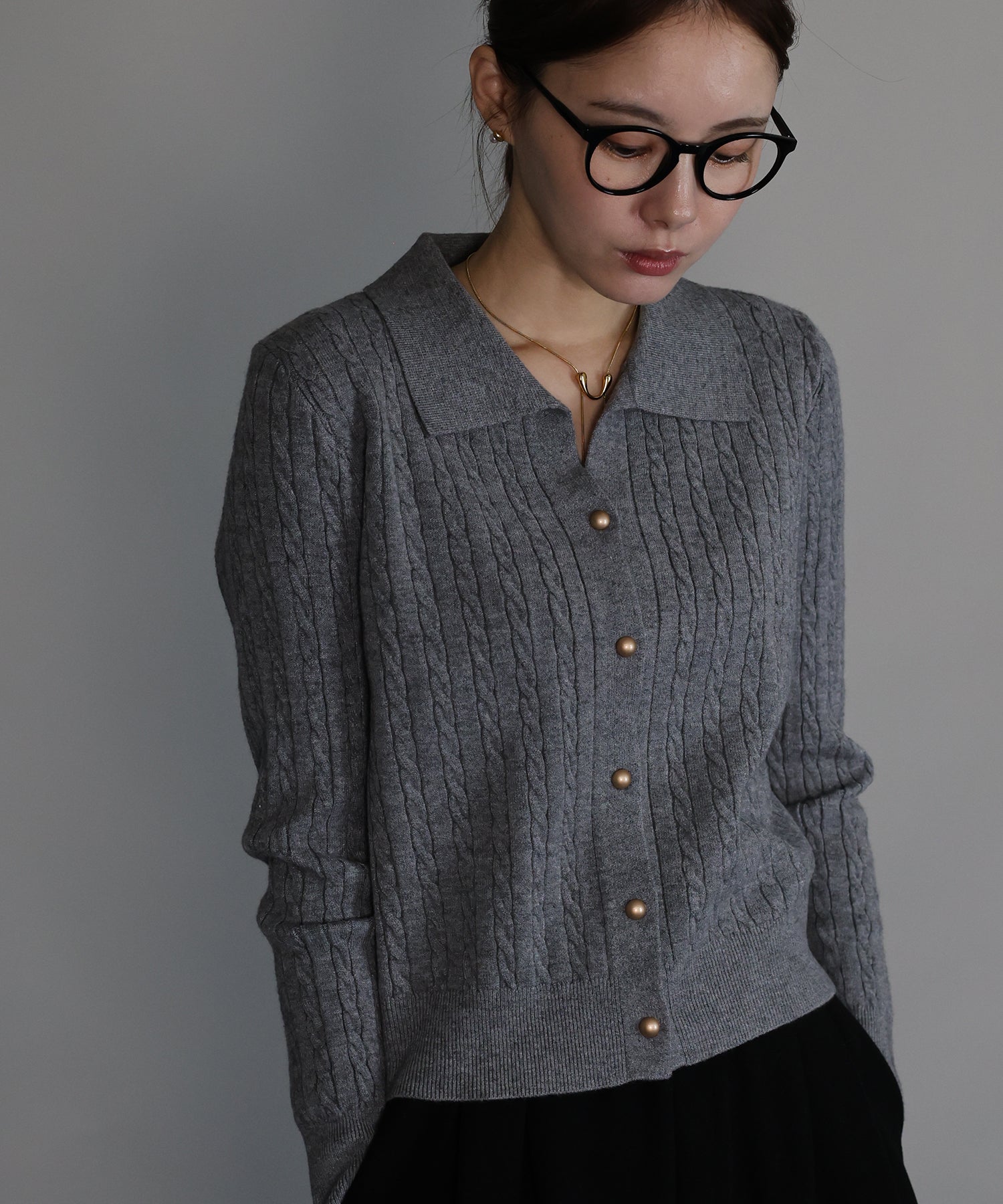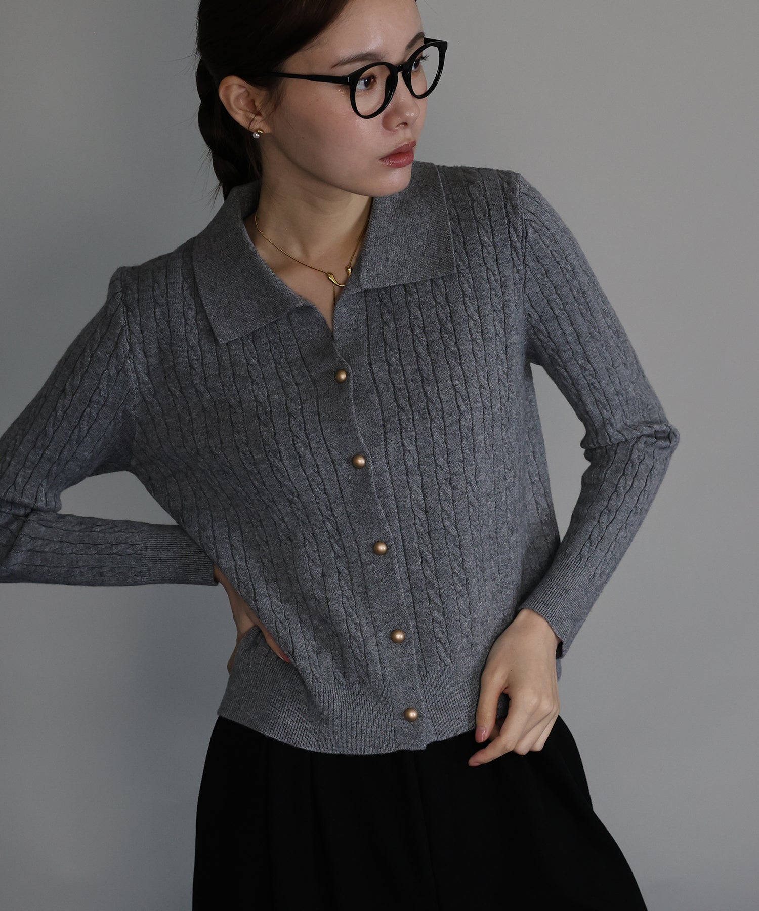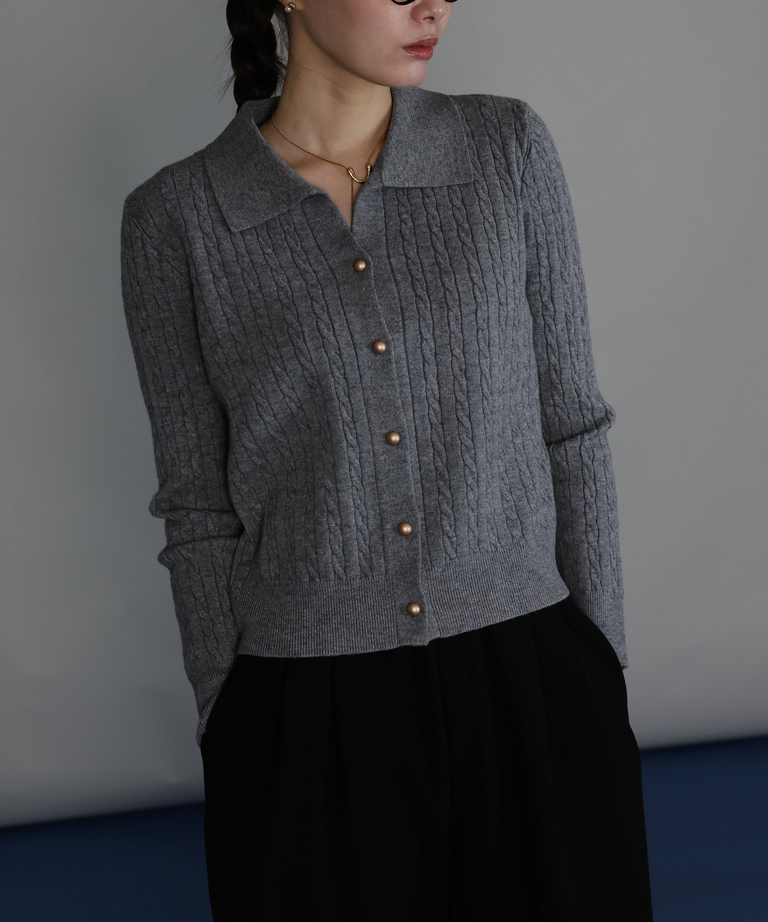 立体感のあるケーブル編みと、上品に輝く金ボタンが目を惹くニットカーディガン。