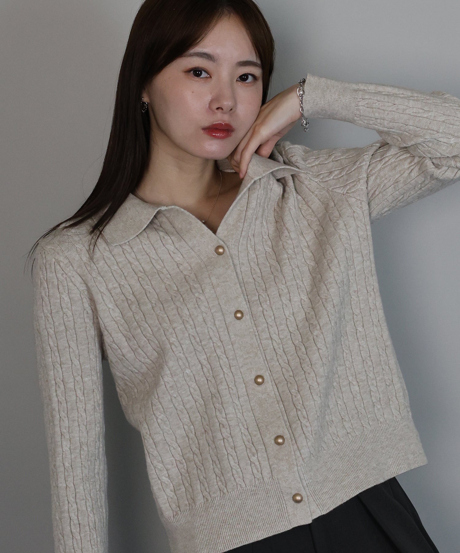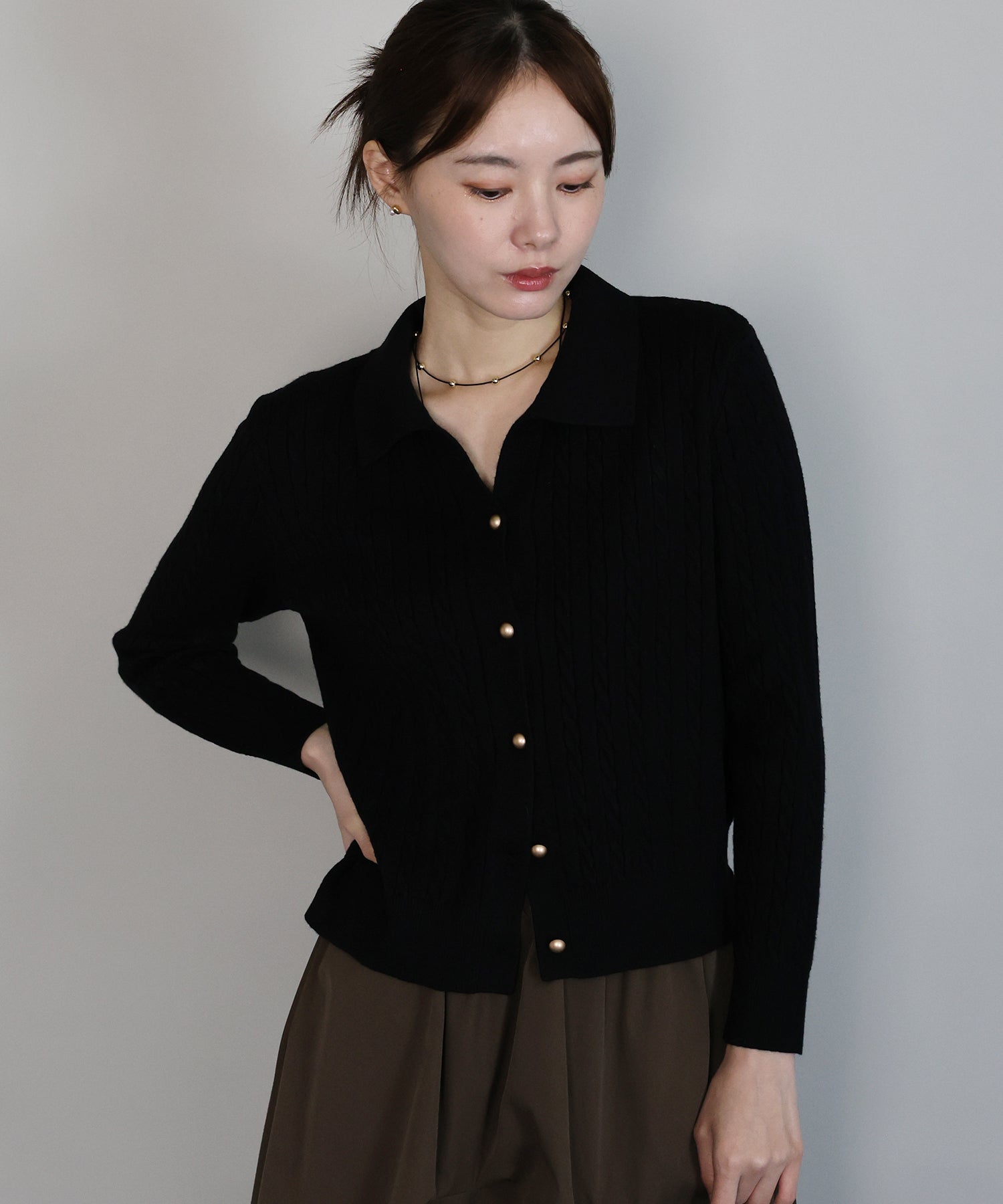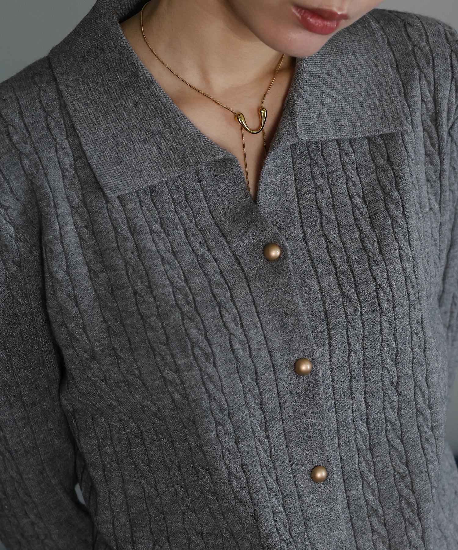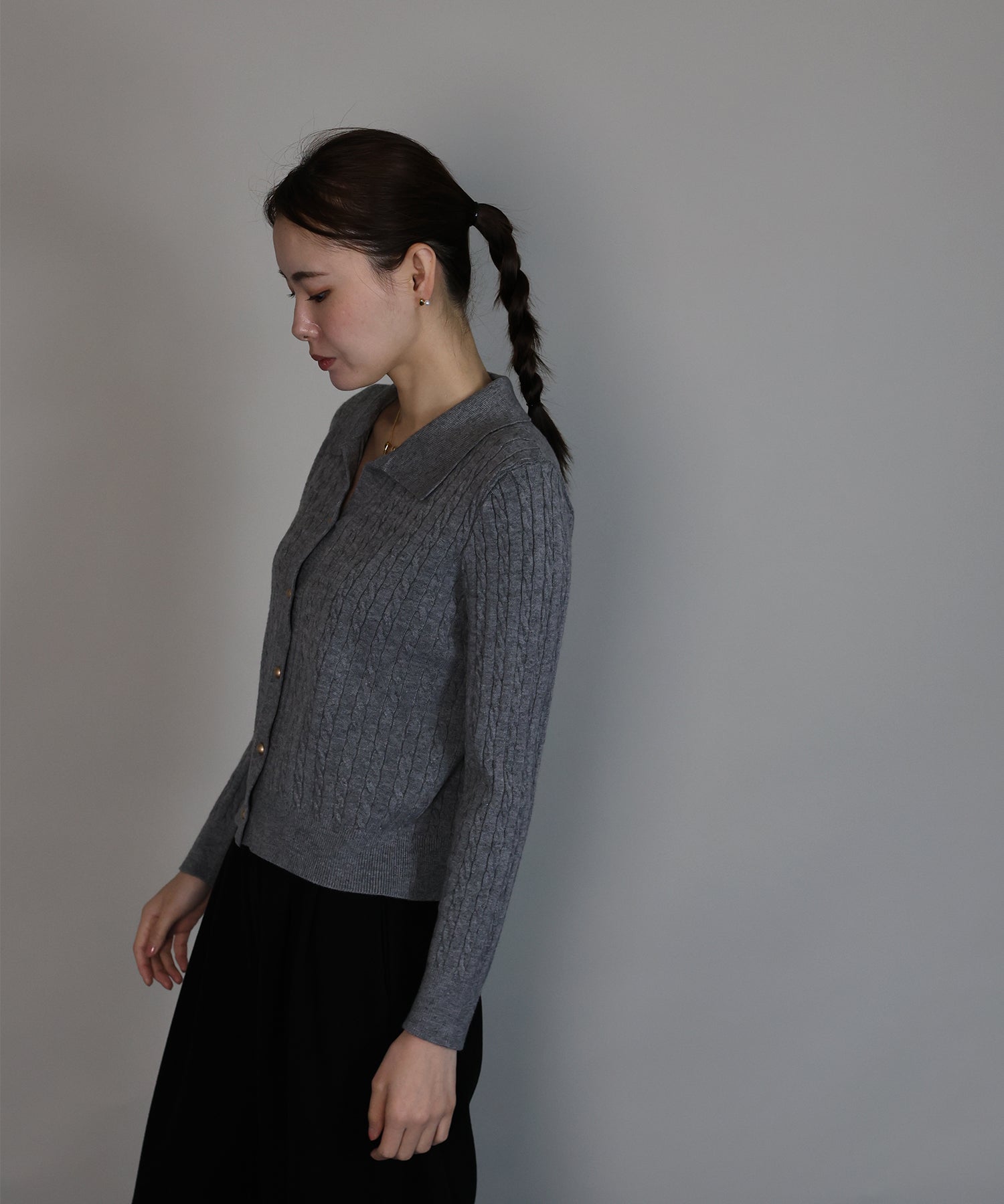 立体感のあるケーブル編みと、上品に輝く金ボタンが目を惹くニットカーディガン。