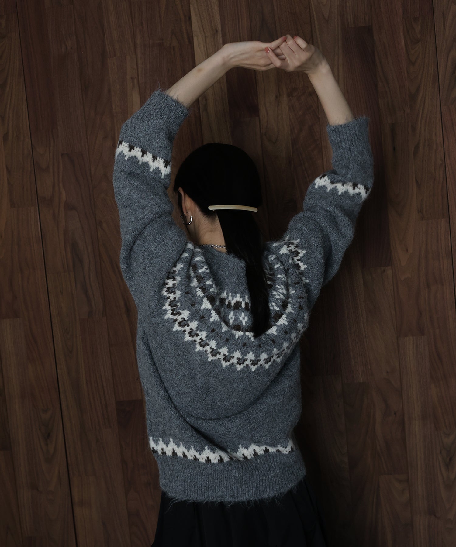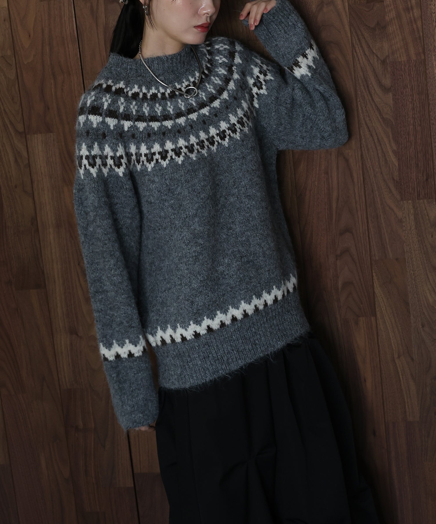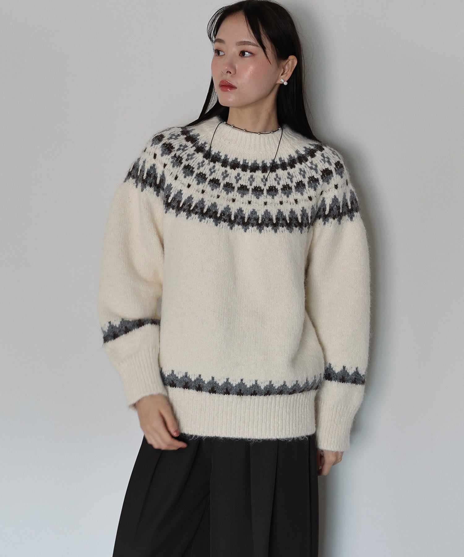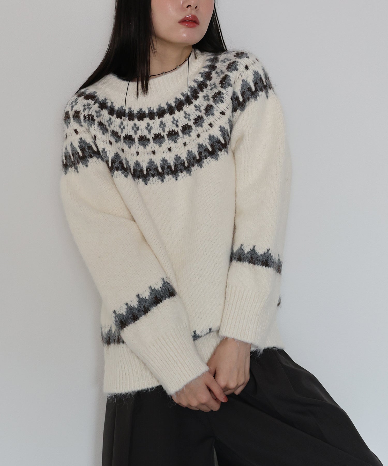 秋冬らしいノルディック調デザインが目を惹く、大人可愛いニットプルオーバー。