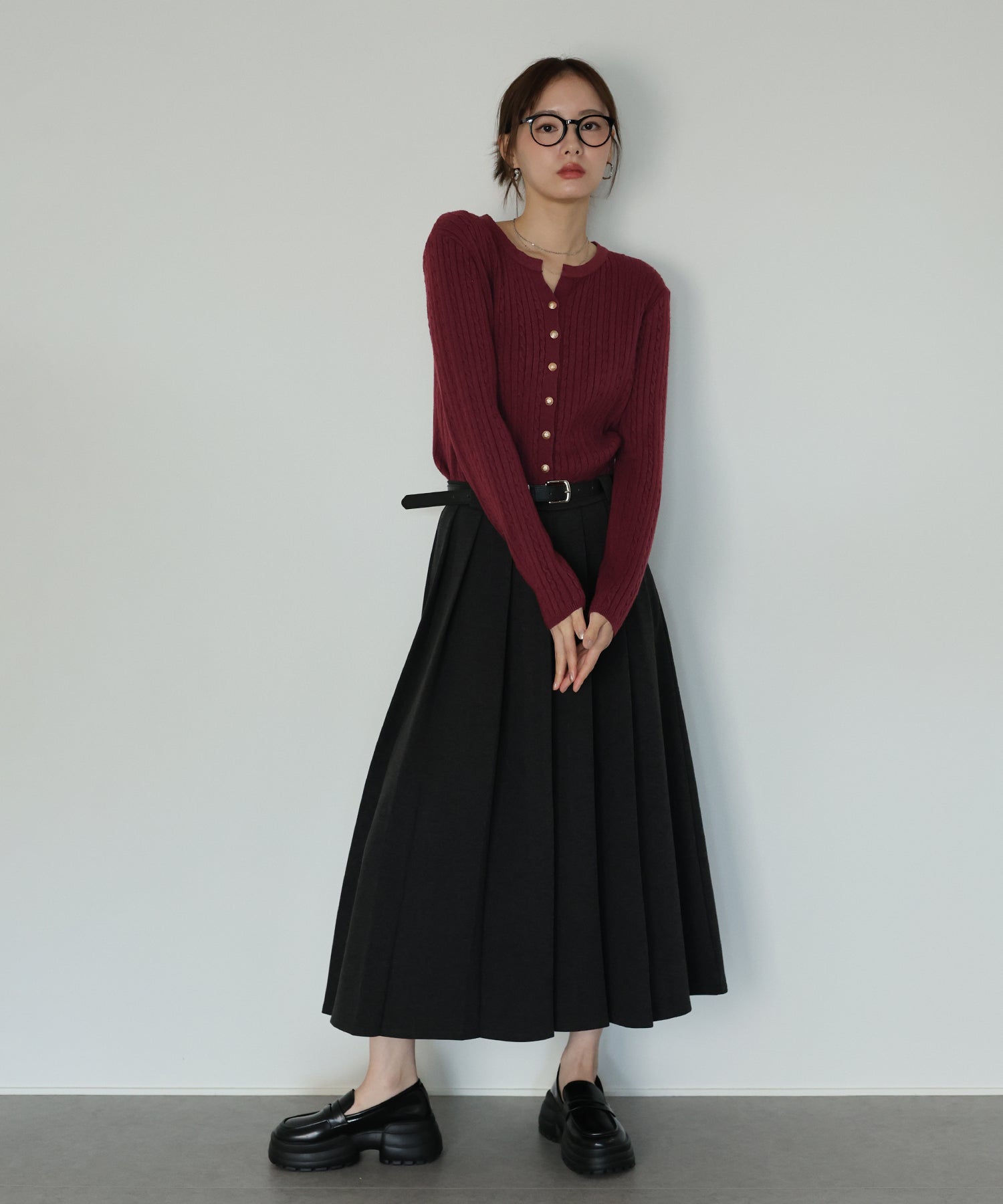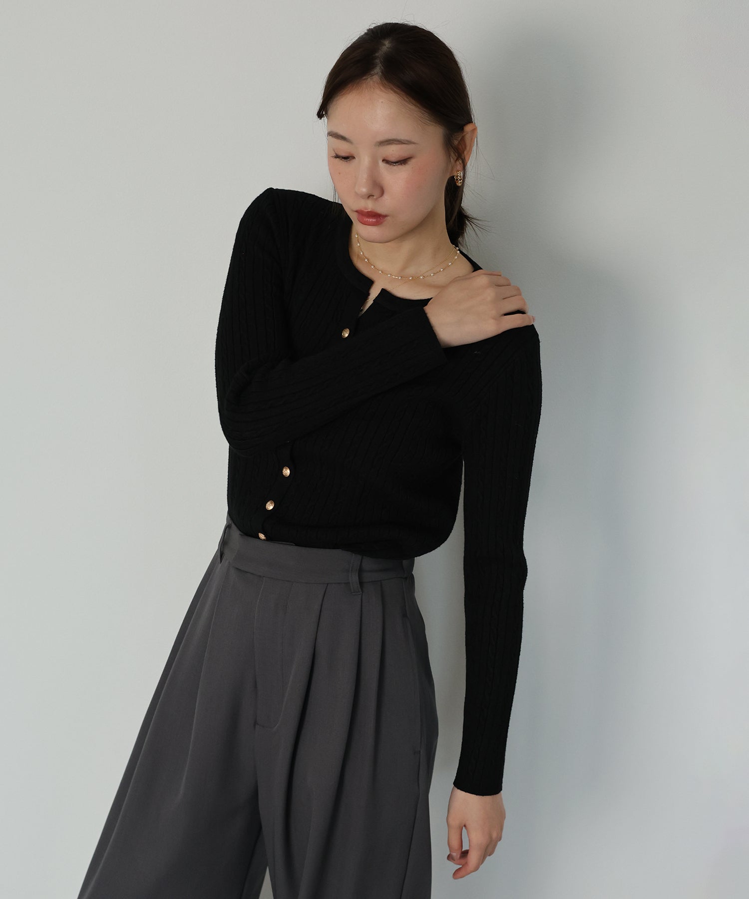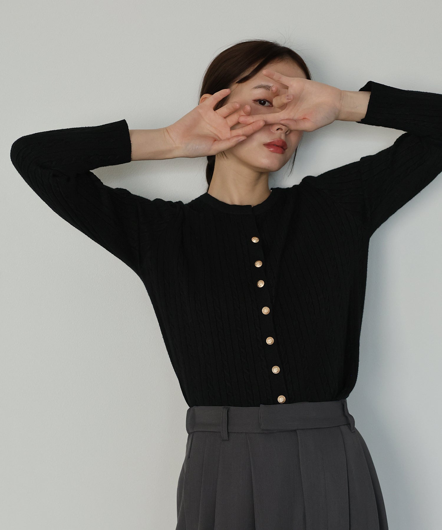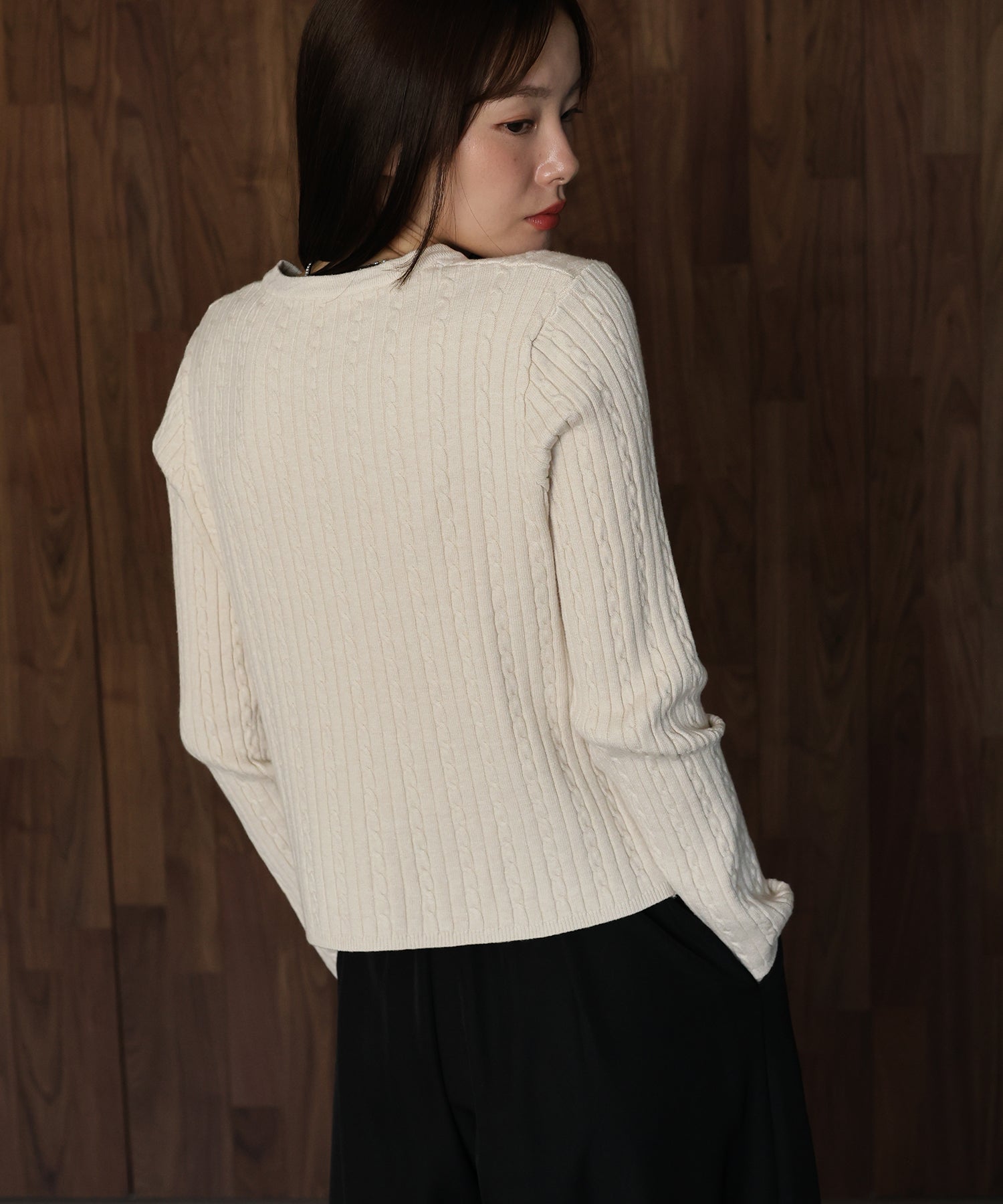 ゴールドボタンケーブルクルーカーディガン