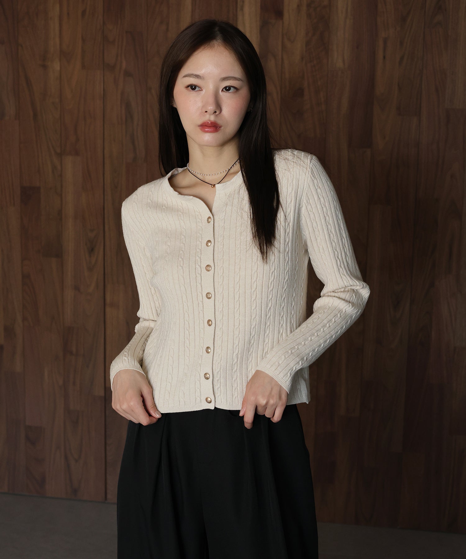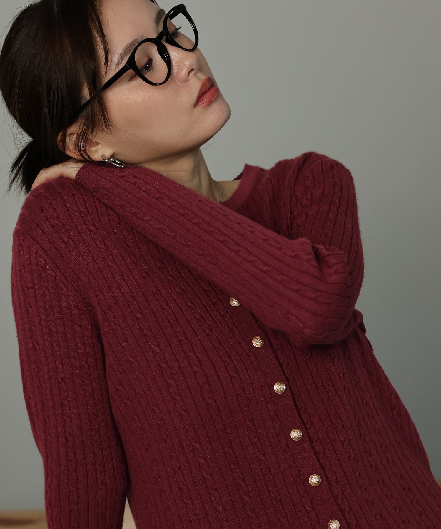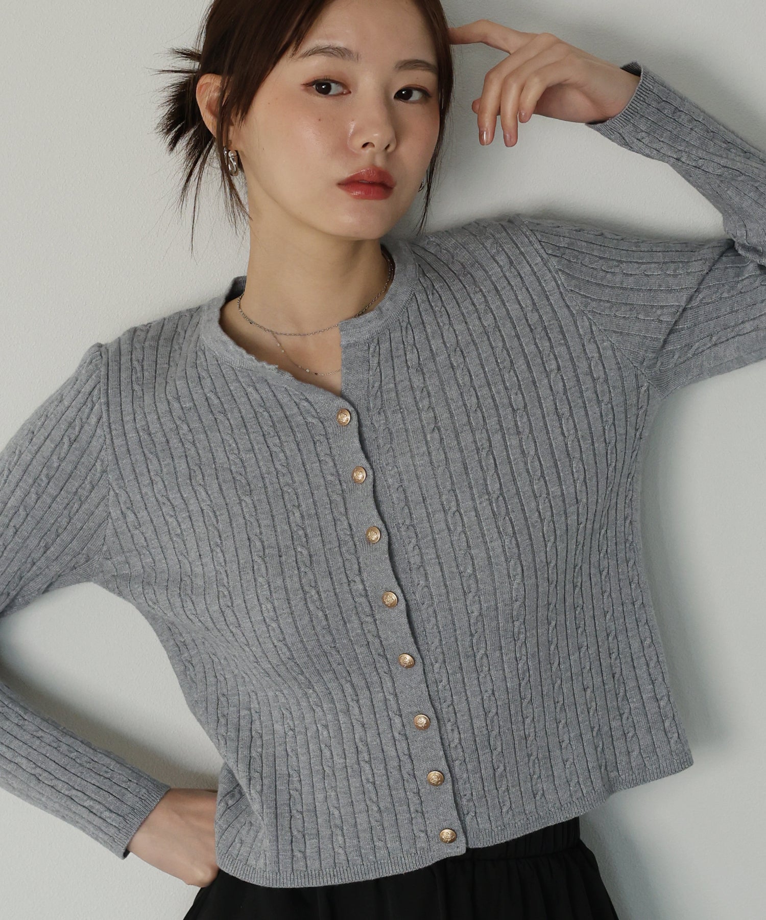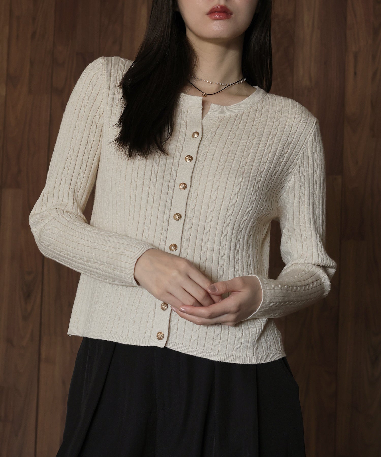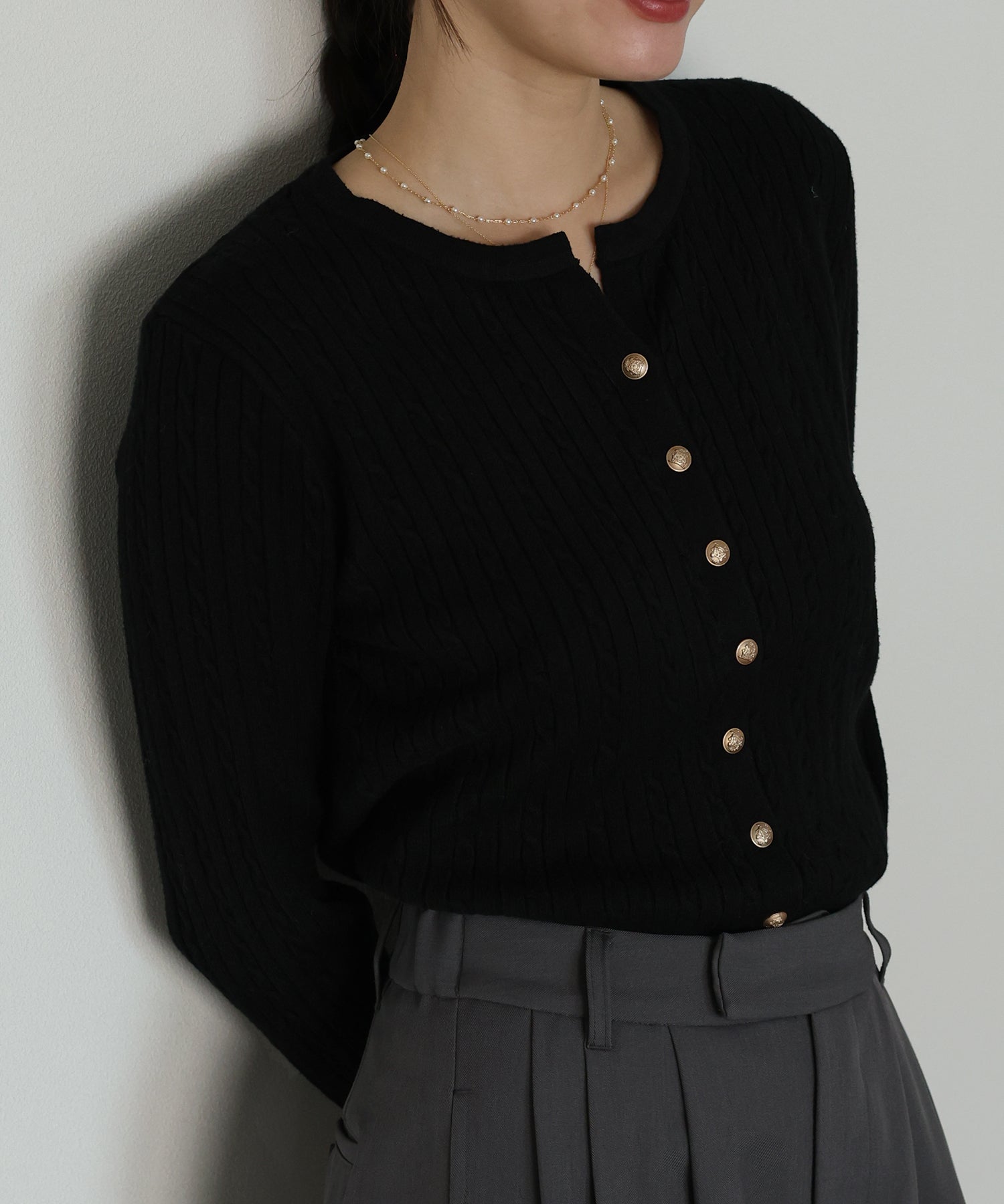 立体感のあるケーブル編みと、上品に輝く金ボタンが目を惹くニットカーディガン。