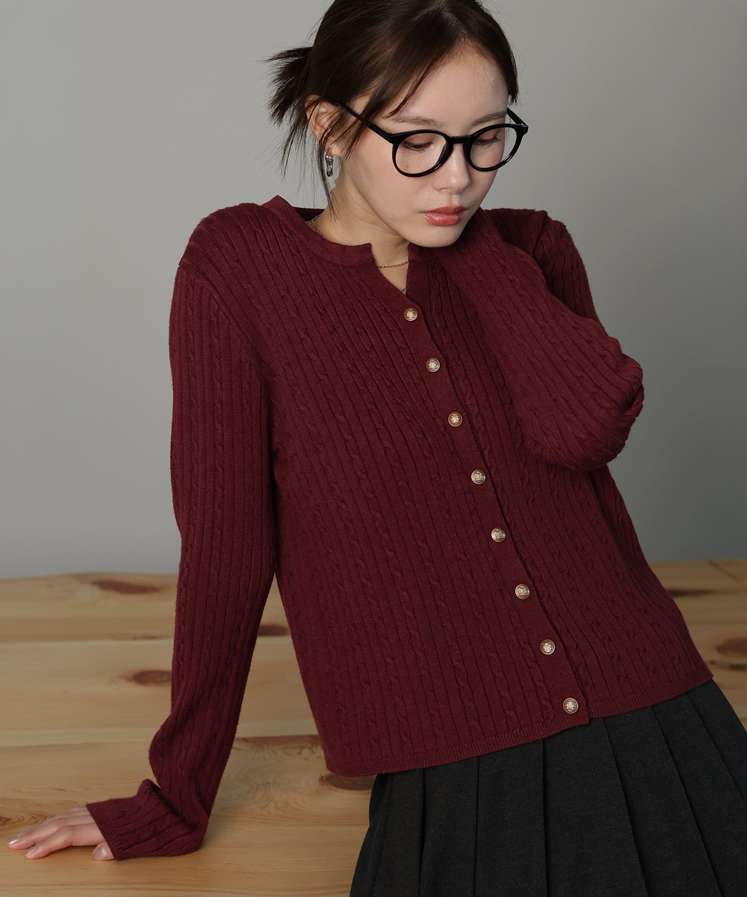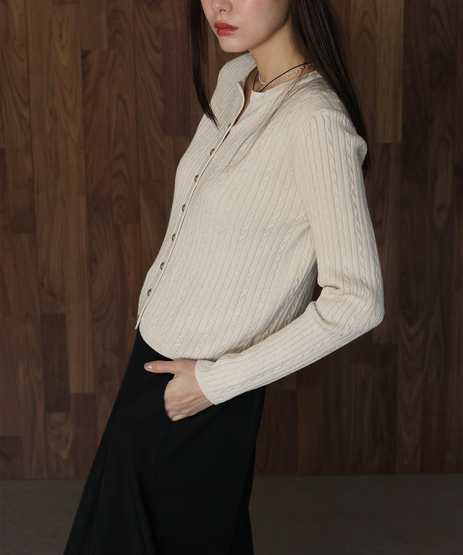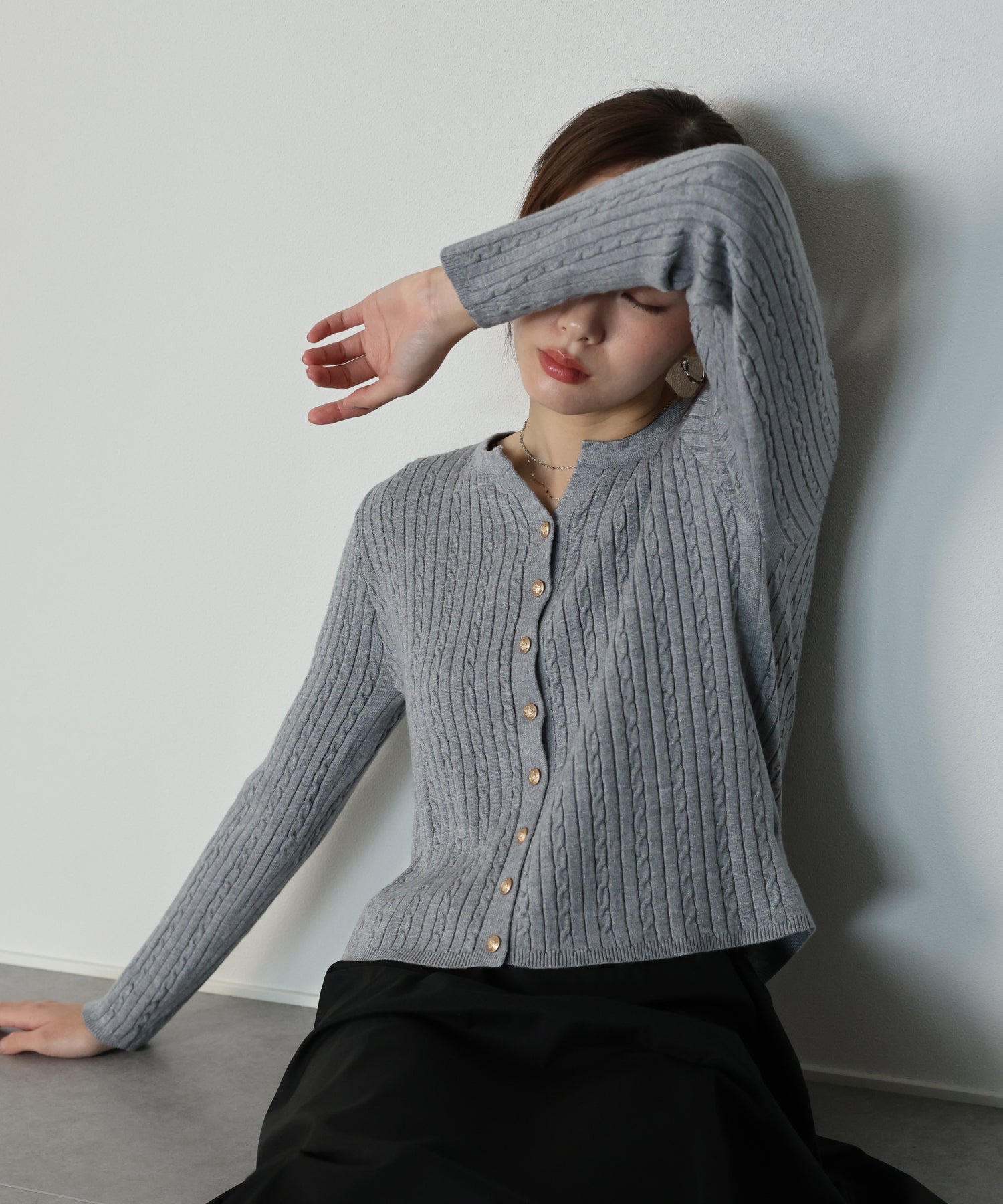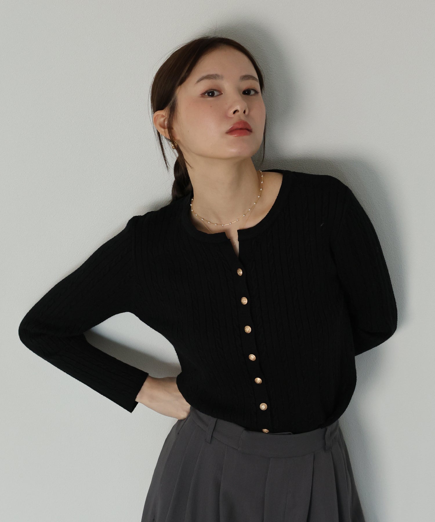 立体感のあるケーブル編みと、上品に輝く金ボタンが目を惹くニットカーディガン。