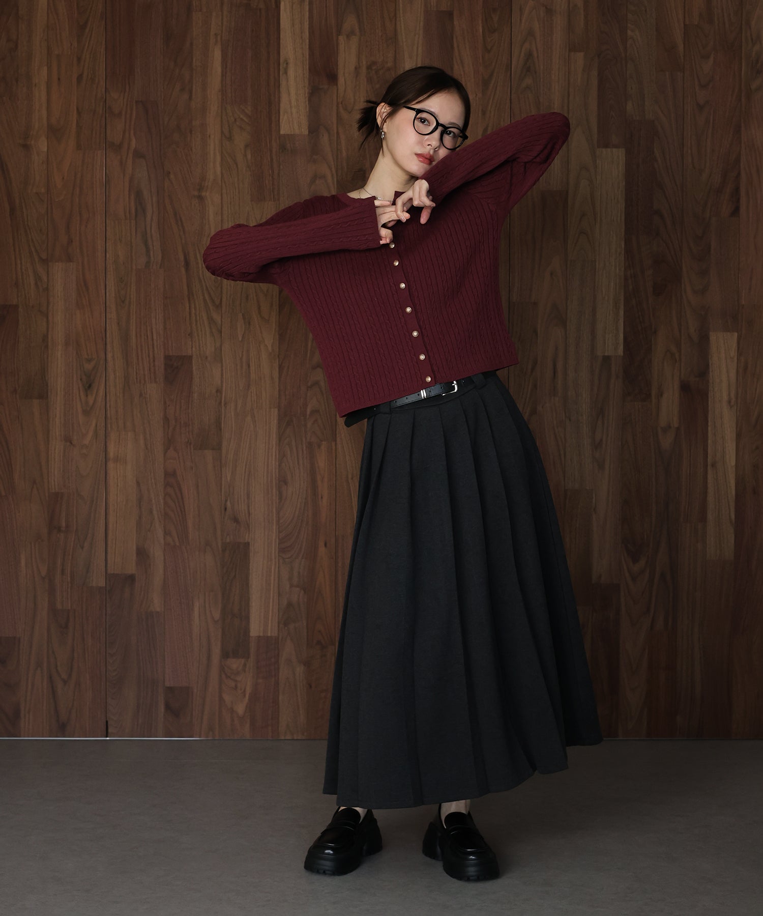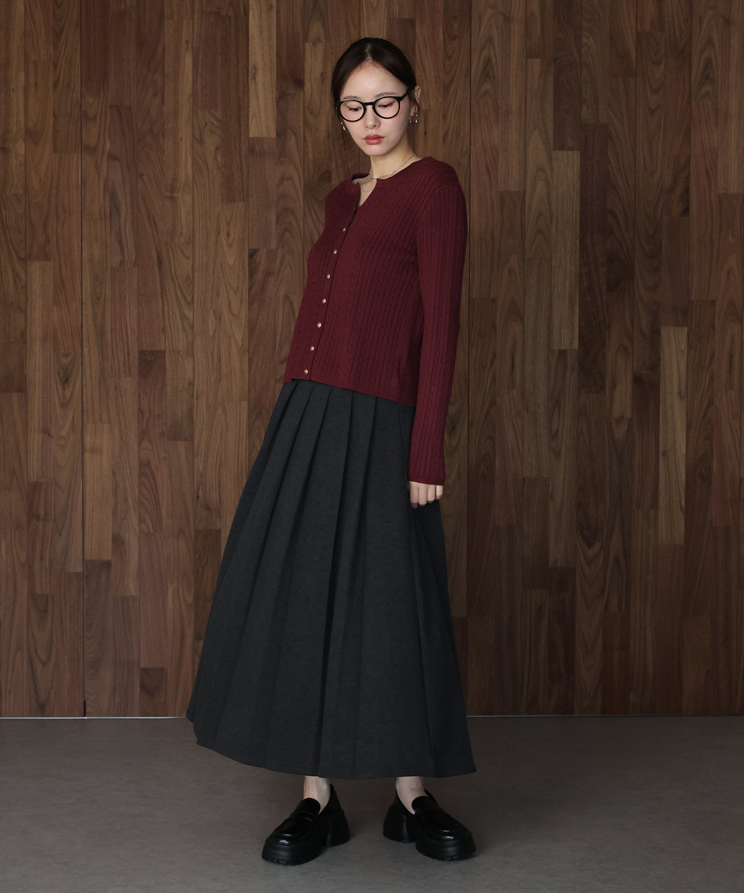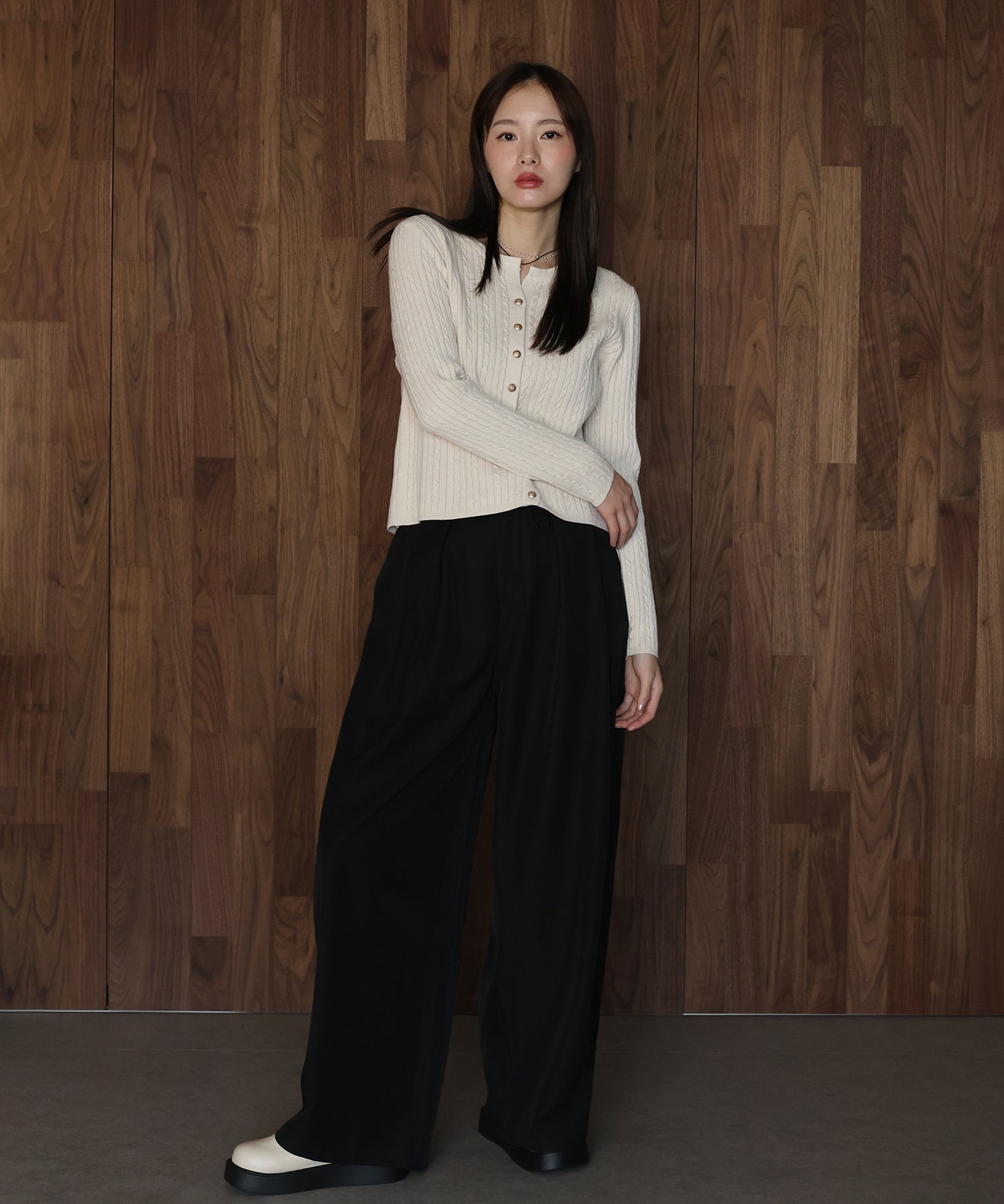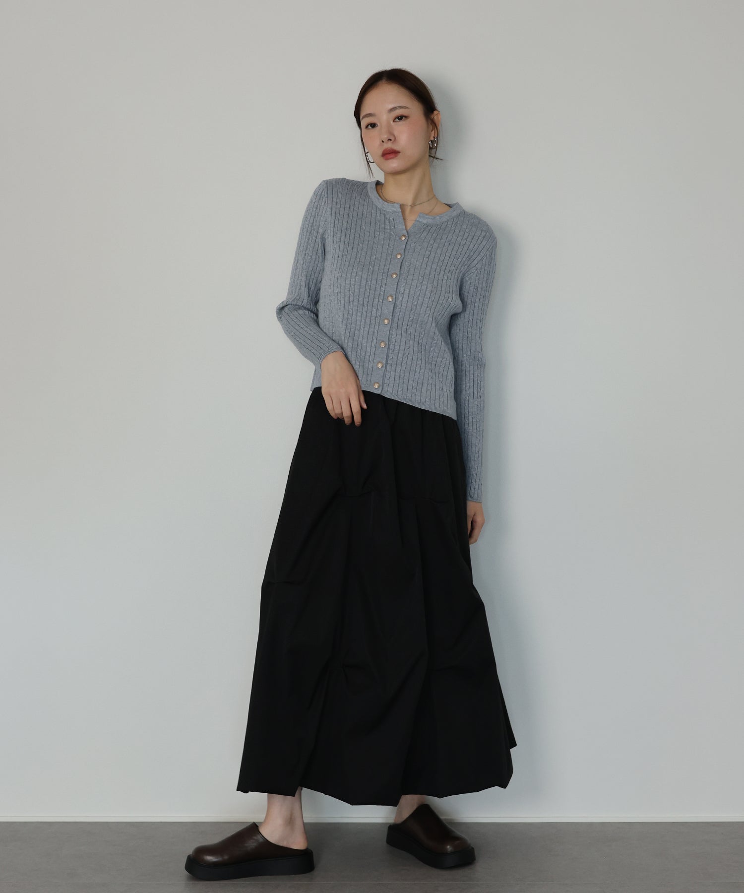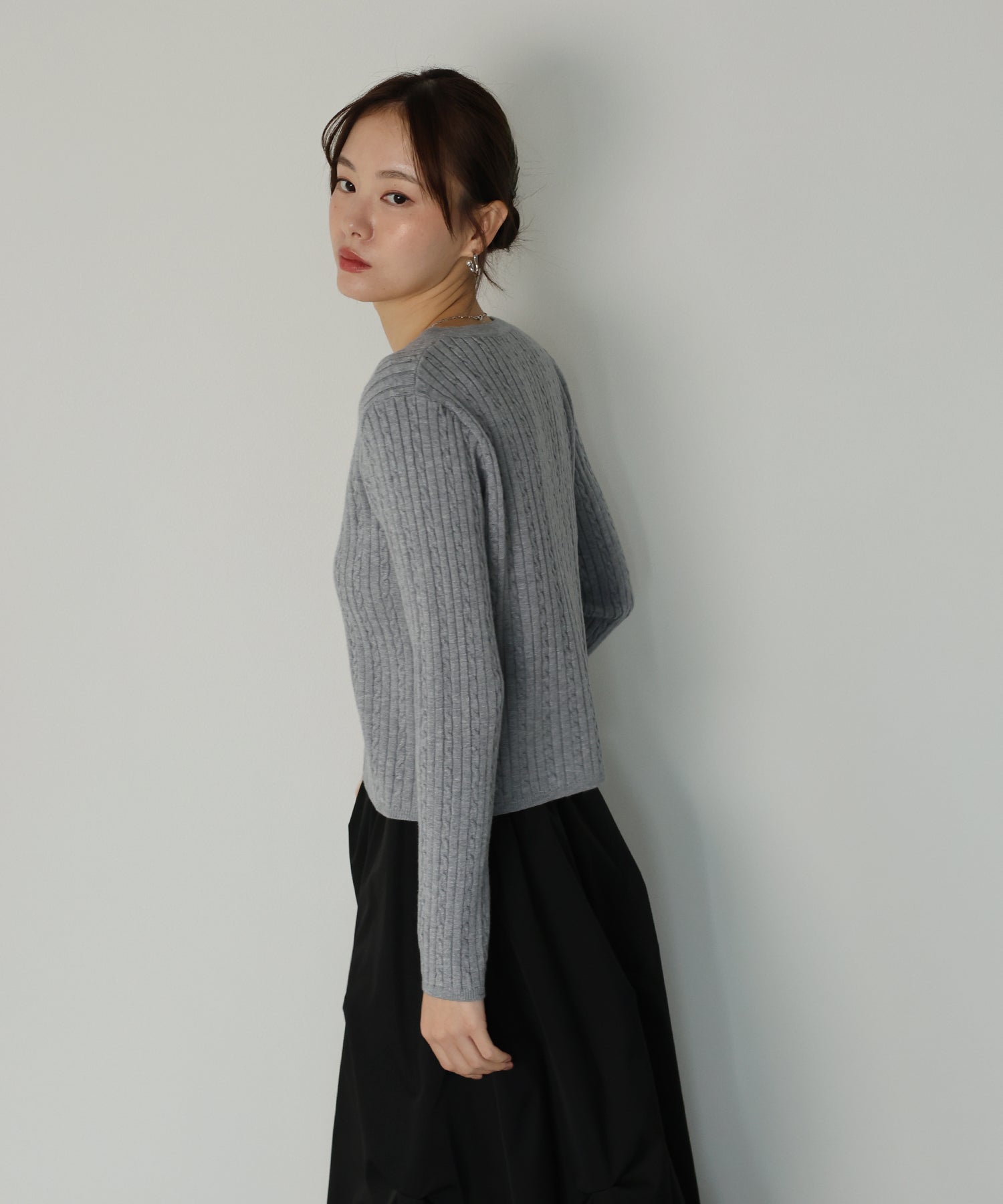 立体感のあるケーブル編みと、上品に輝く金ボタンが目を惹くニットカーディガン。