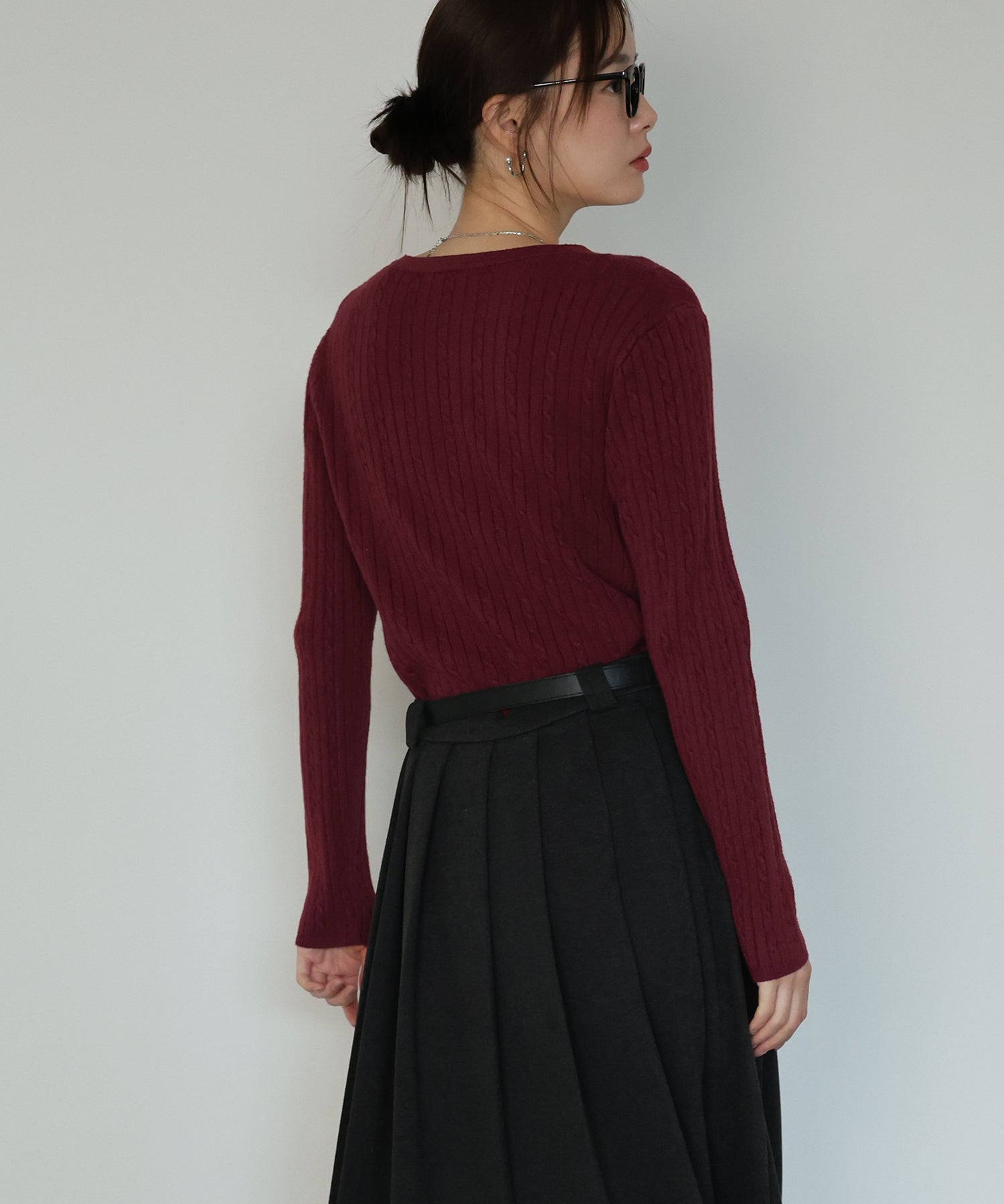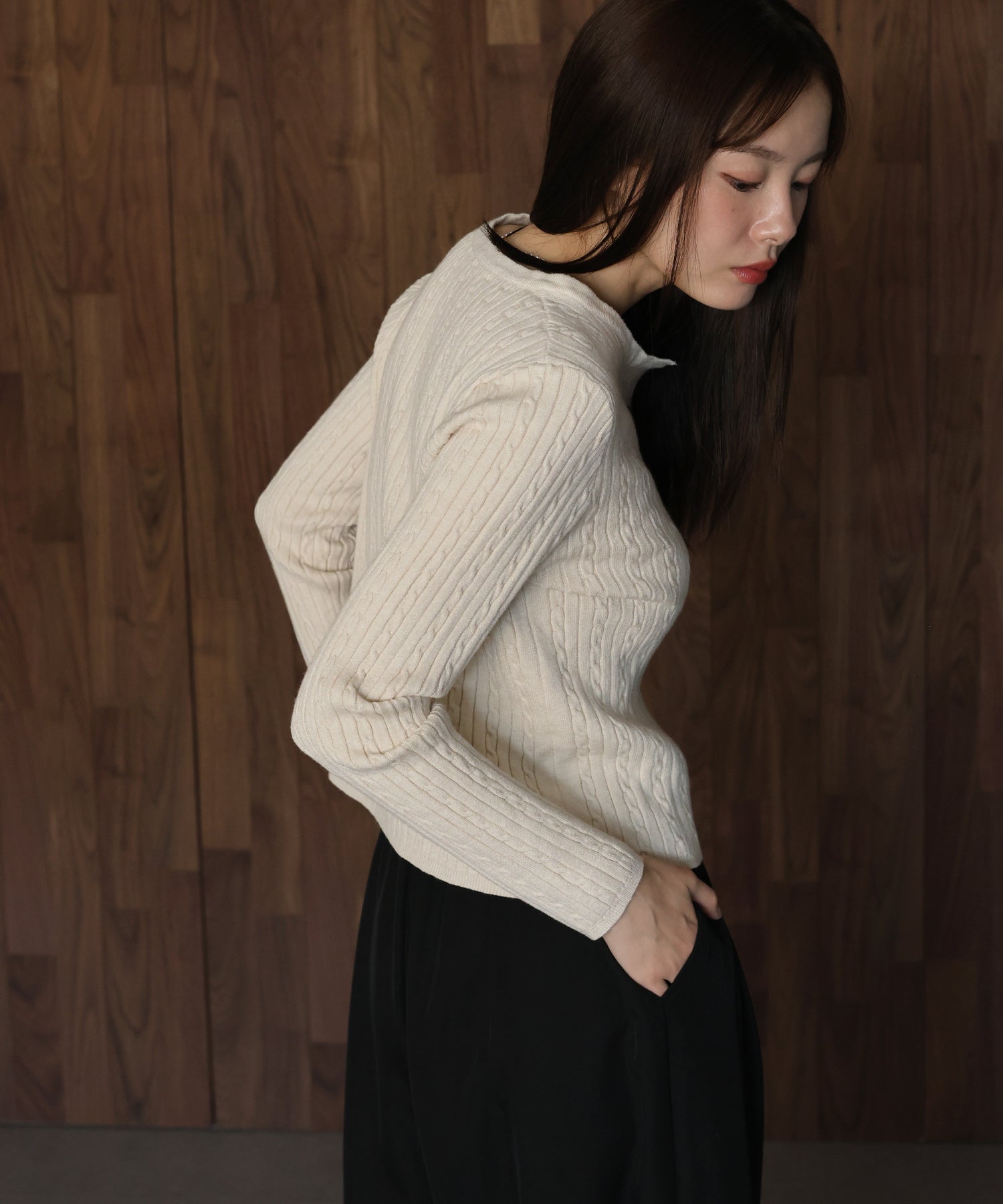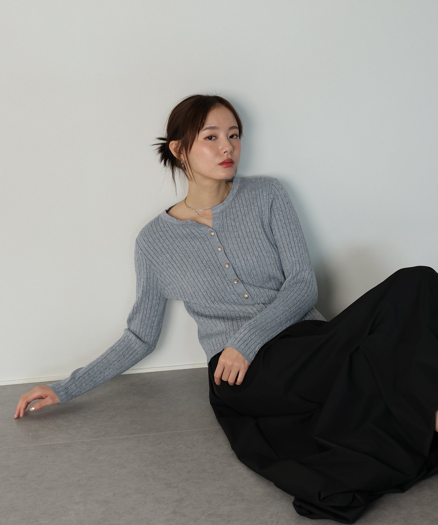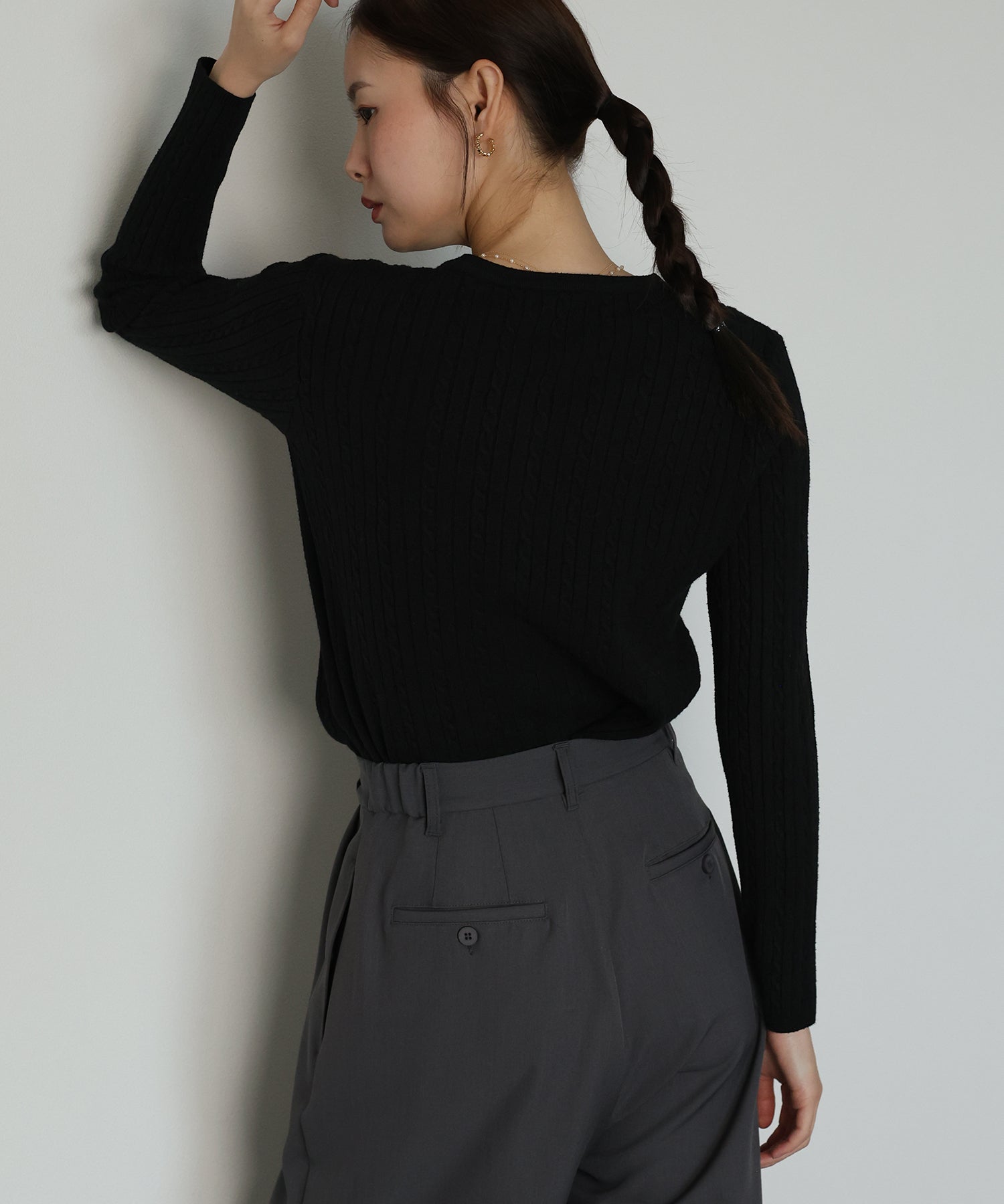 ネックにスリットが入ったようなキーネックで、抜け感のあるデザインに仕上げました。