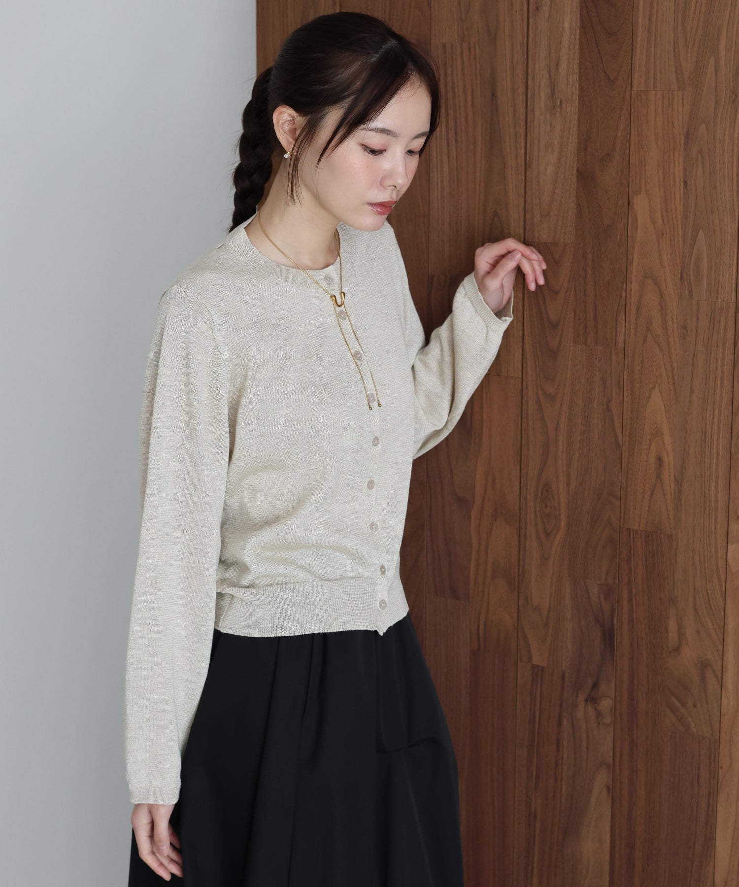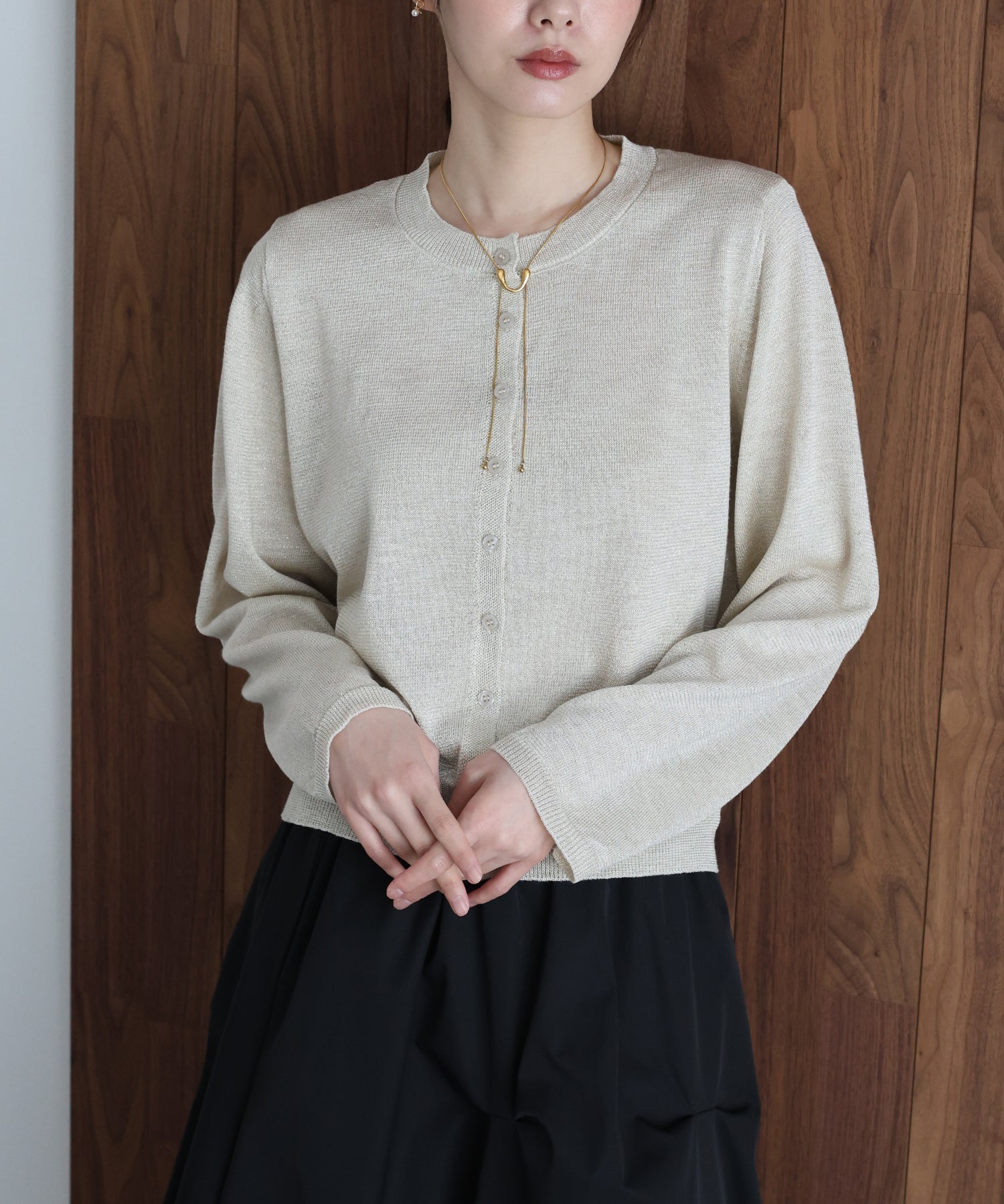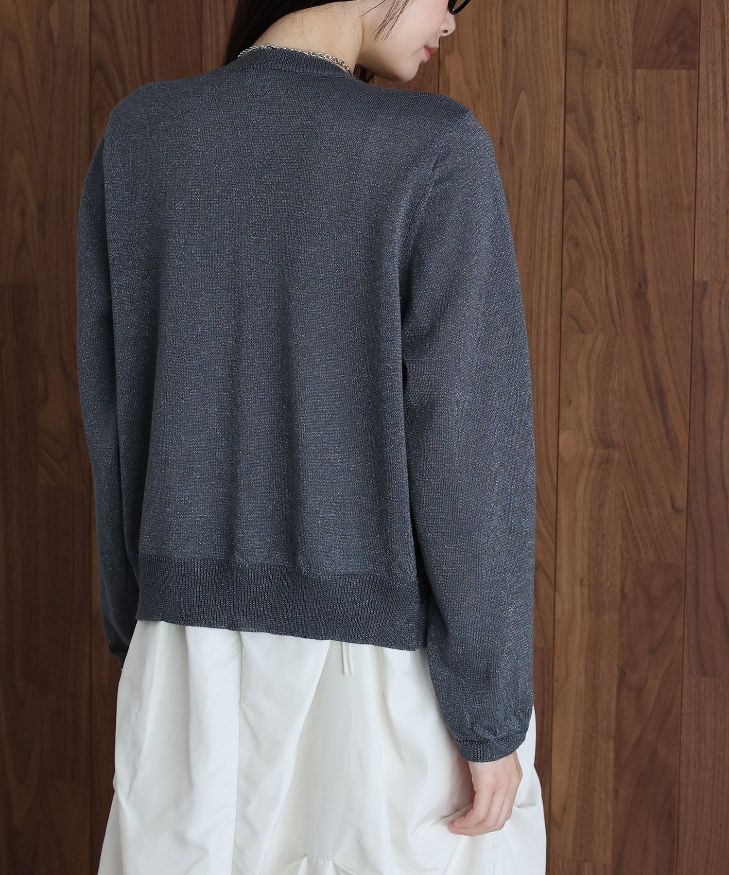 繊細なラメ糸を贅沢に編み込み、動くたびにキラキラと上品に輝く主役級カーディガン。