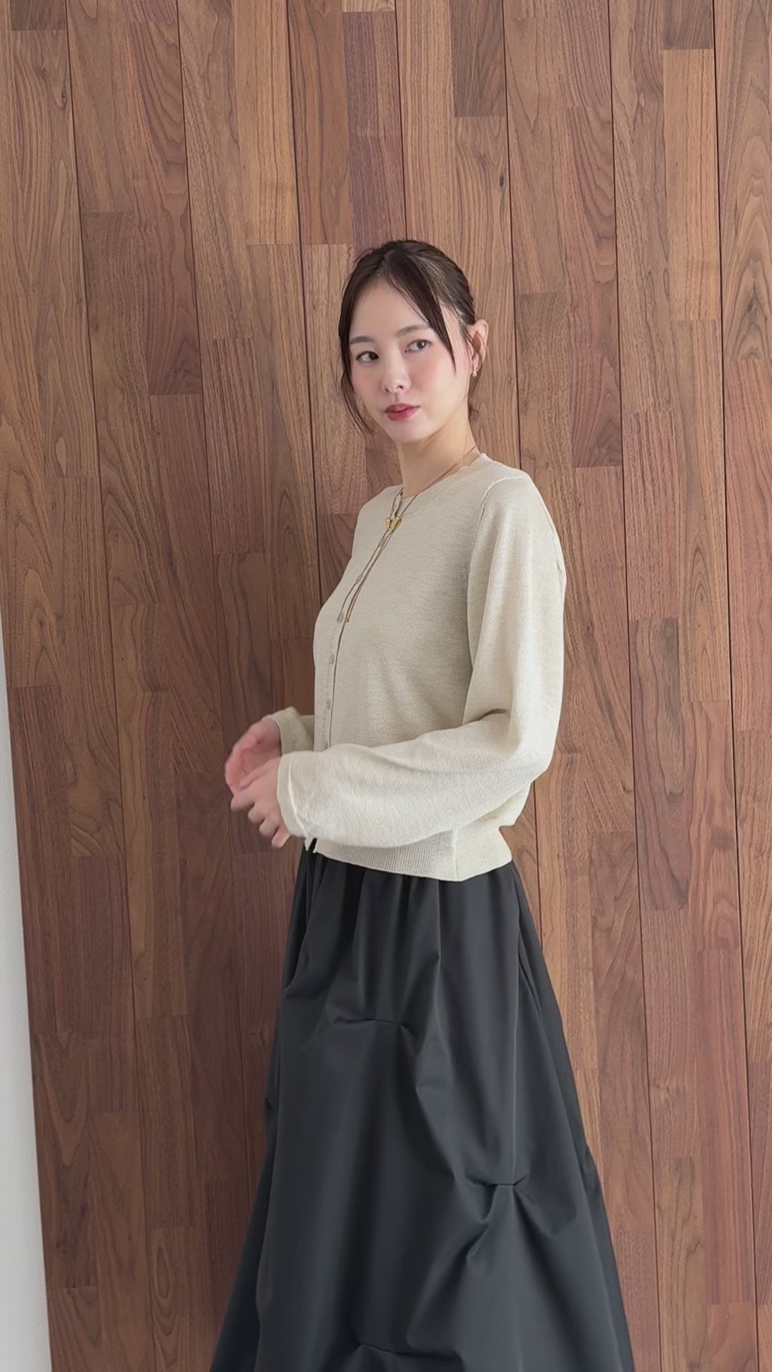 薄手なので、上からジャケットを羽織ってももたつかず、インナーとして煌めきを覗かせるレイヤードスタイルもおすすめです。