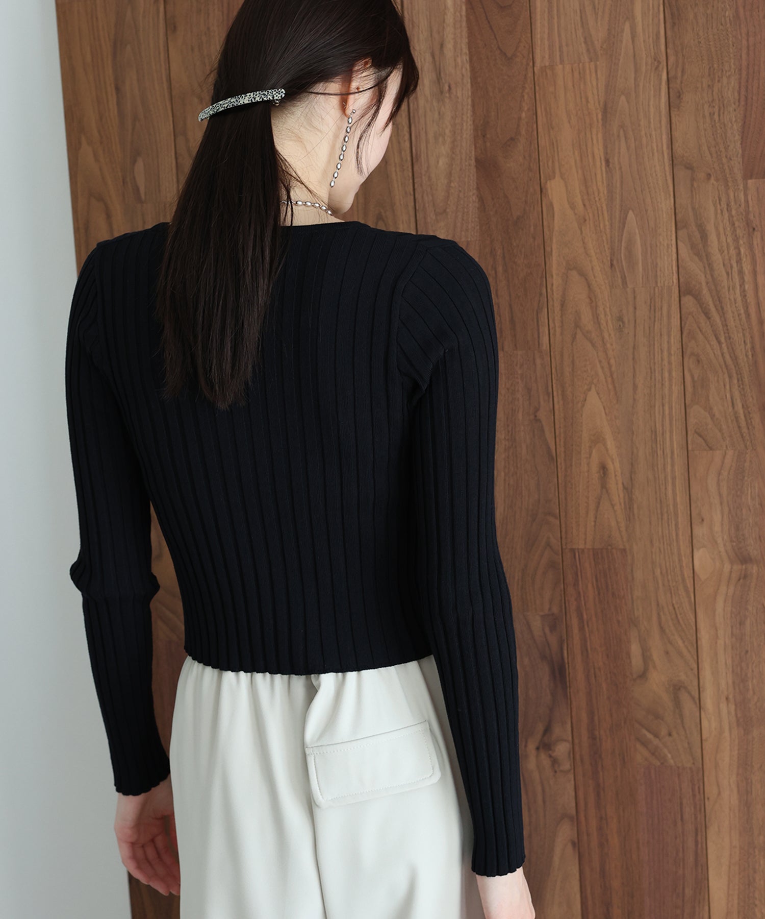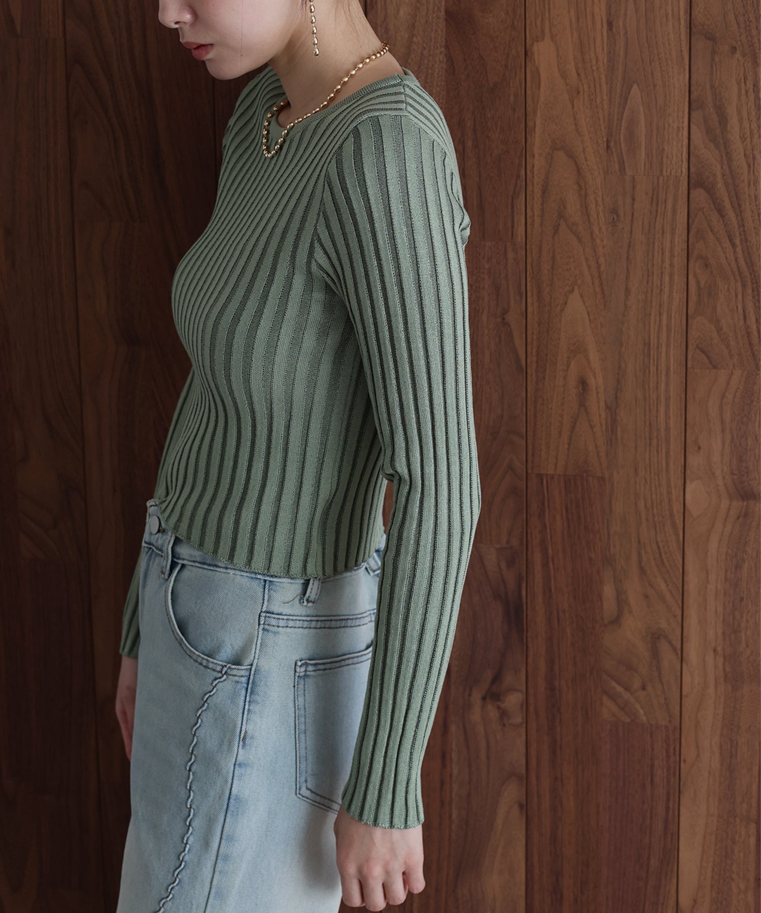 タイトなシルエットがボディラインを美しく描き出す、モダンな表情のリブニットプルオーバー。