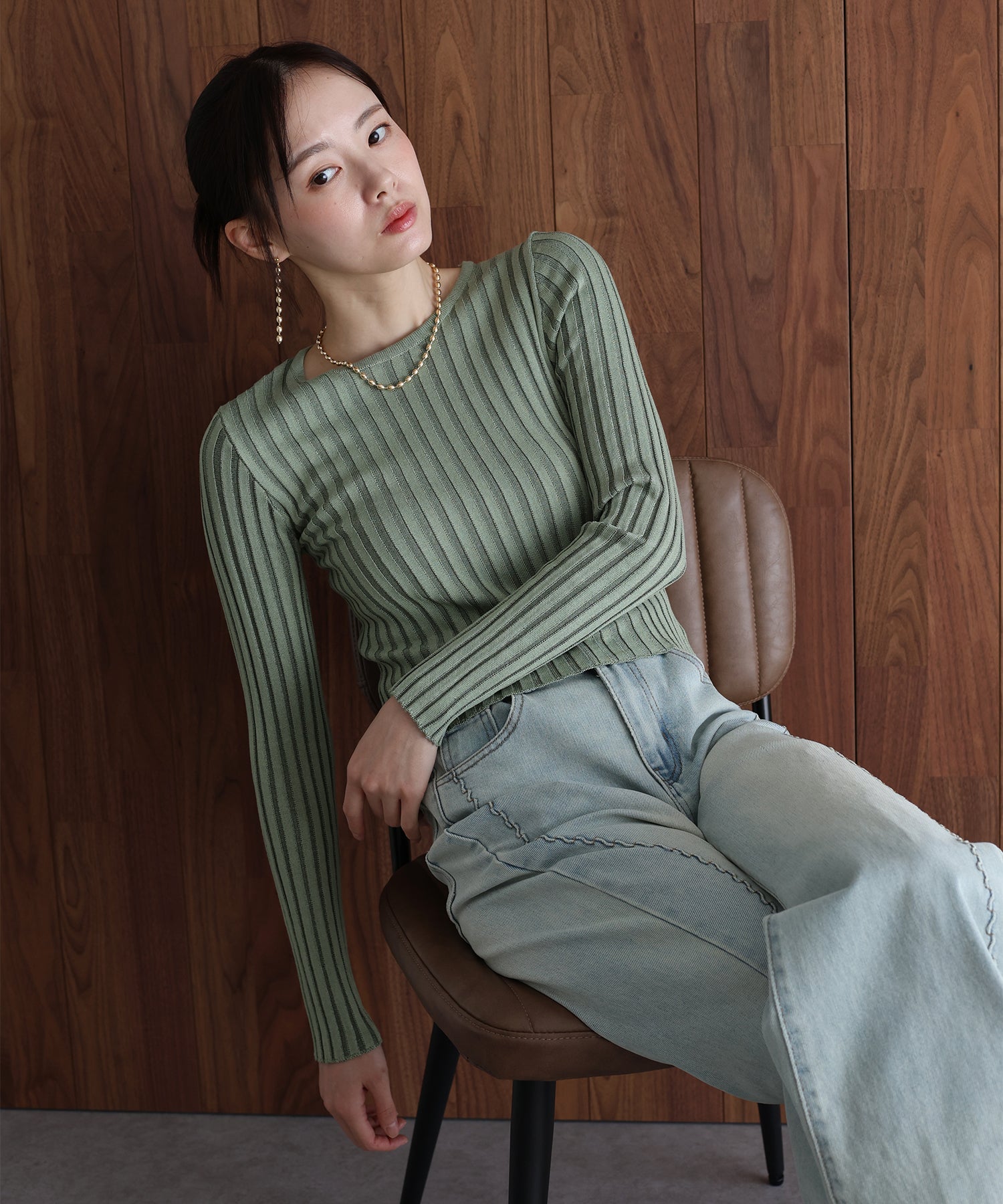 リブ編みが縦のラインを強調し、上半身をすっきりとスマートに見せてくれる着痩せ効果抜群のデザインに仕上げました。