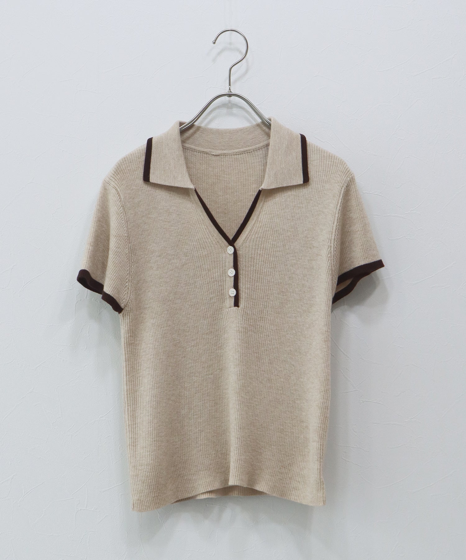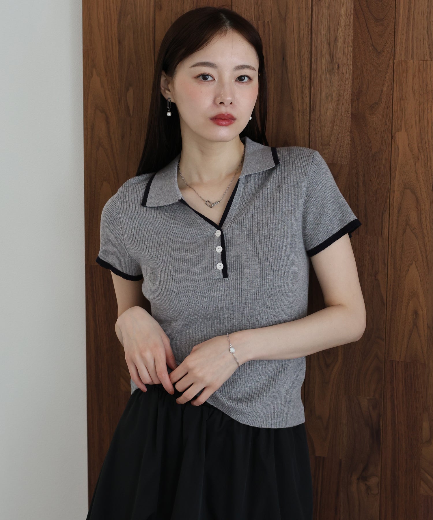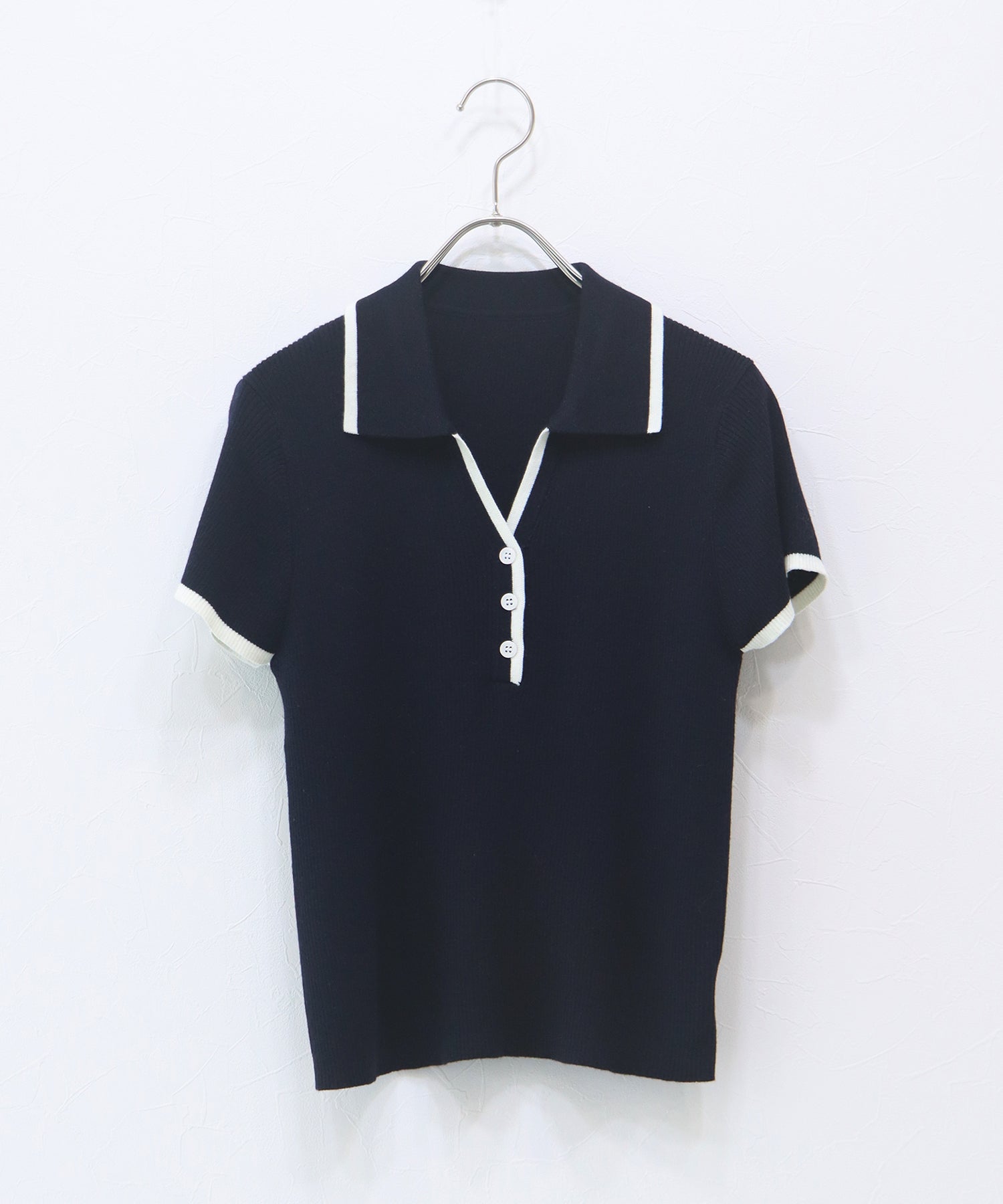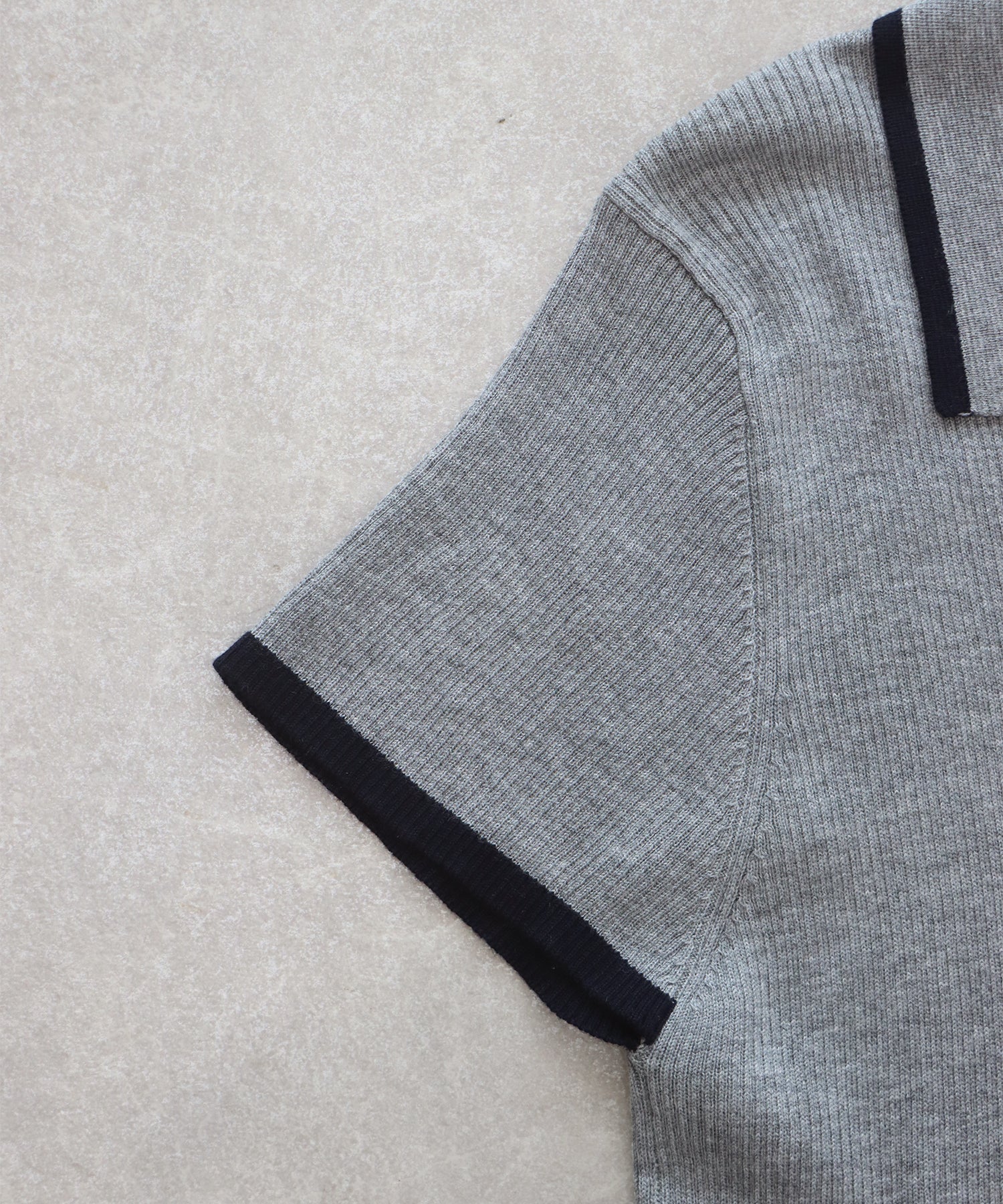 襟元と前立て、袖口に配したバイカラーが、顔周りにクリーンで知的なアクセントを添えるポロニット。