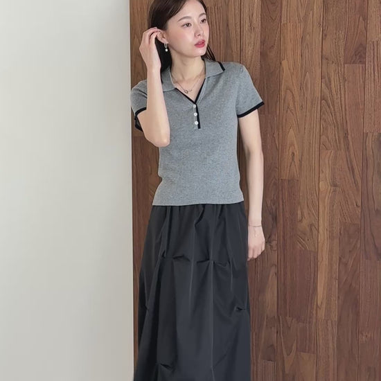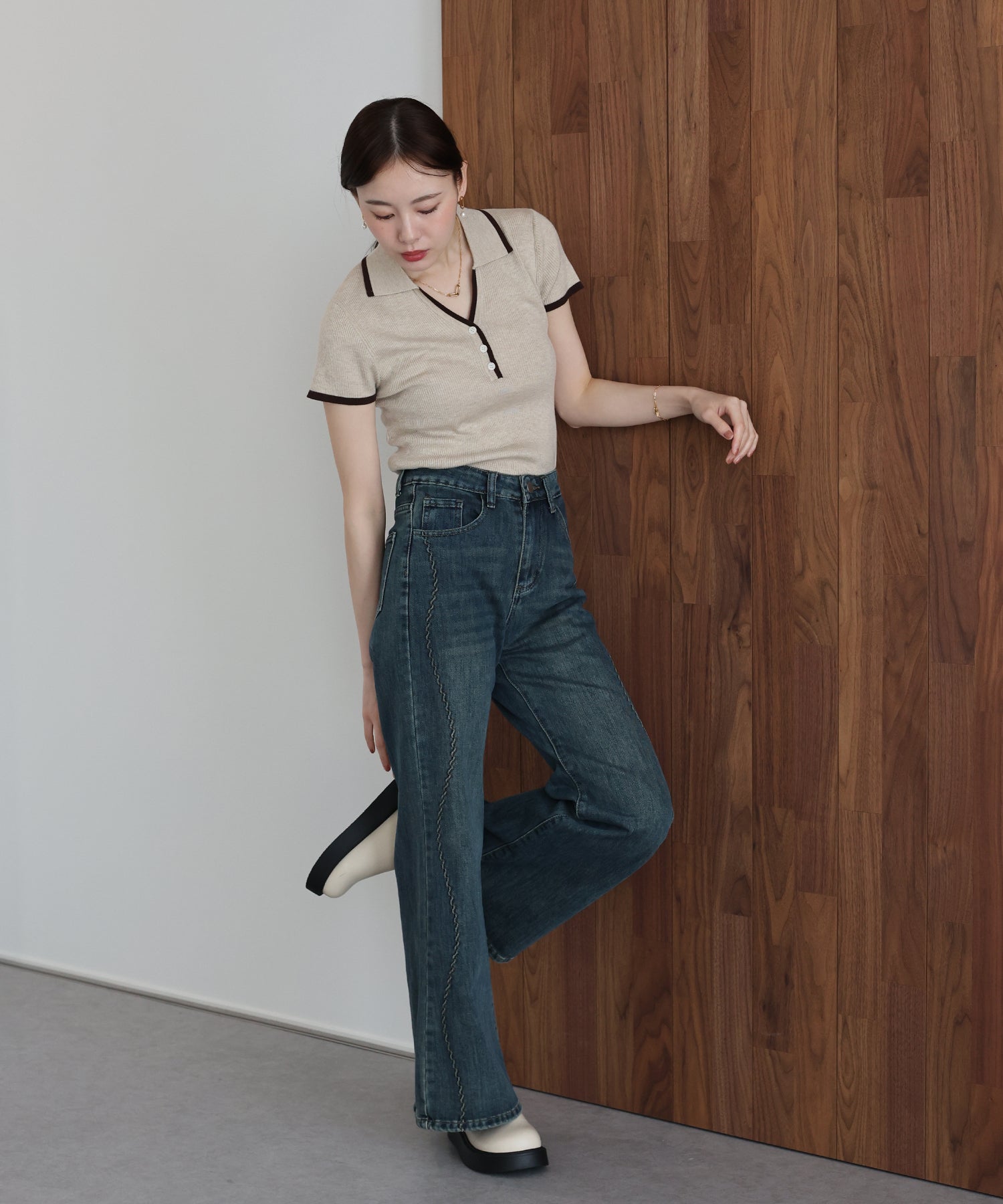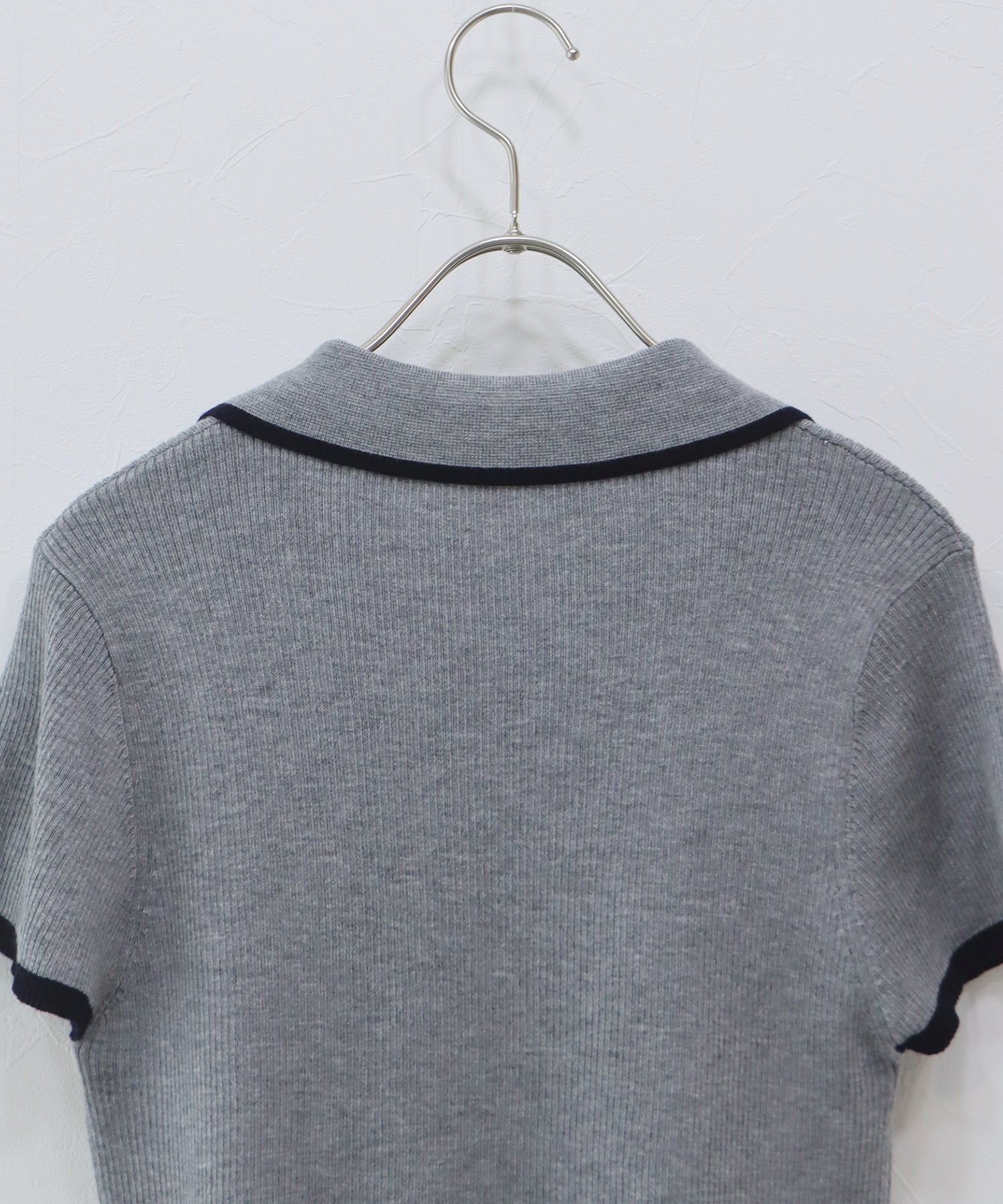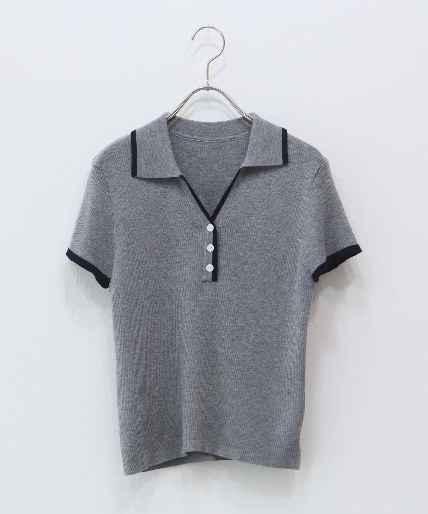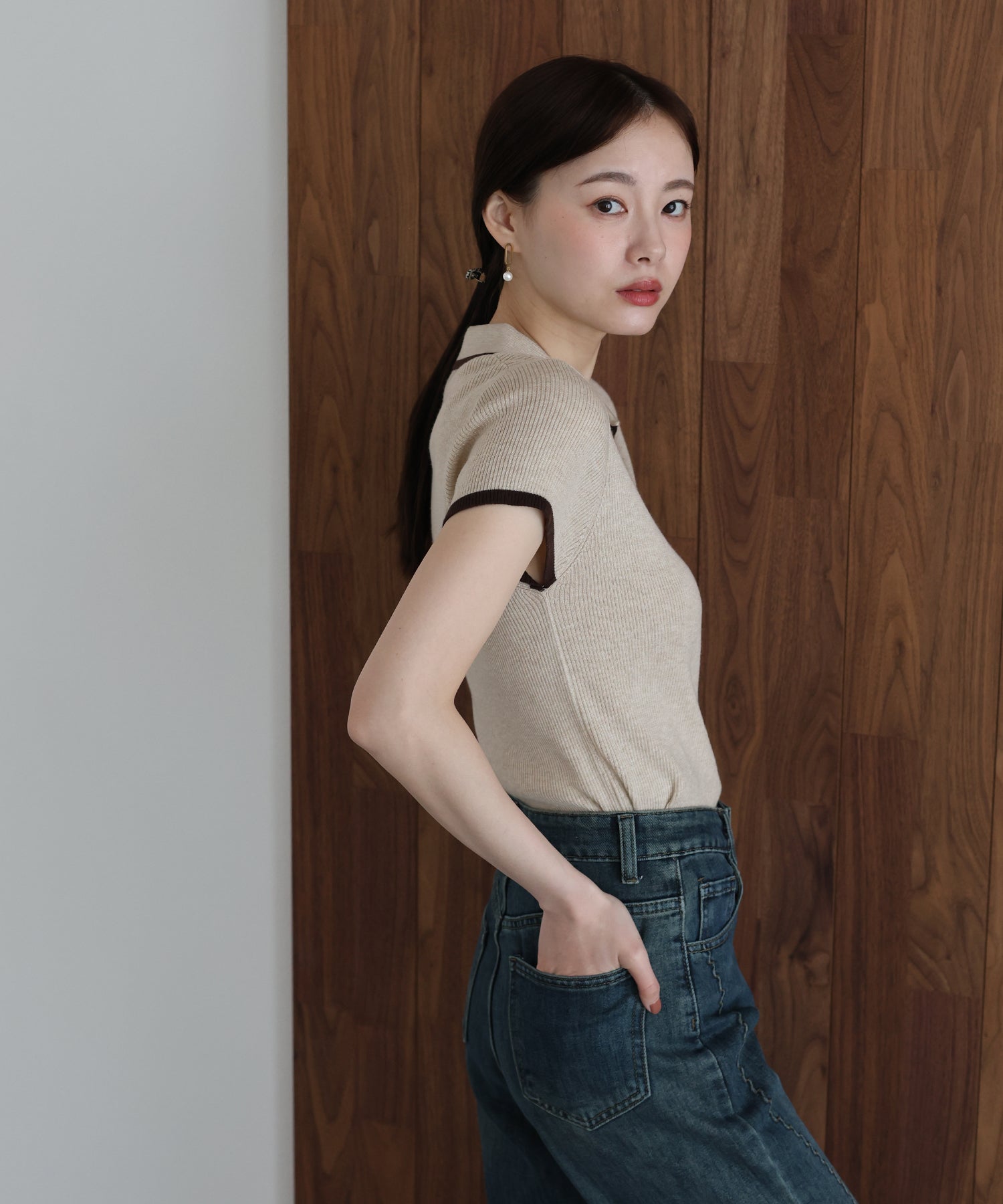 襟元と前立て、袖口に配したバイカラーが、顔周りにクリーンで知的なアクセントを添えるポロニット。
