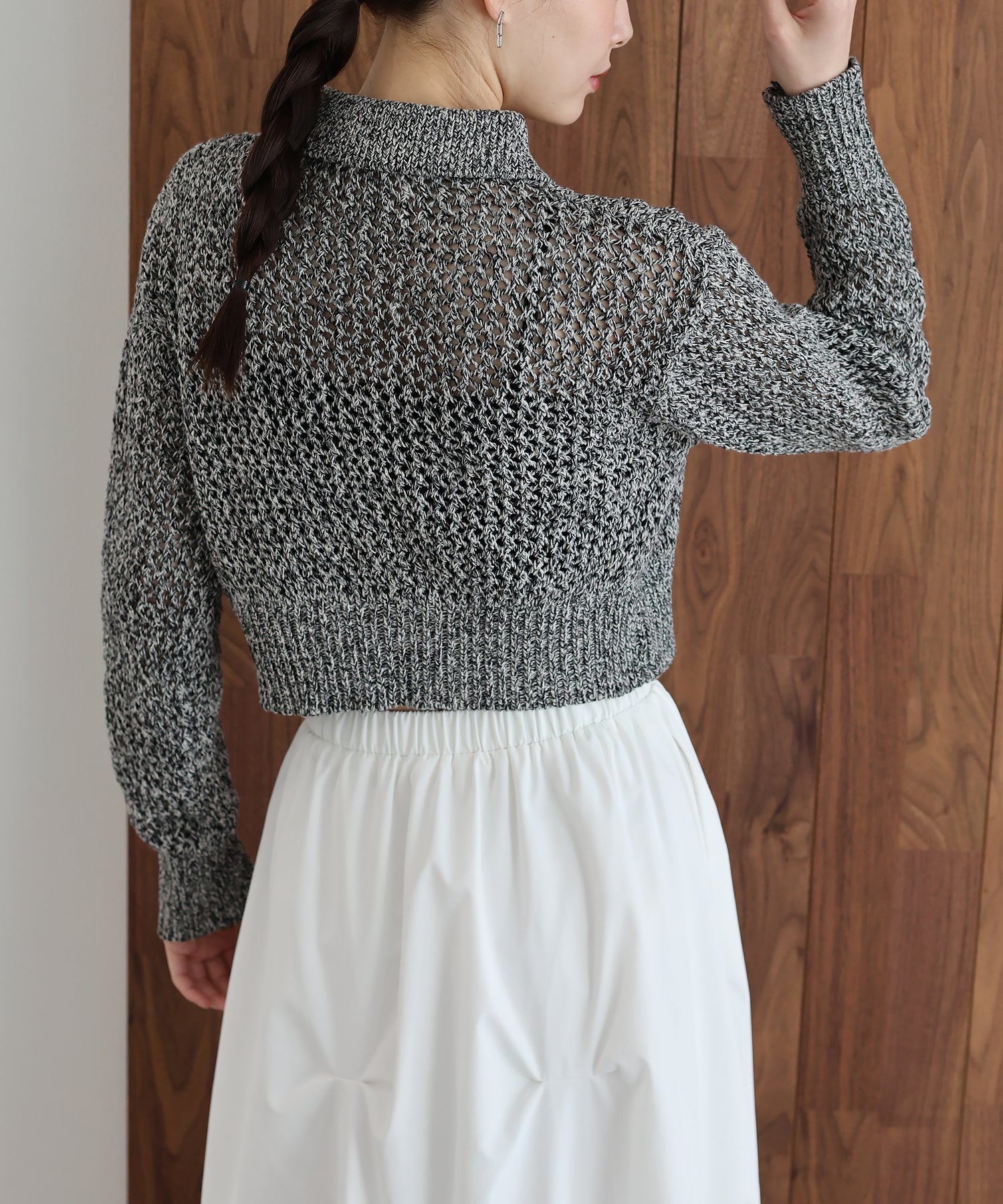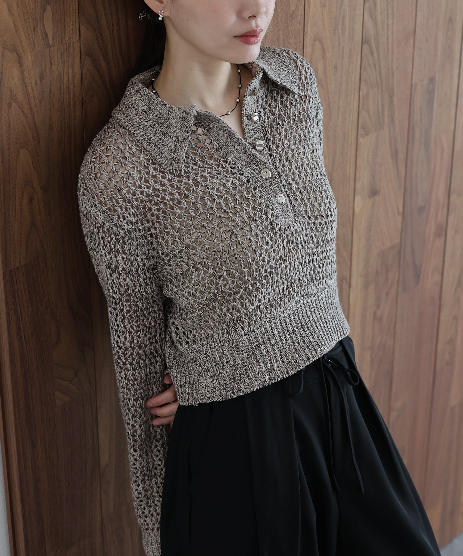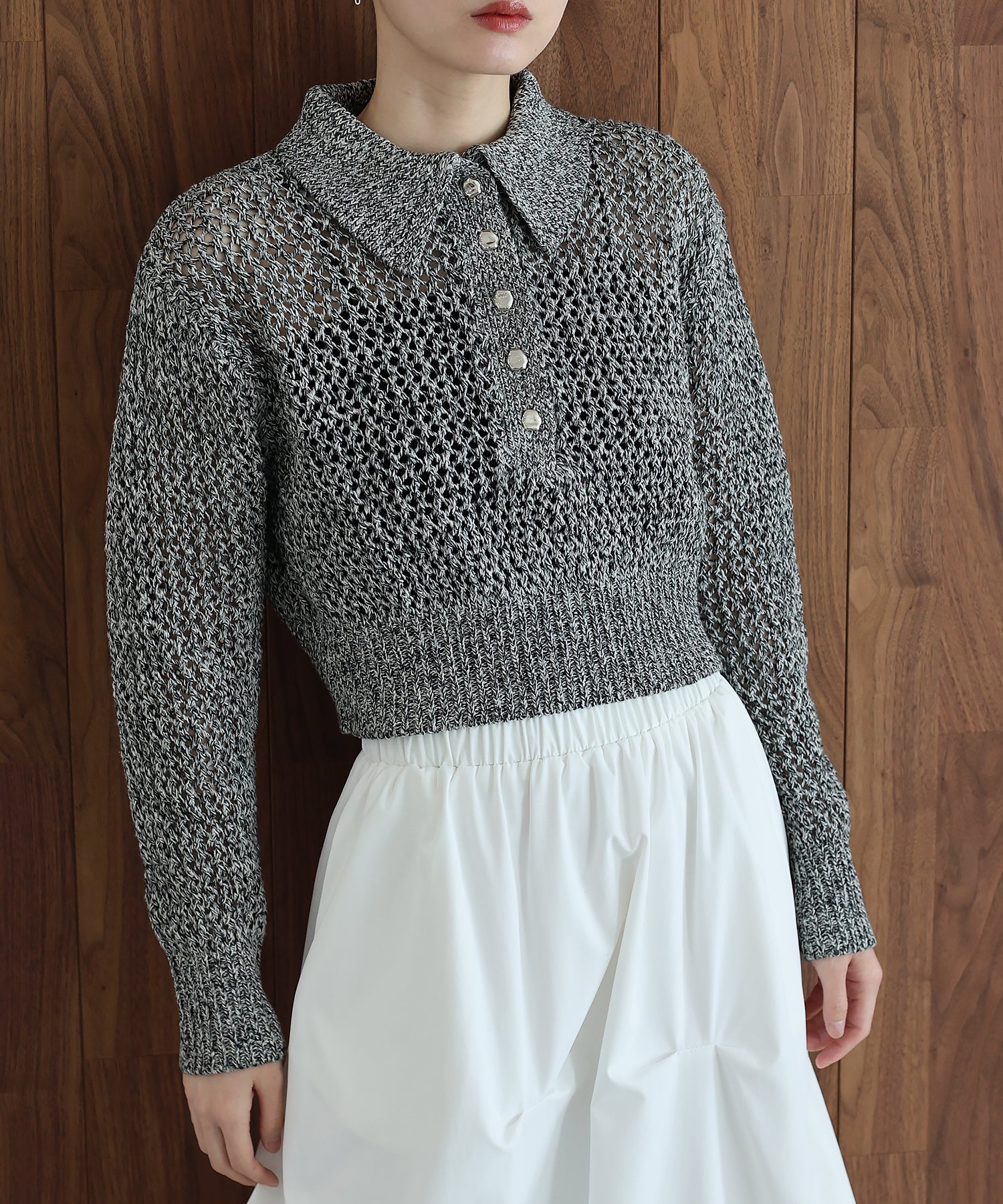 春夏らしいヘルシーな肌見せを叶える、大ぶりなメッシュ編みが目を惹くポロニット。