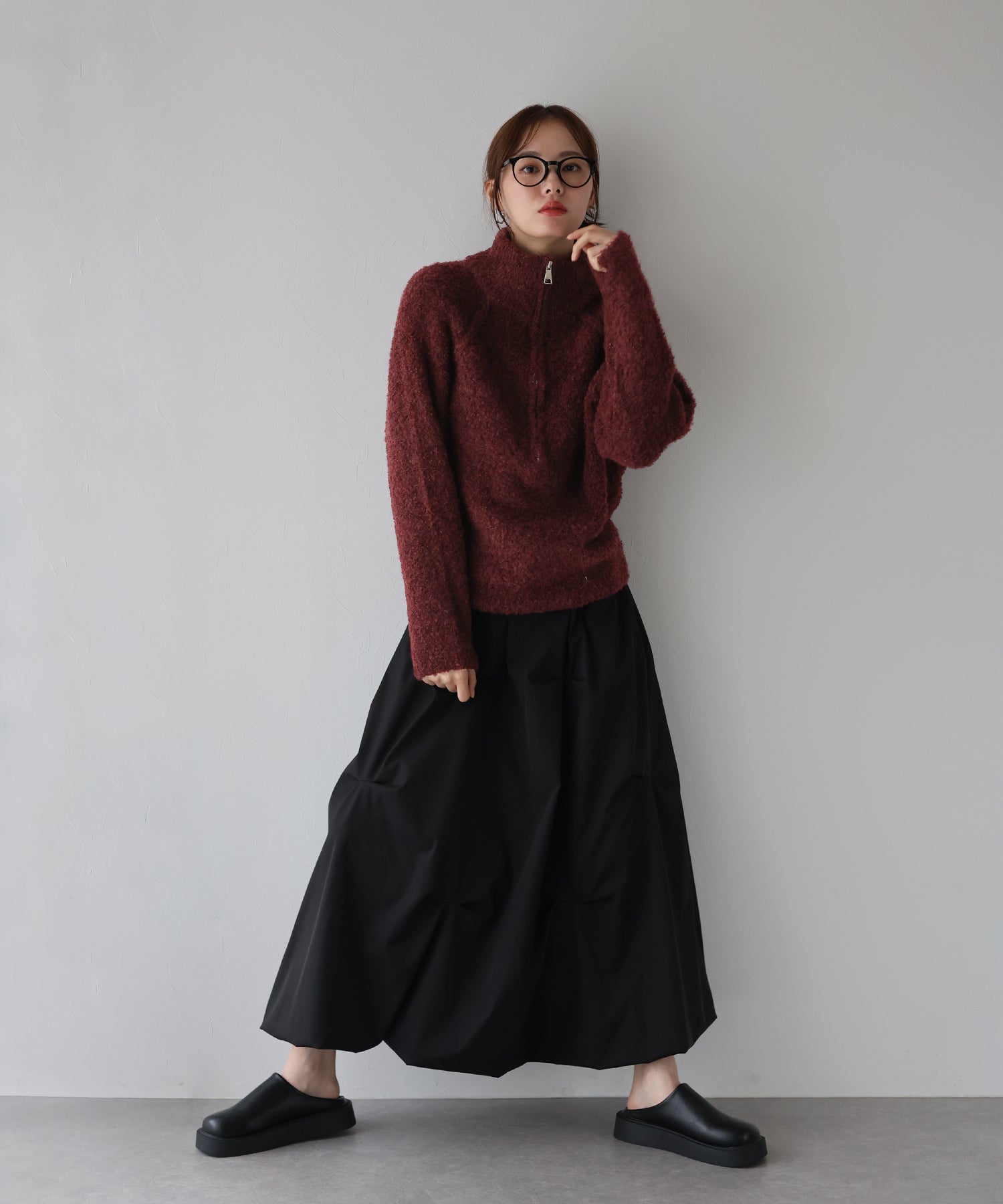 ロングボトム合わせの時は、ジップを開けて抜け感を出すと好バランス。