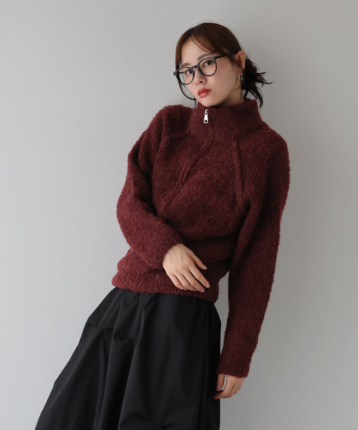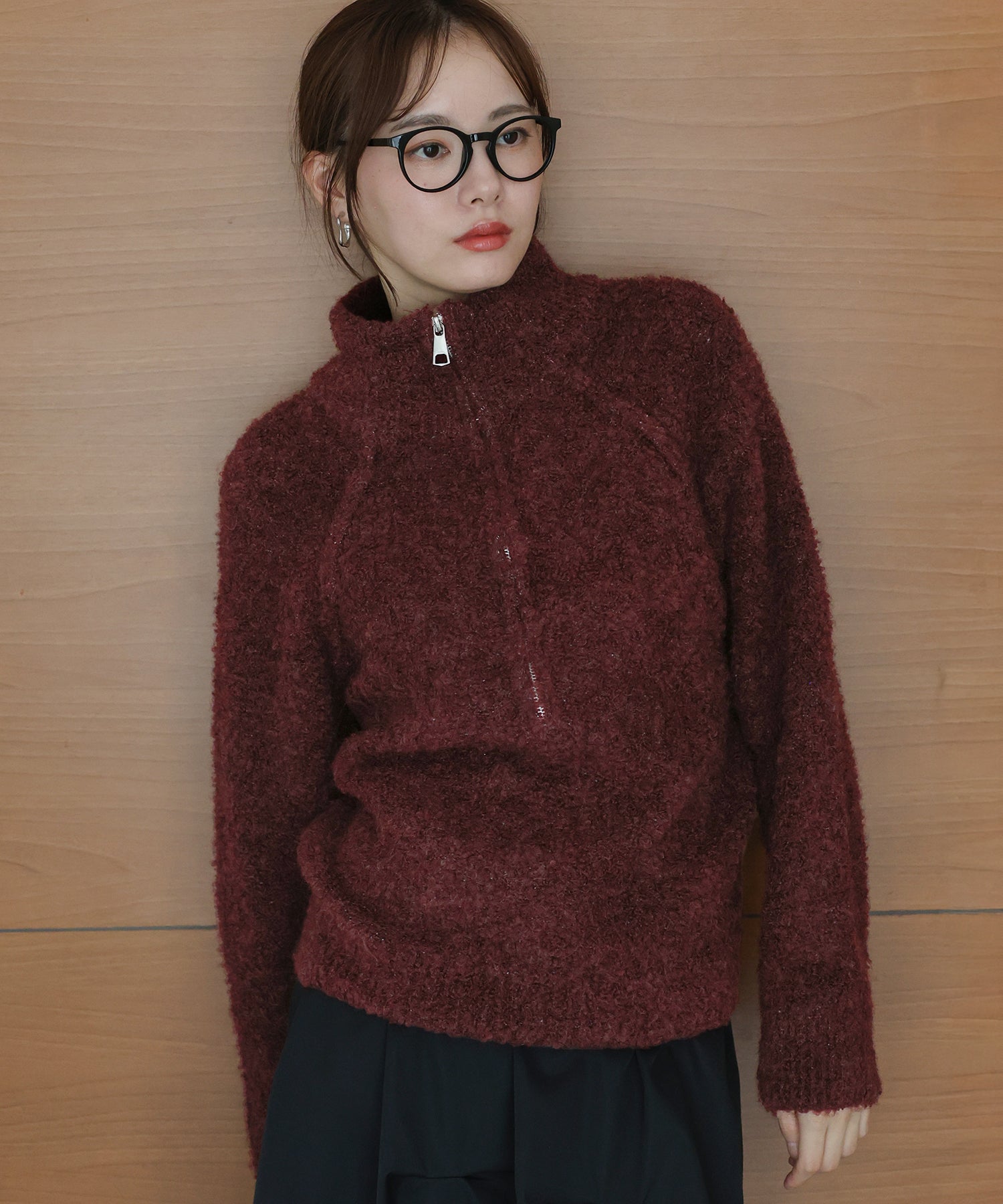 ミックス糸を使用した絶妙な風合いが着映えするハーフジップアップブークレニット。