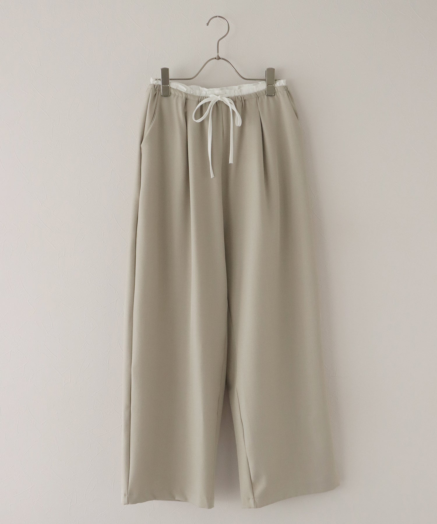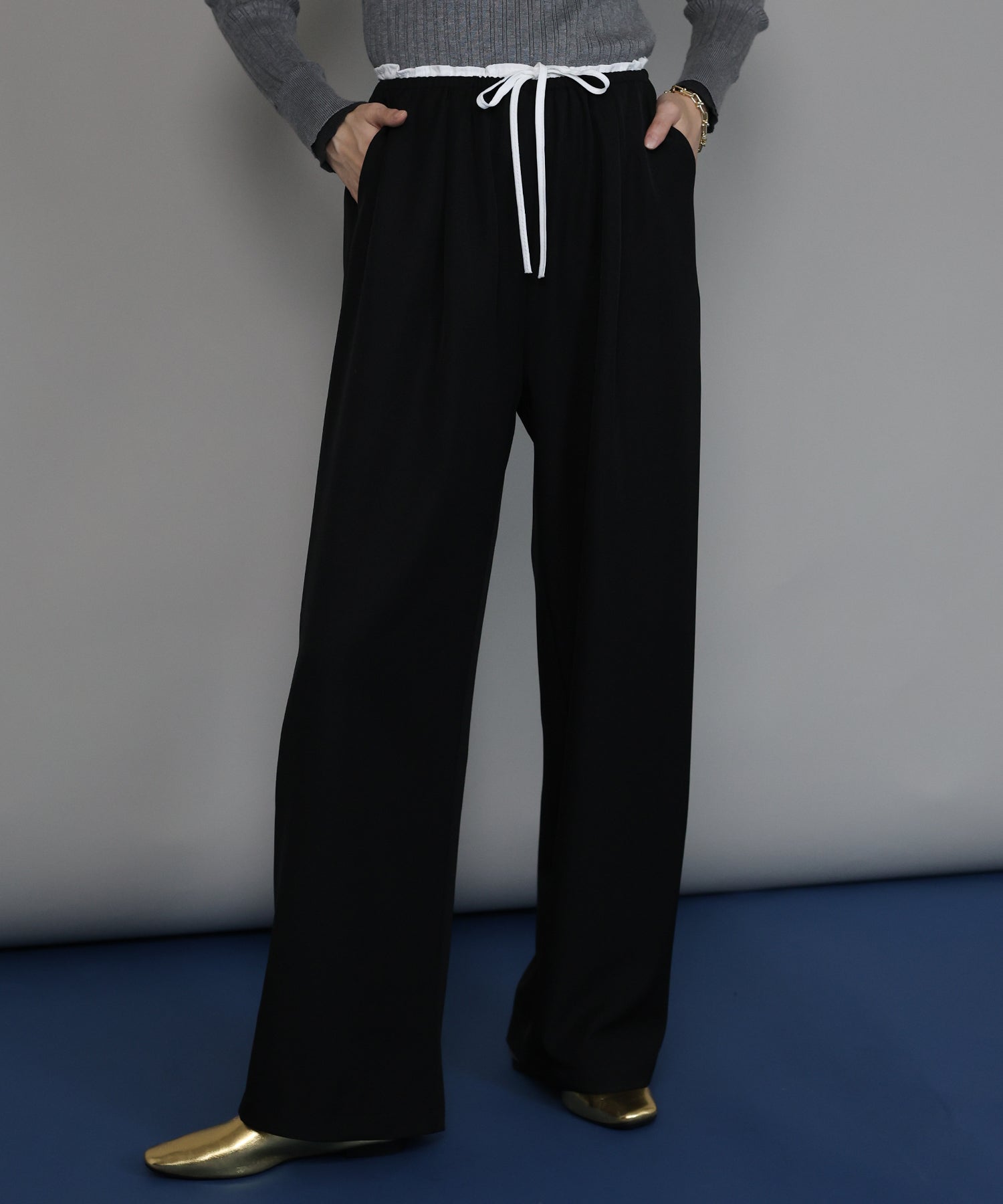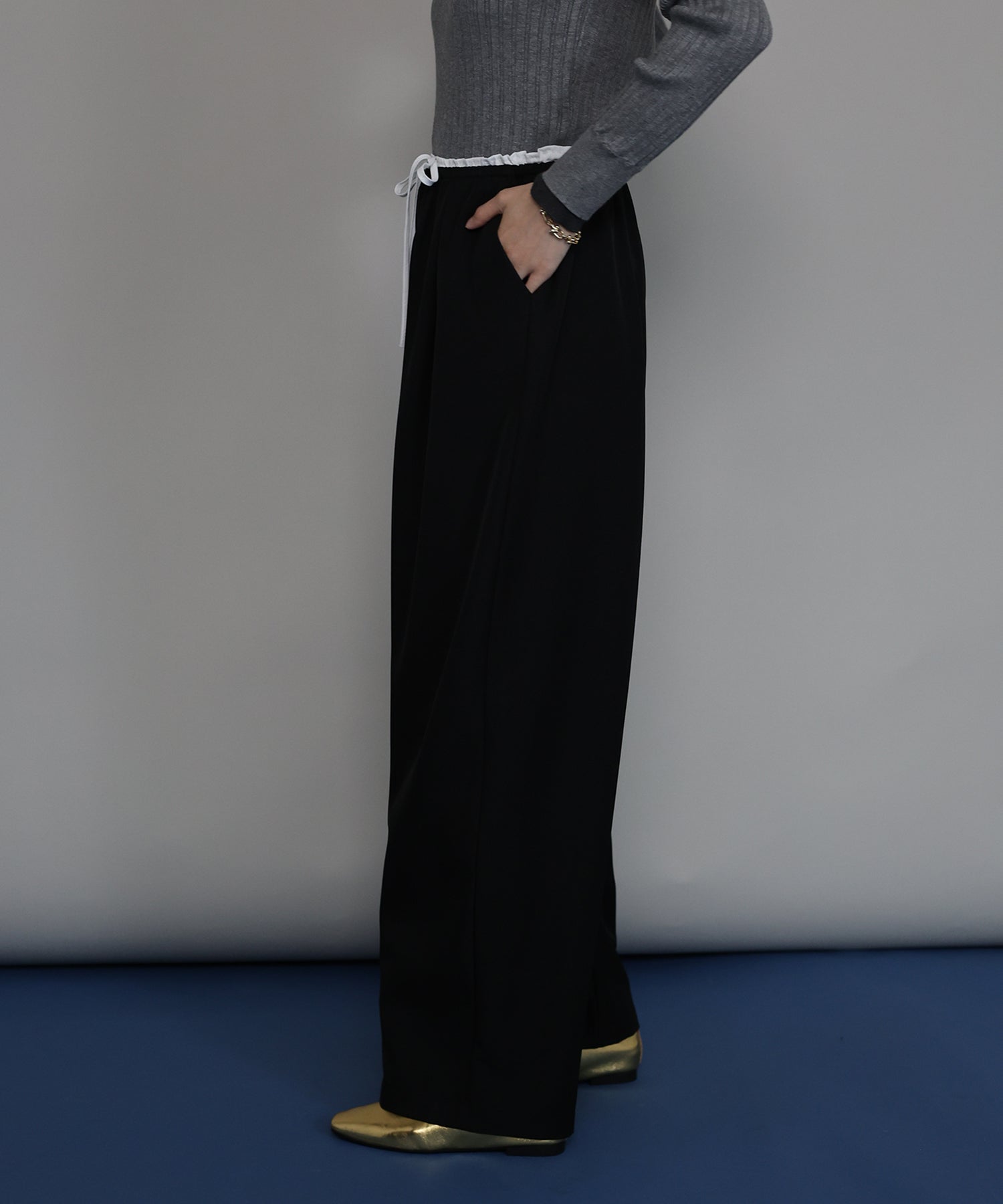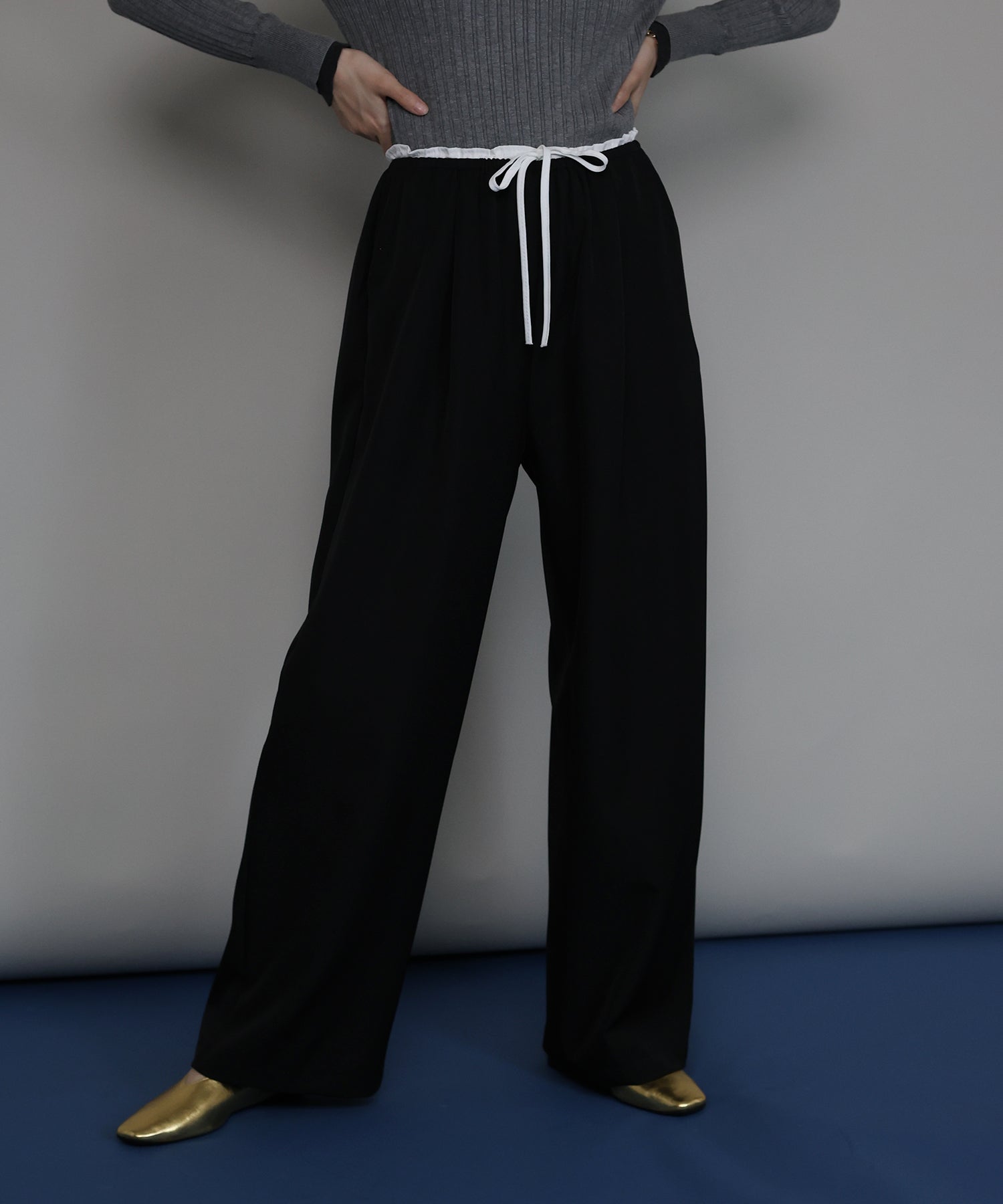 ウエストのレイヤード風デザインに、リボンをあしらったトレンド感溢れるスラックス。