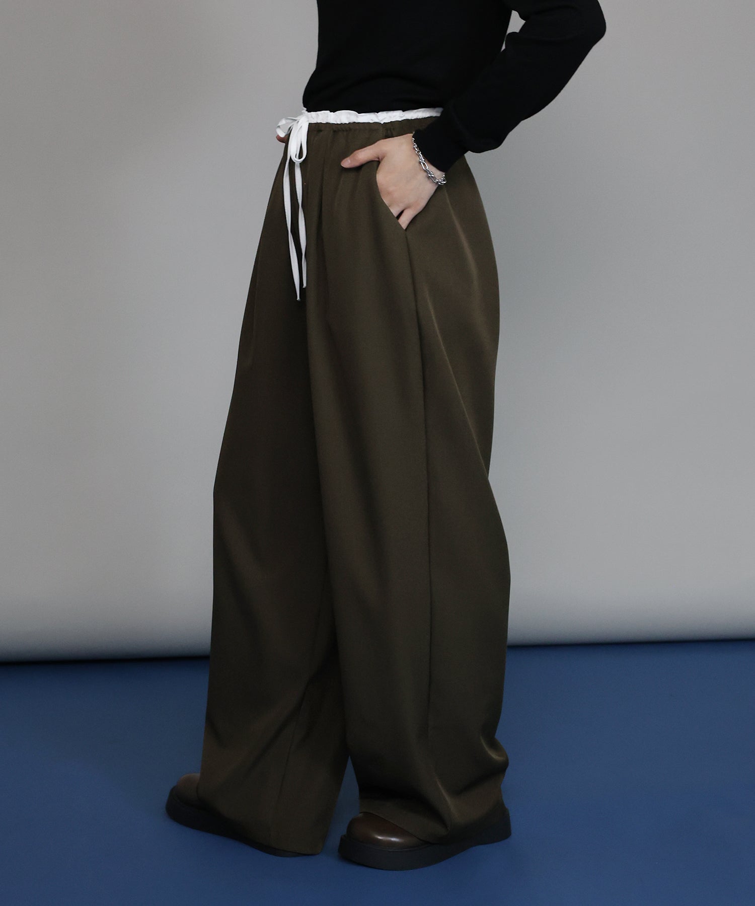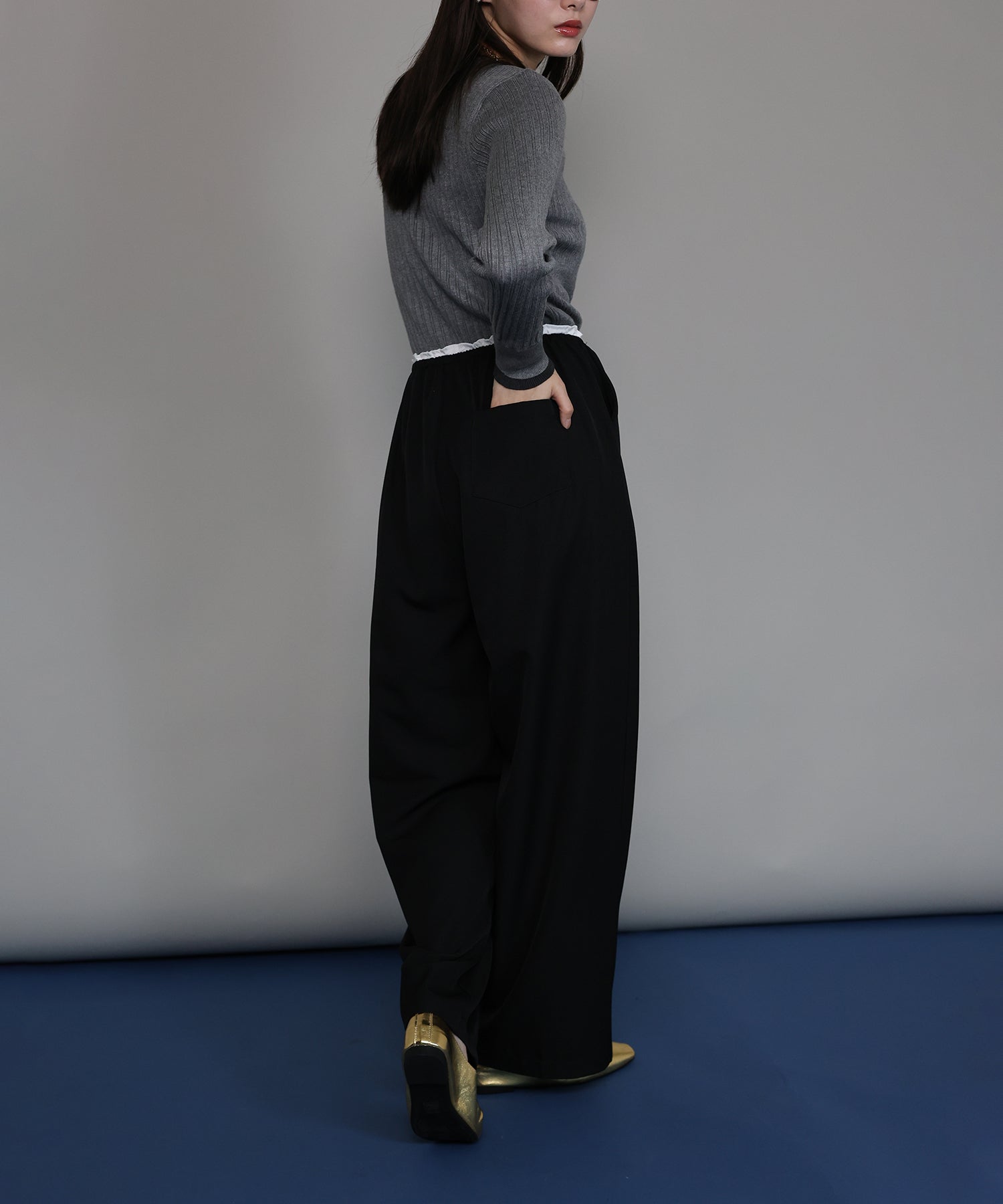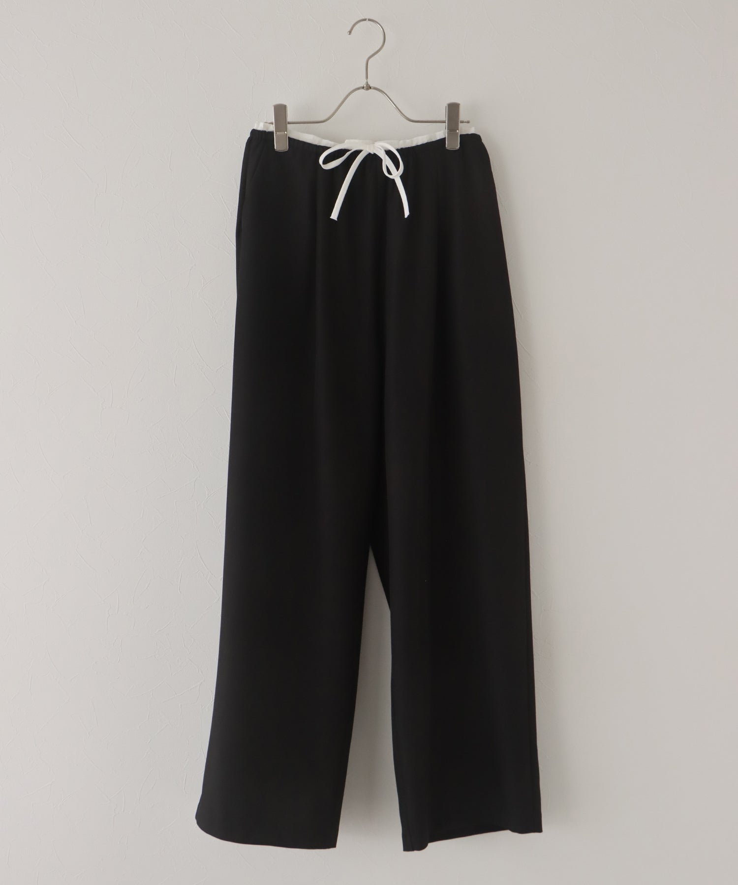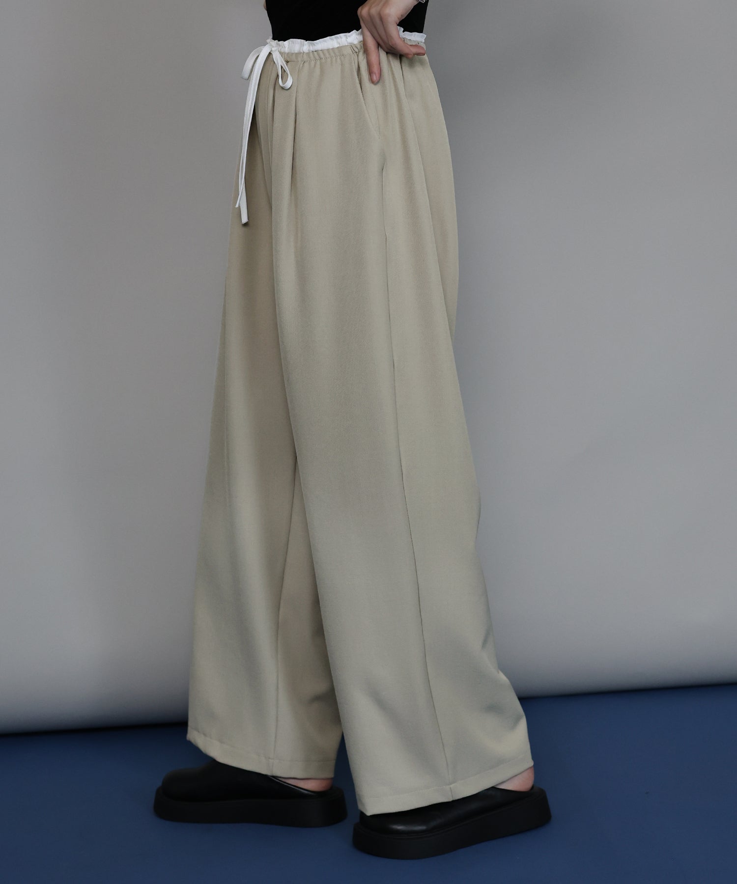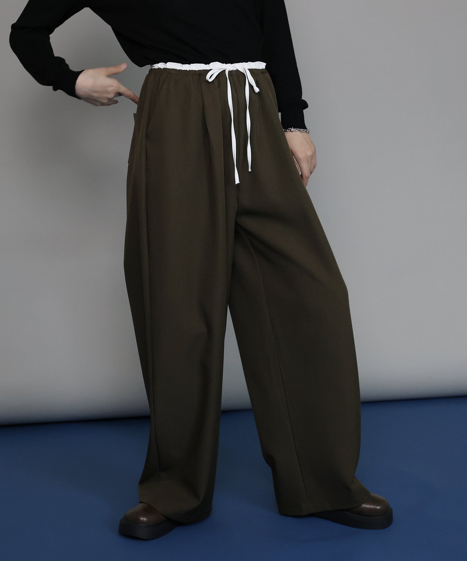 ウエストのレイヤード風デザインに、リボンをあしらったトレンド感溢れるスラックス。