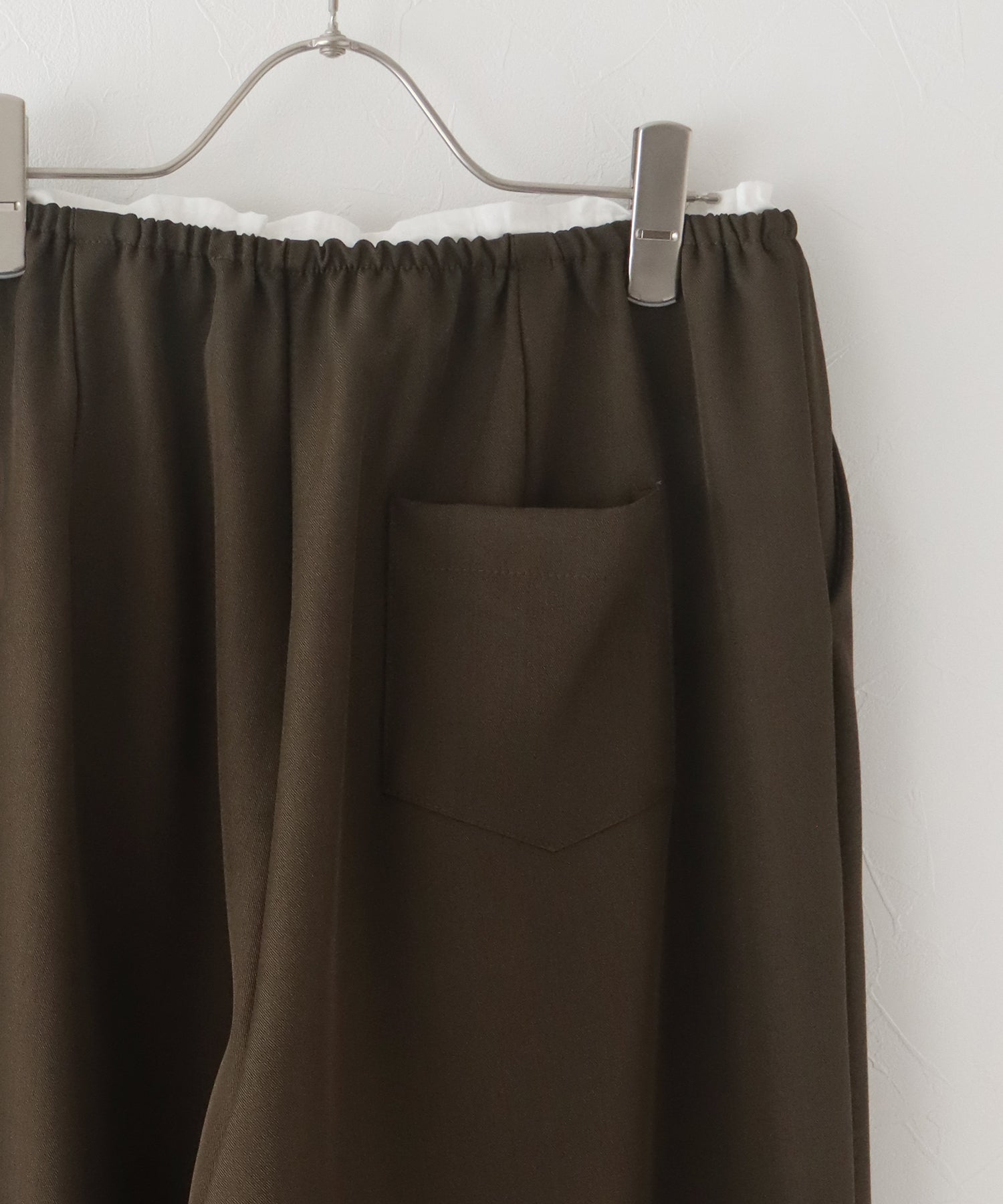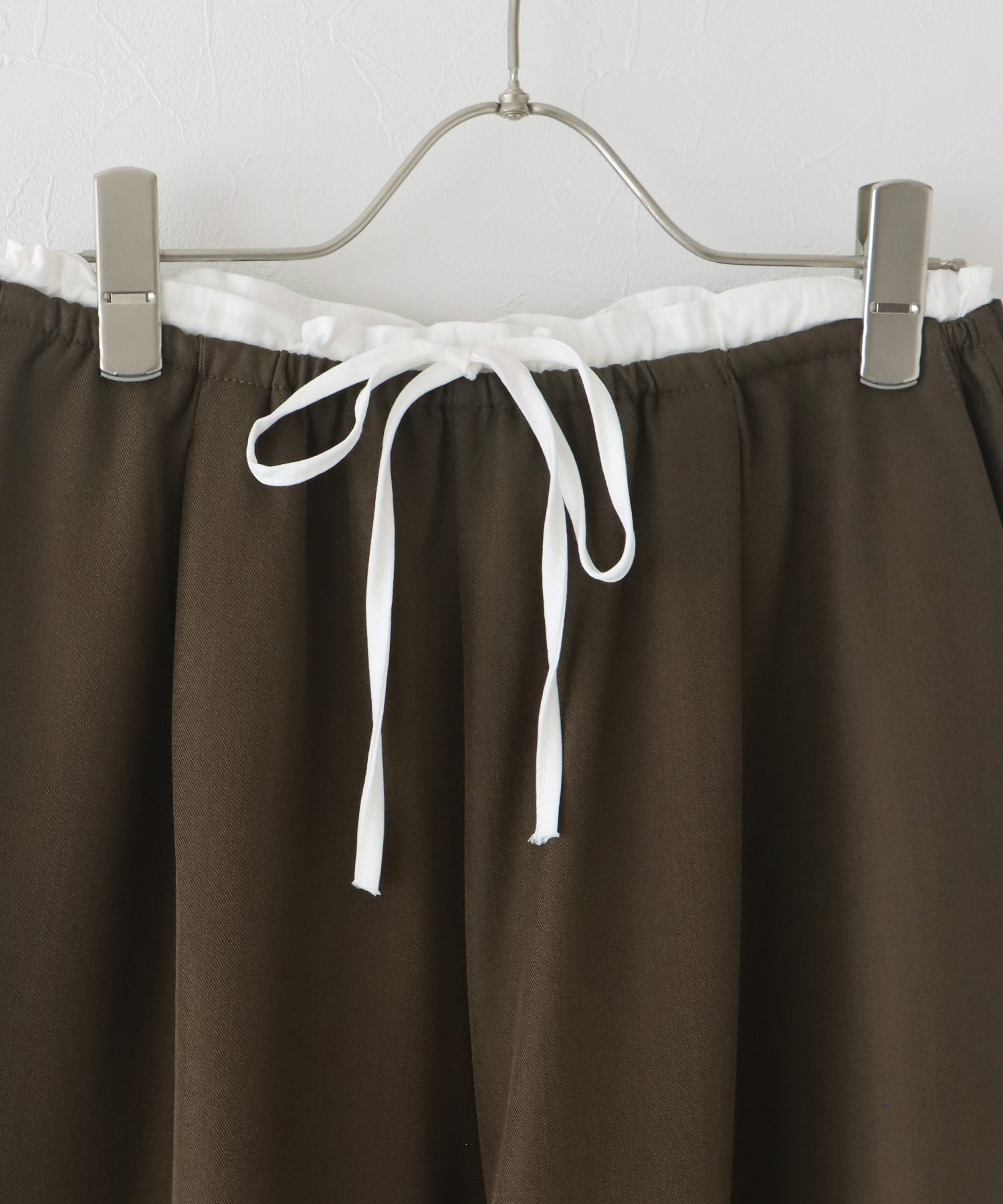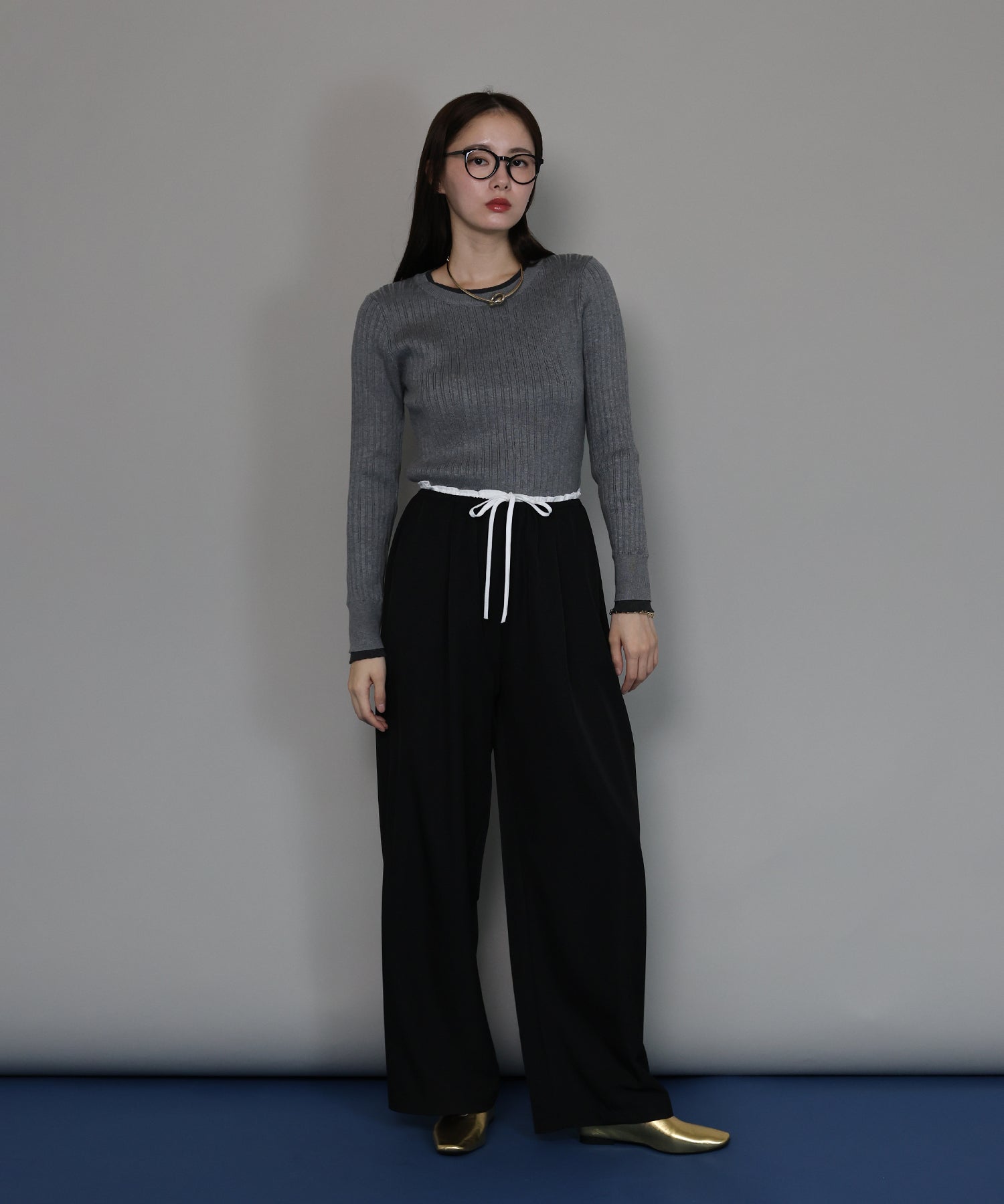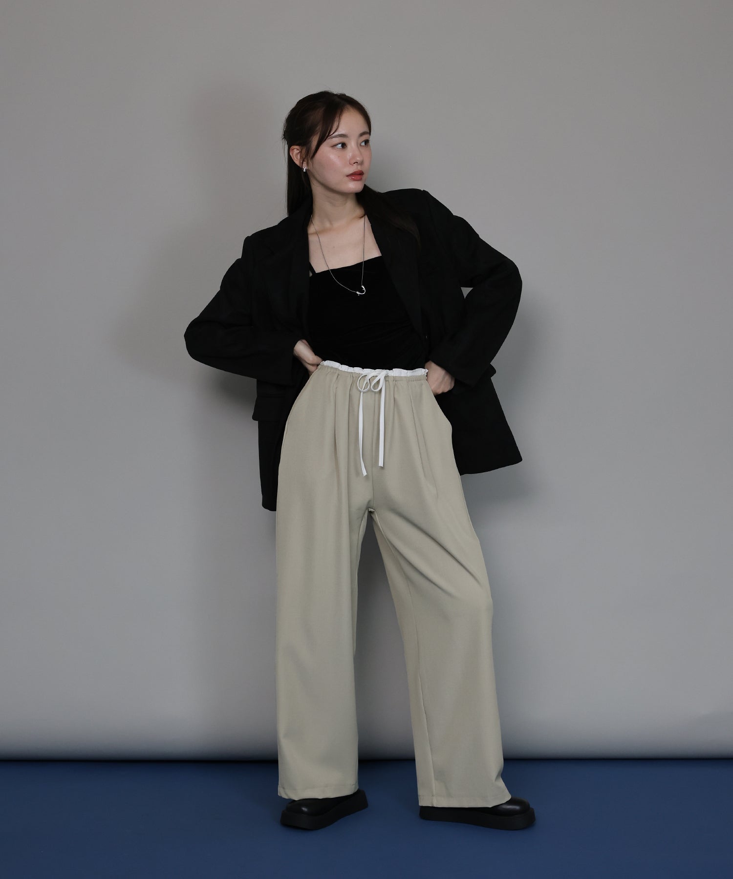 ウエストのレイヤード風デザインに、リボンをあしらったトレンド感溢れるスラックス。