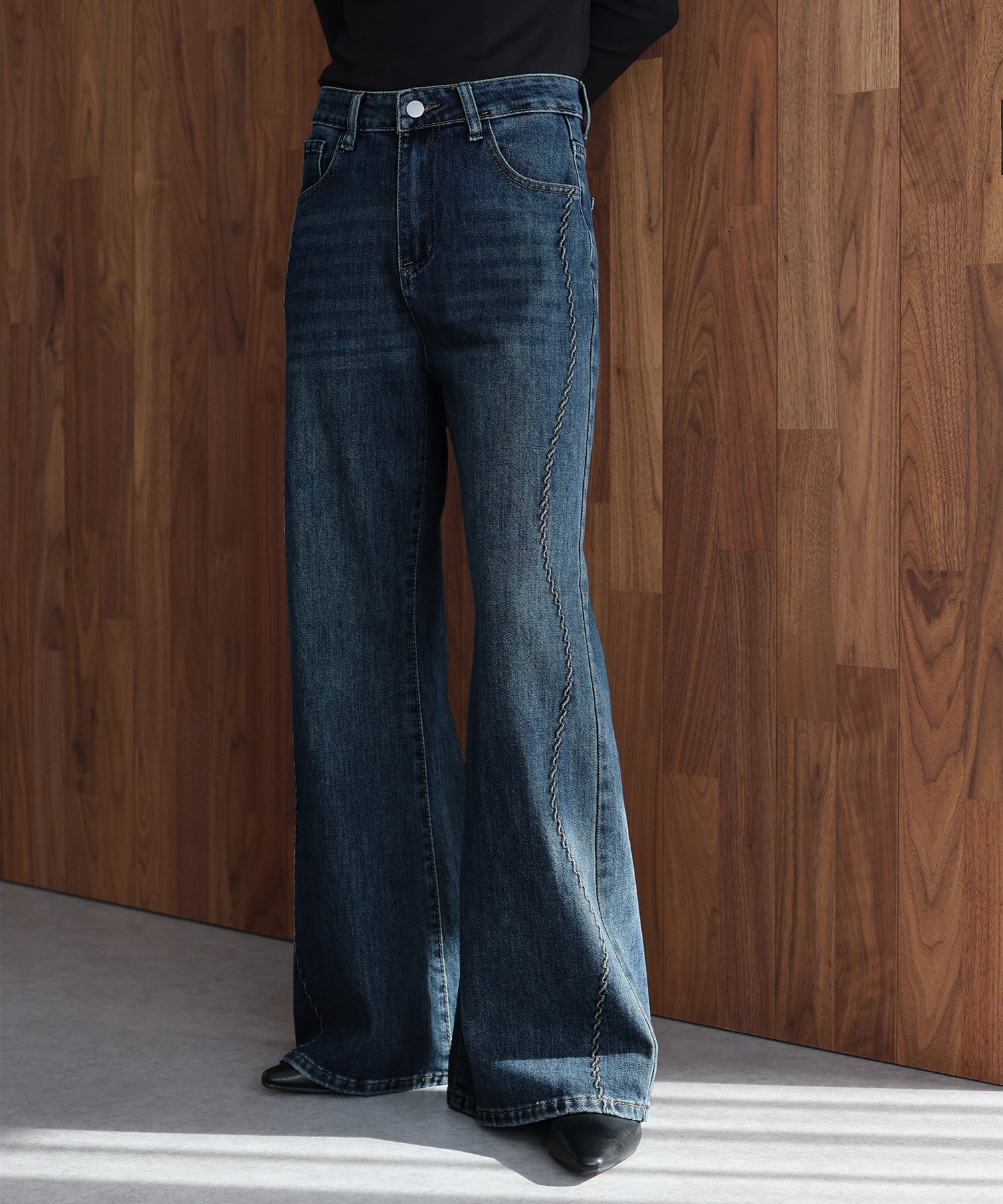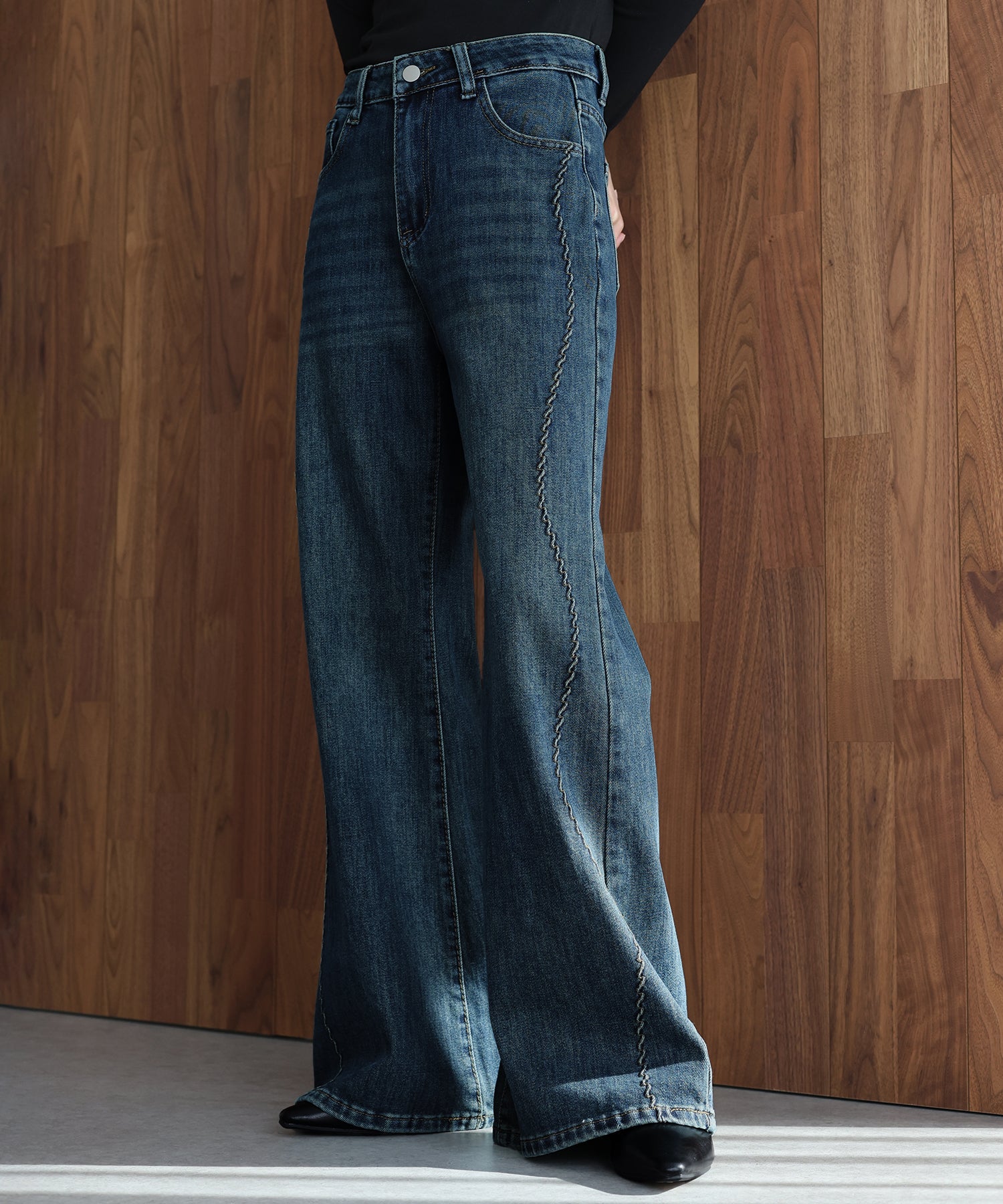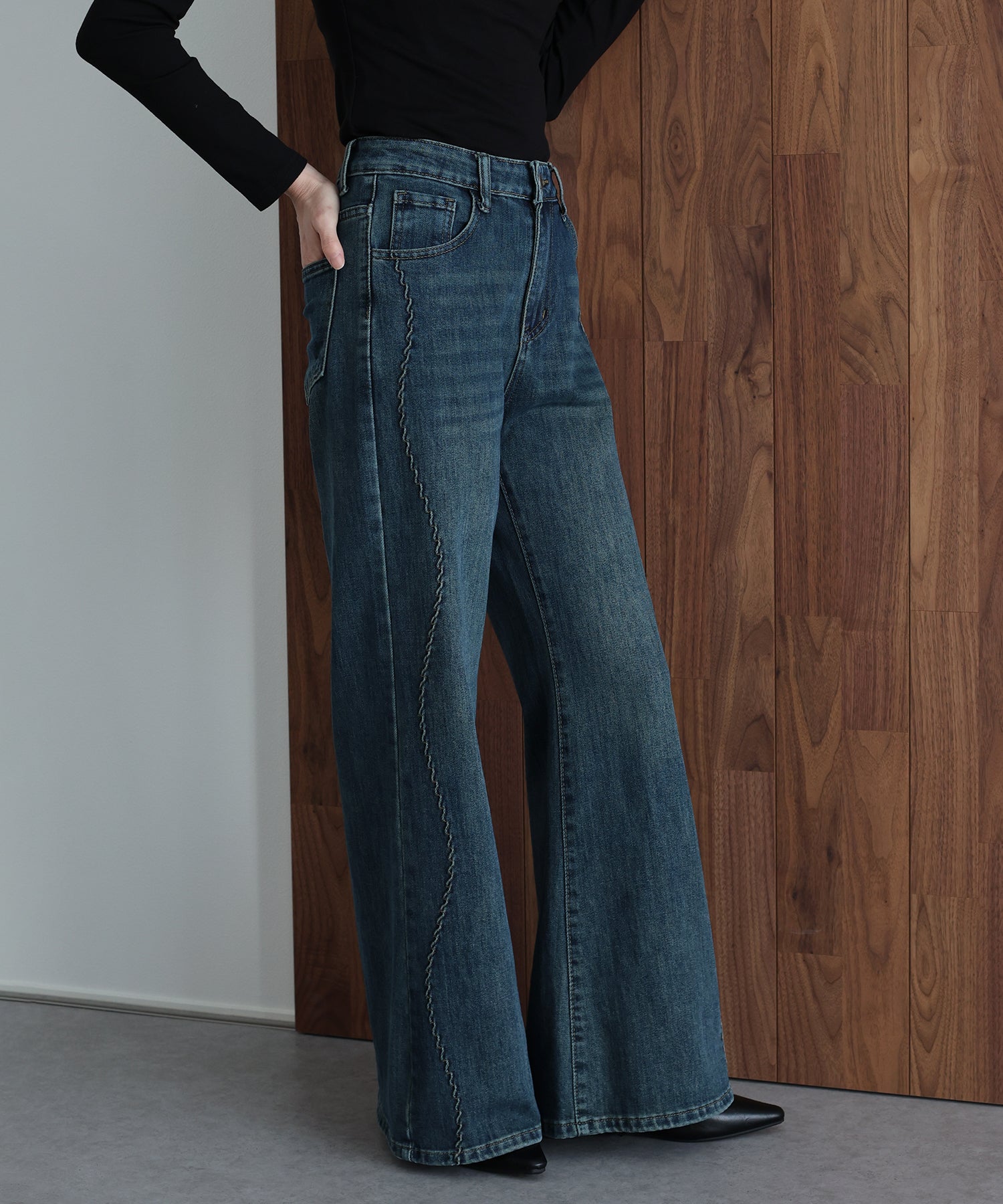 サイドの曲線美で魅せる、遊び心をプラスしたウェーブデザインデニムパンツ