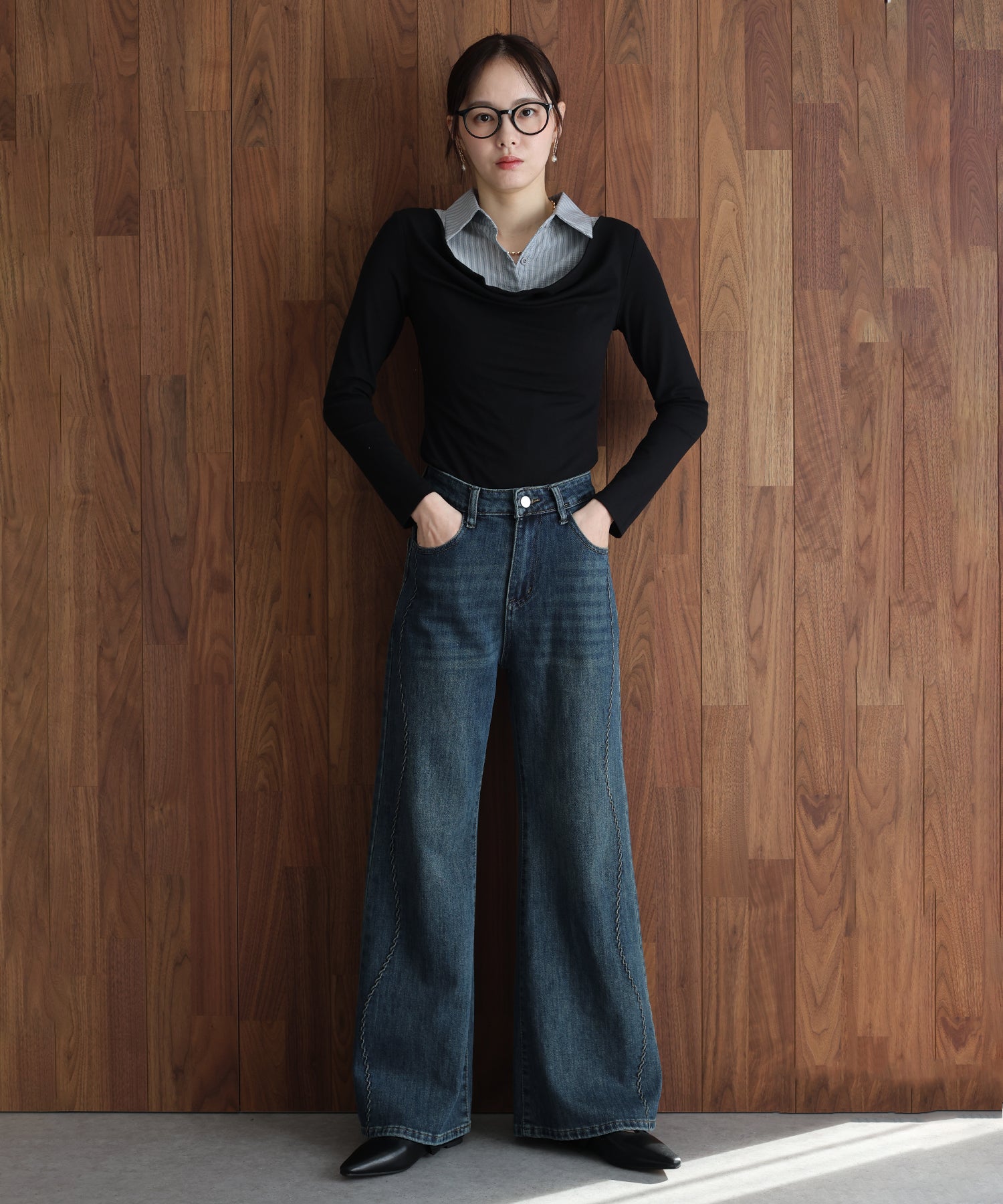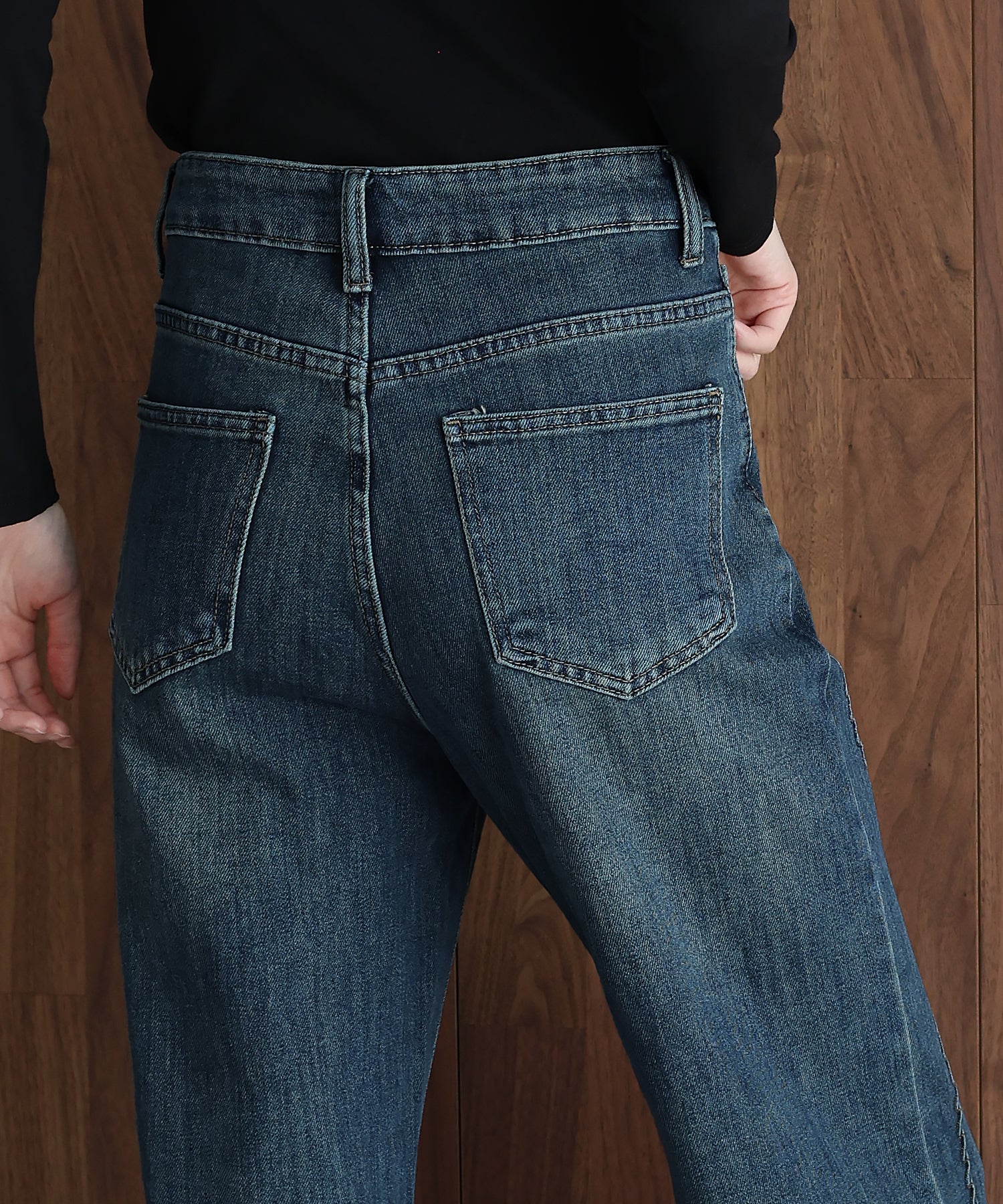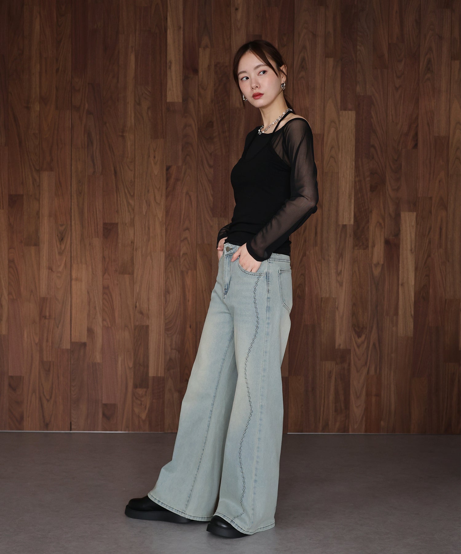 サイドの曲線美で魅せる、遊び心をプラスしたウェーブデザインデニムパンツ