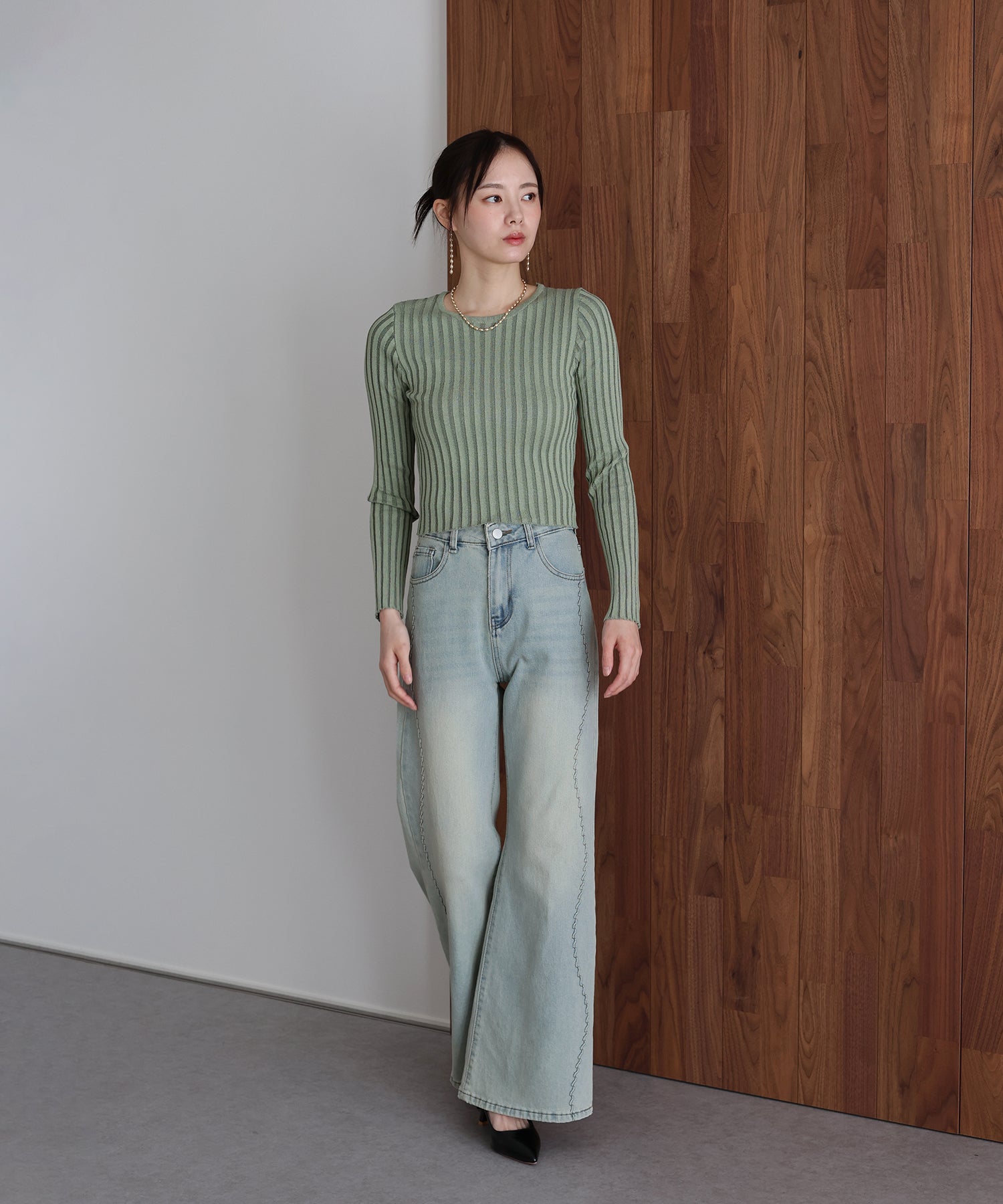 ハイウエスト設計なので、シアーロンTや細ボーダーTシャツをインした、メリハリのあるスタイリングが特におすすめ。