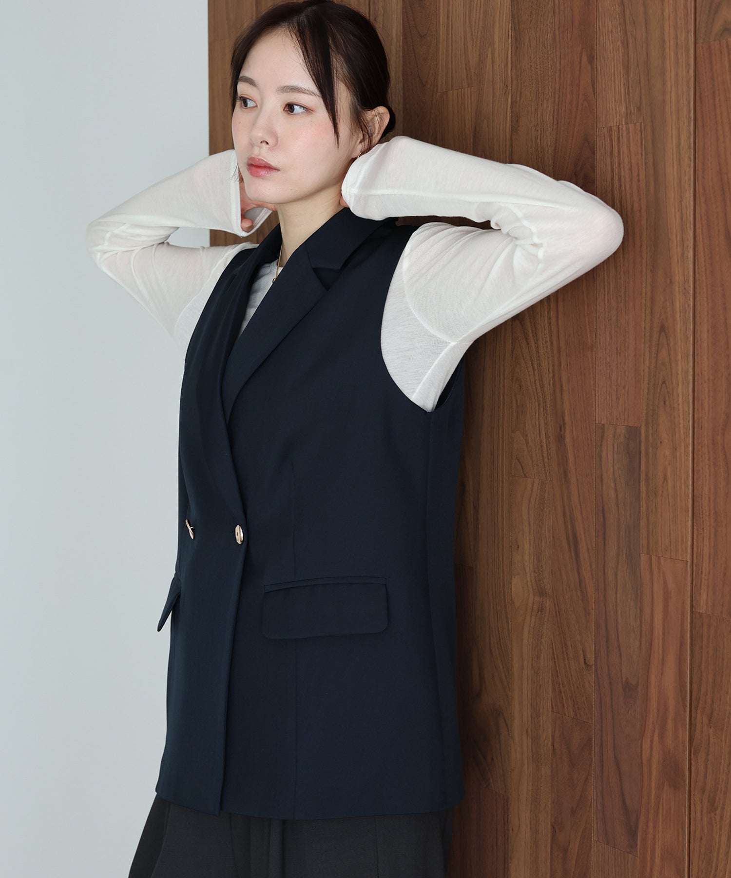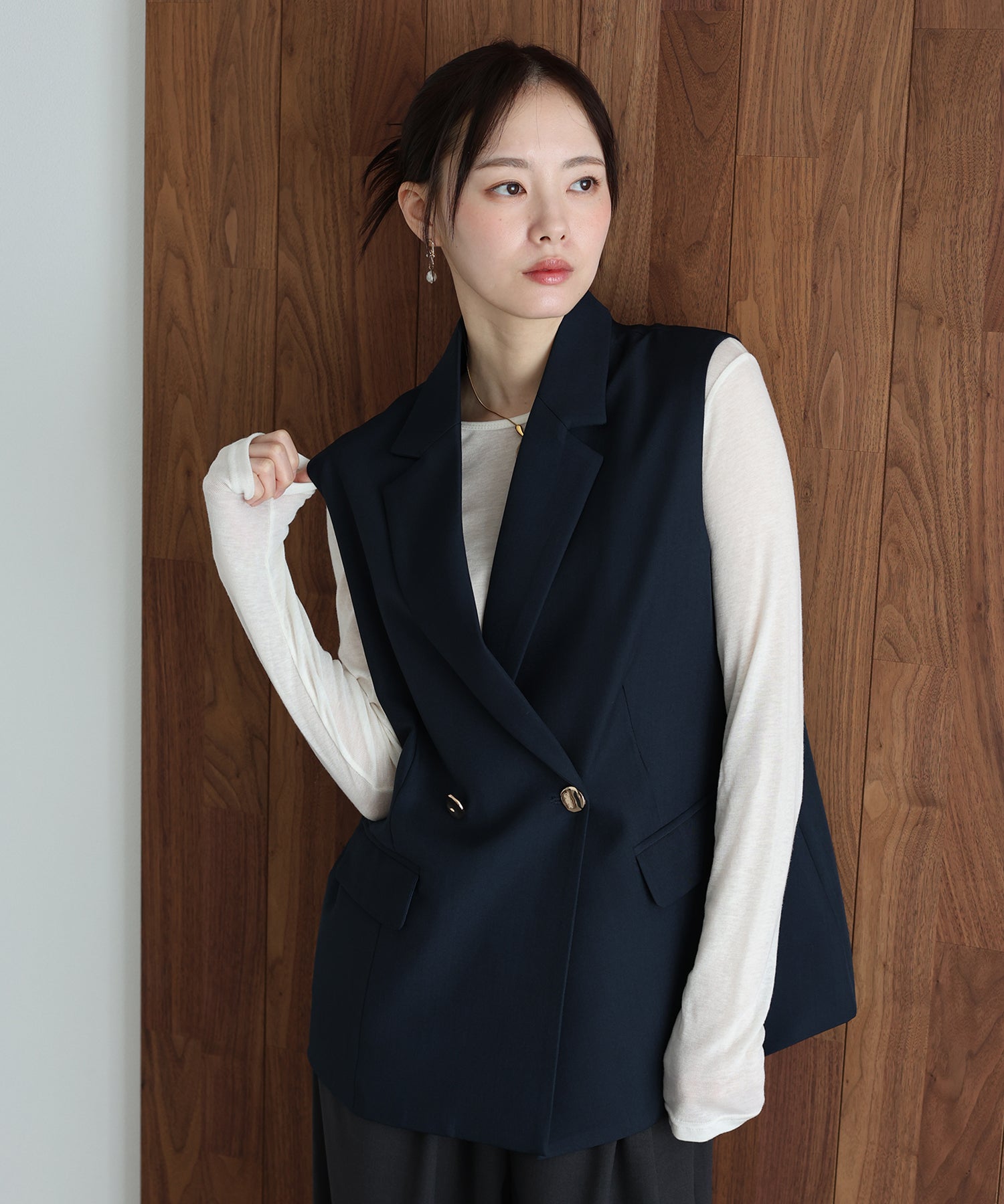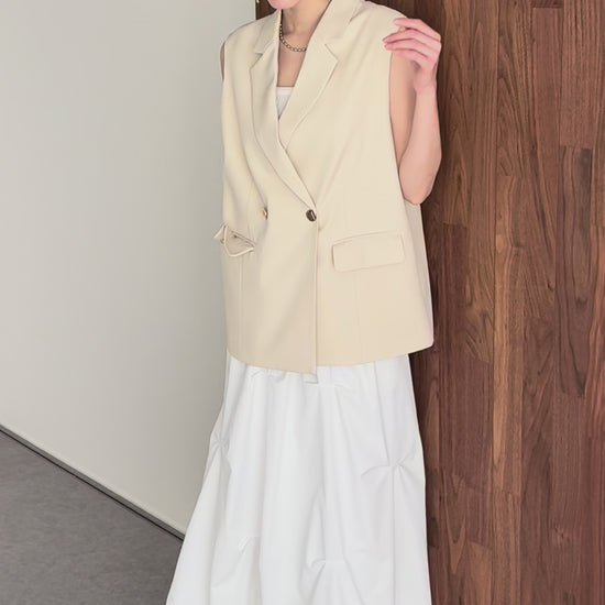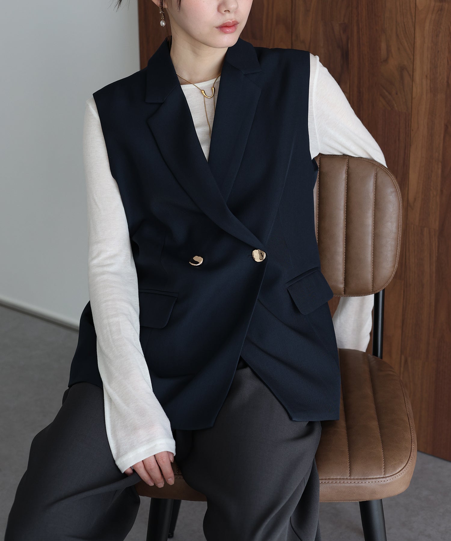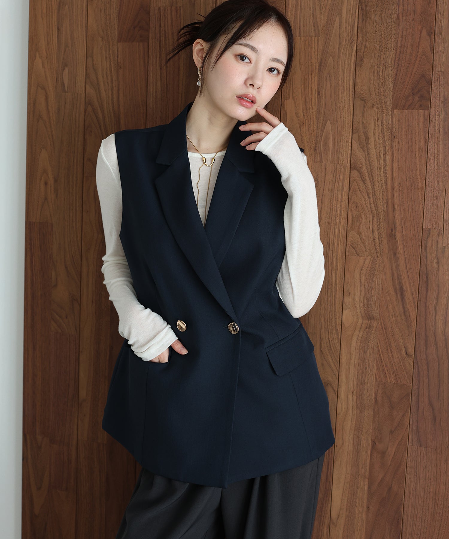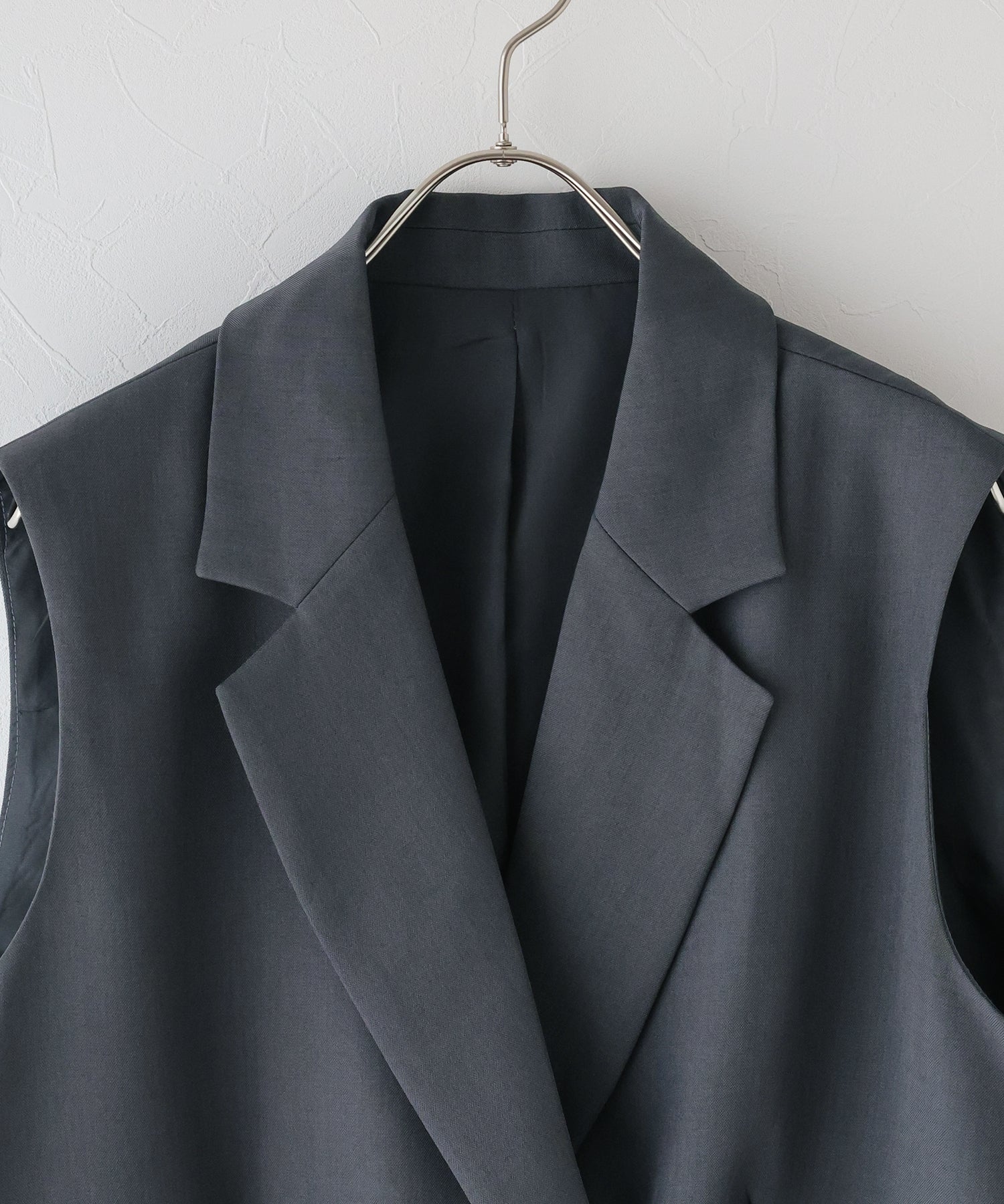 オンオフ問わず様々なスタイリングにマッチする旬なテーラードジレ。
