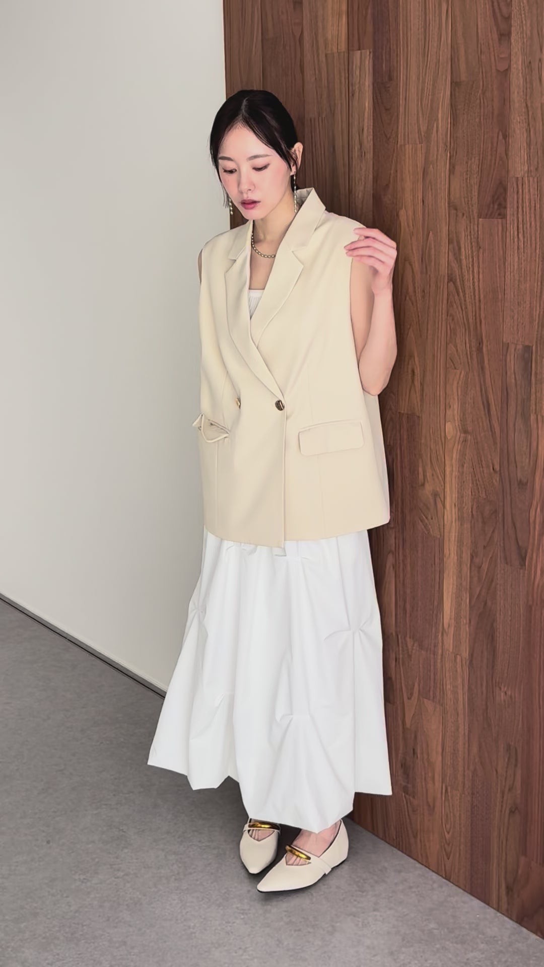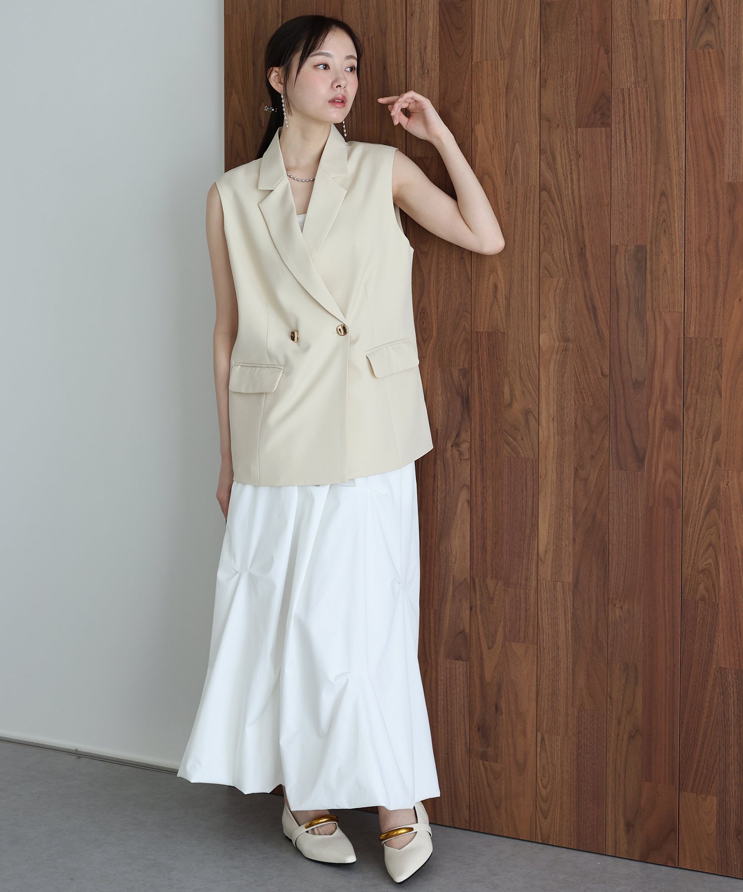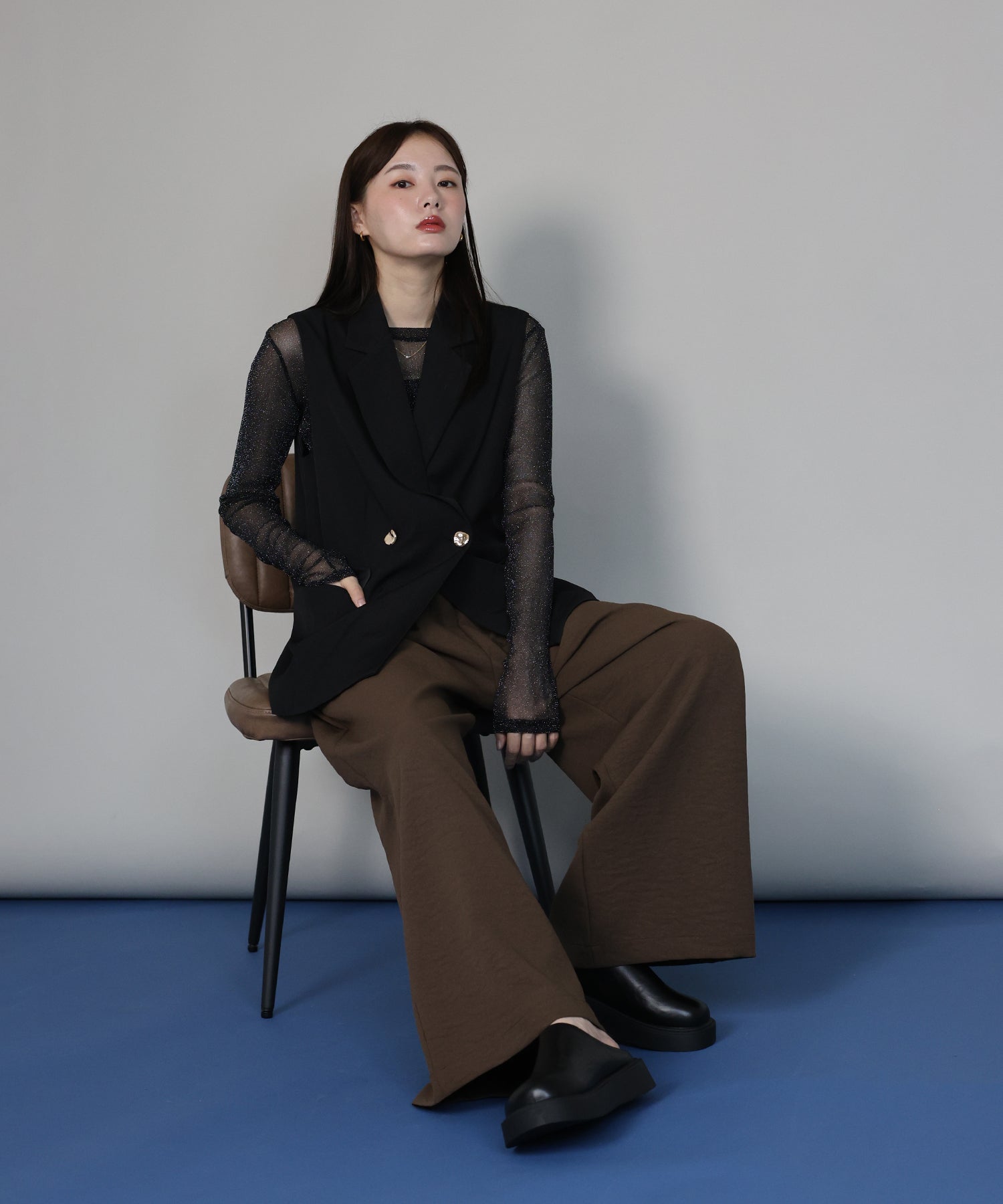 上品で大人なジレはカジュアルなアイテムとも好相性でオンオフどちらでも着回しやすいアイテム。