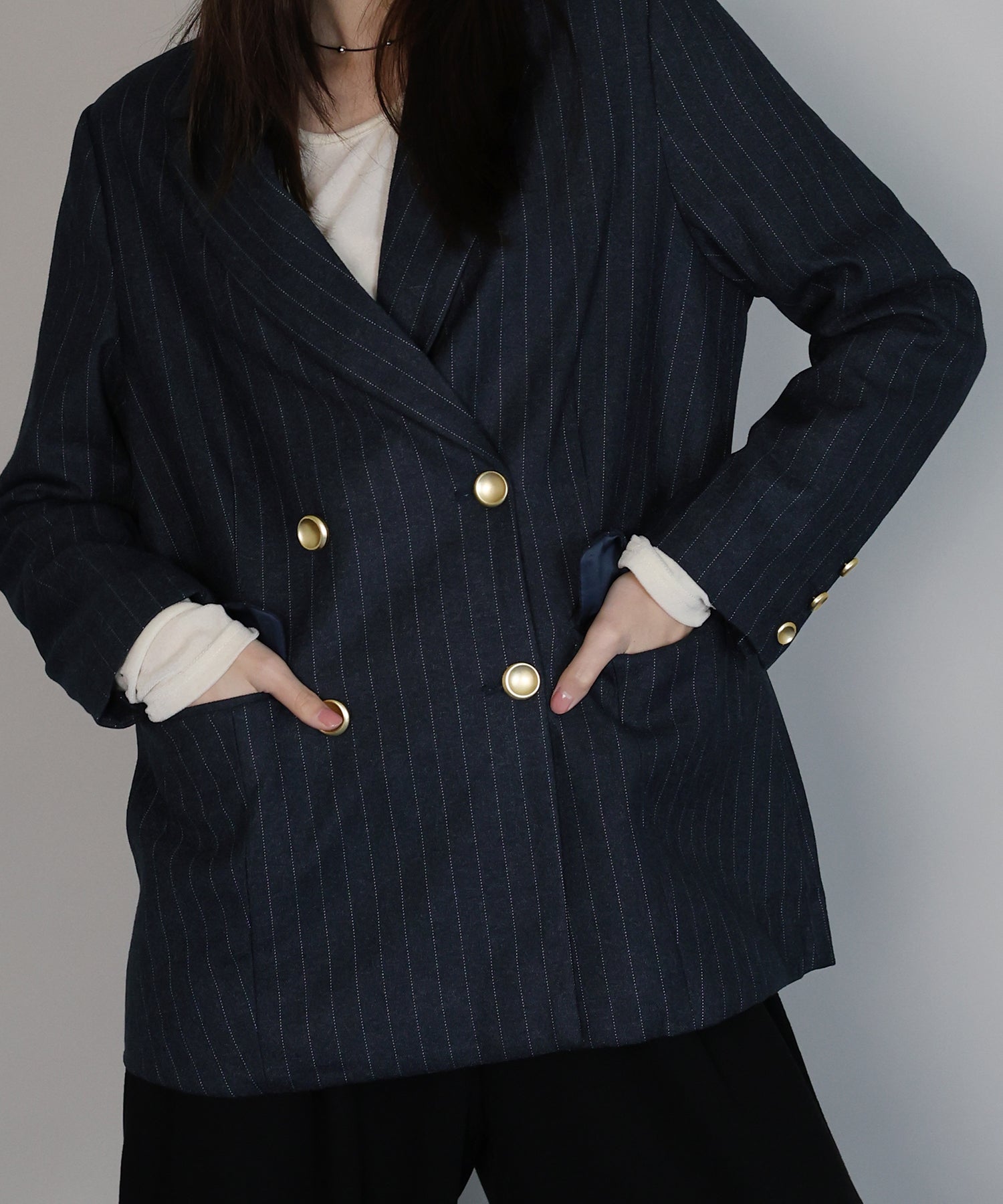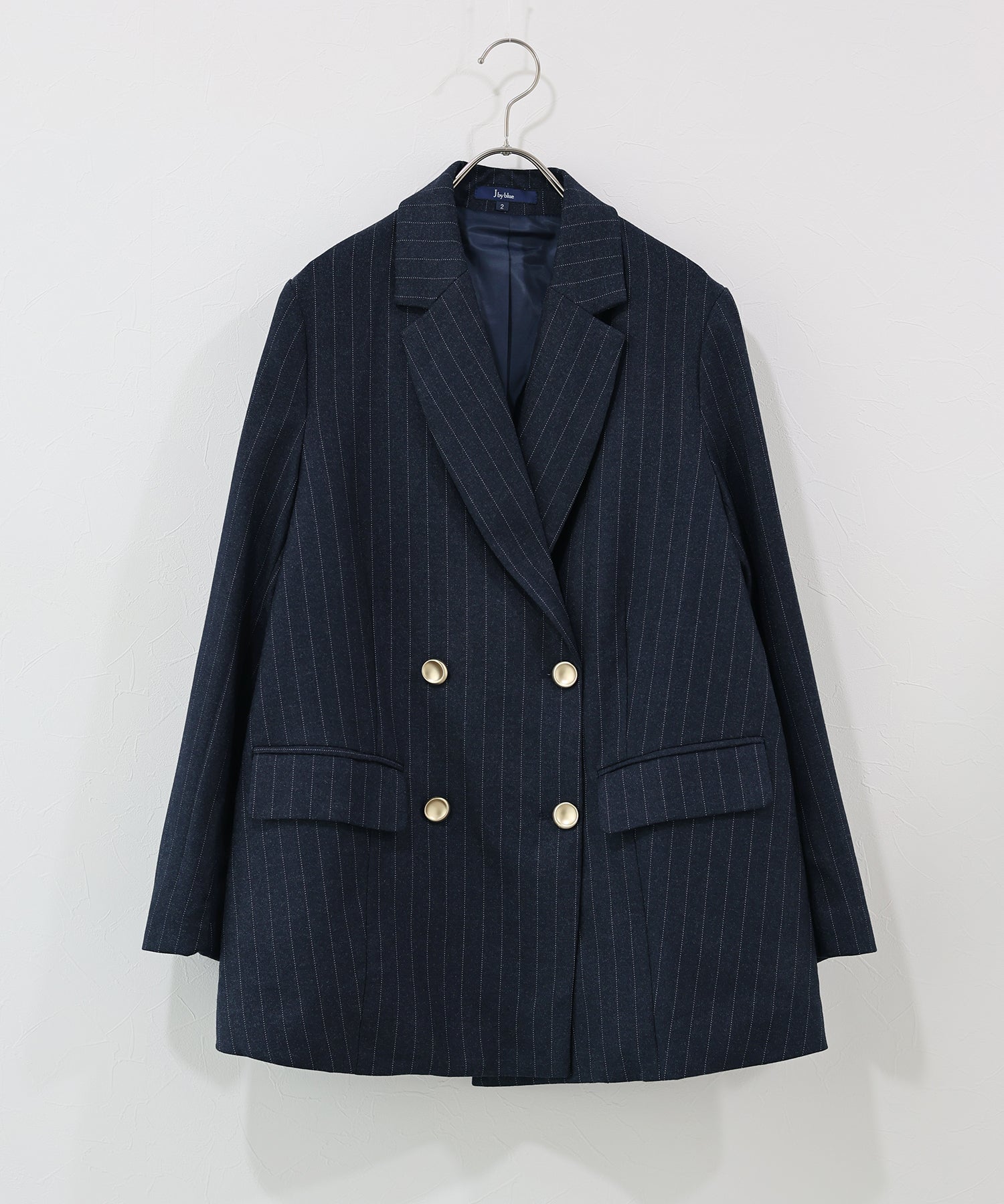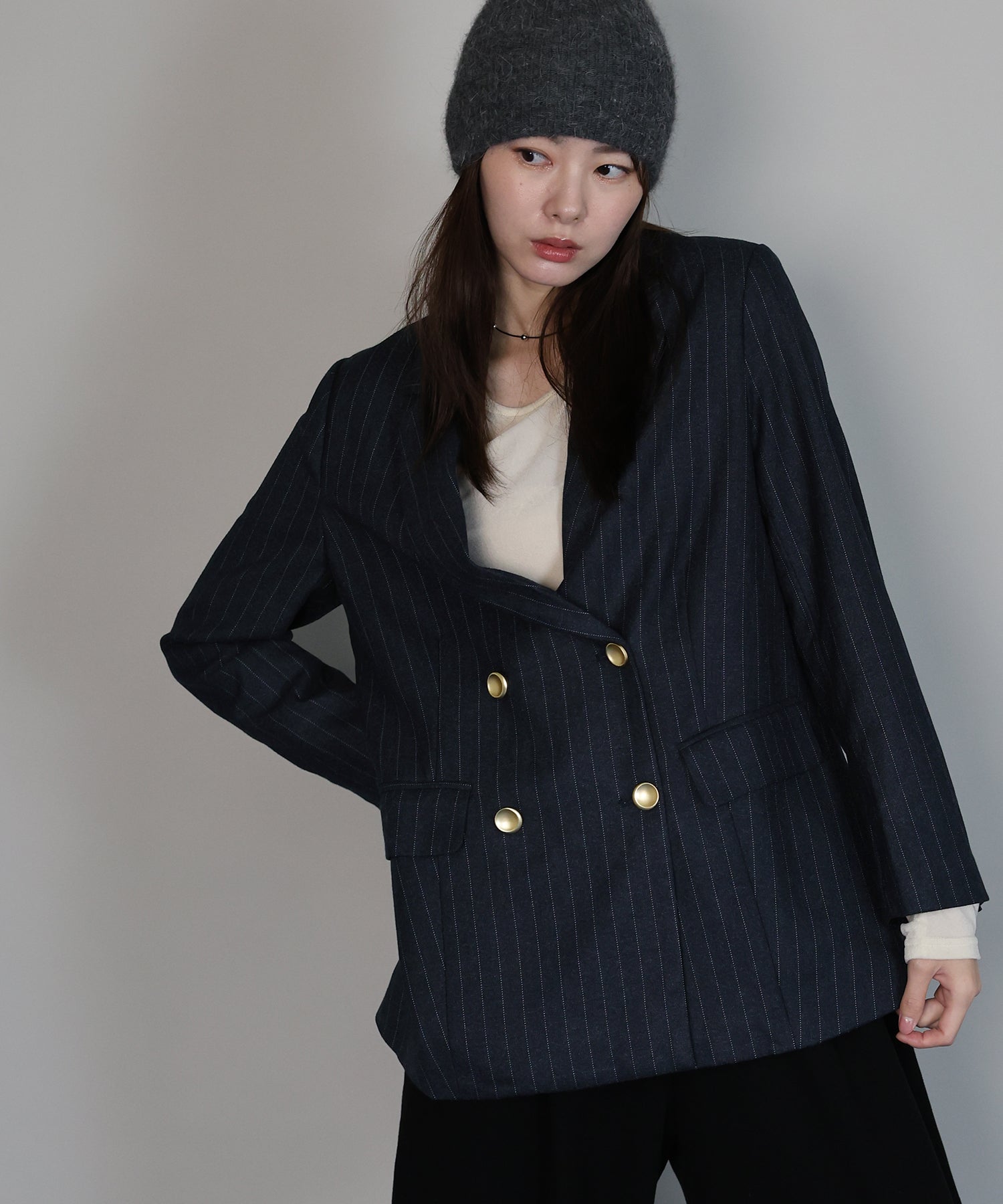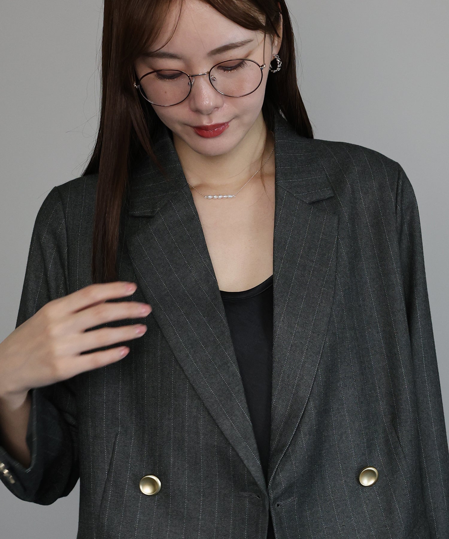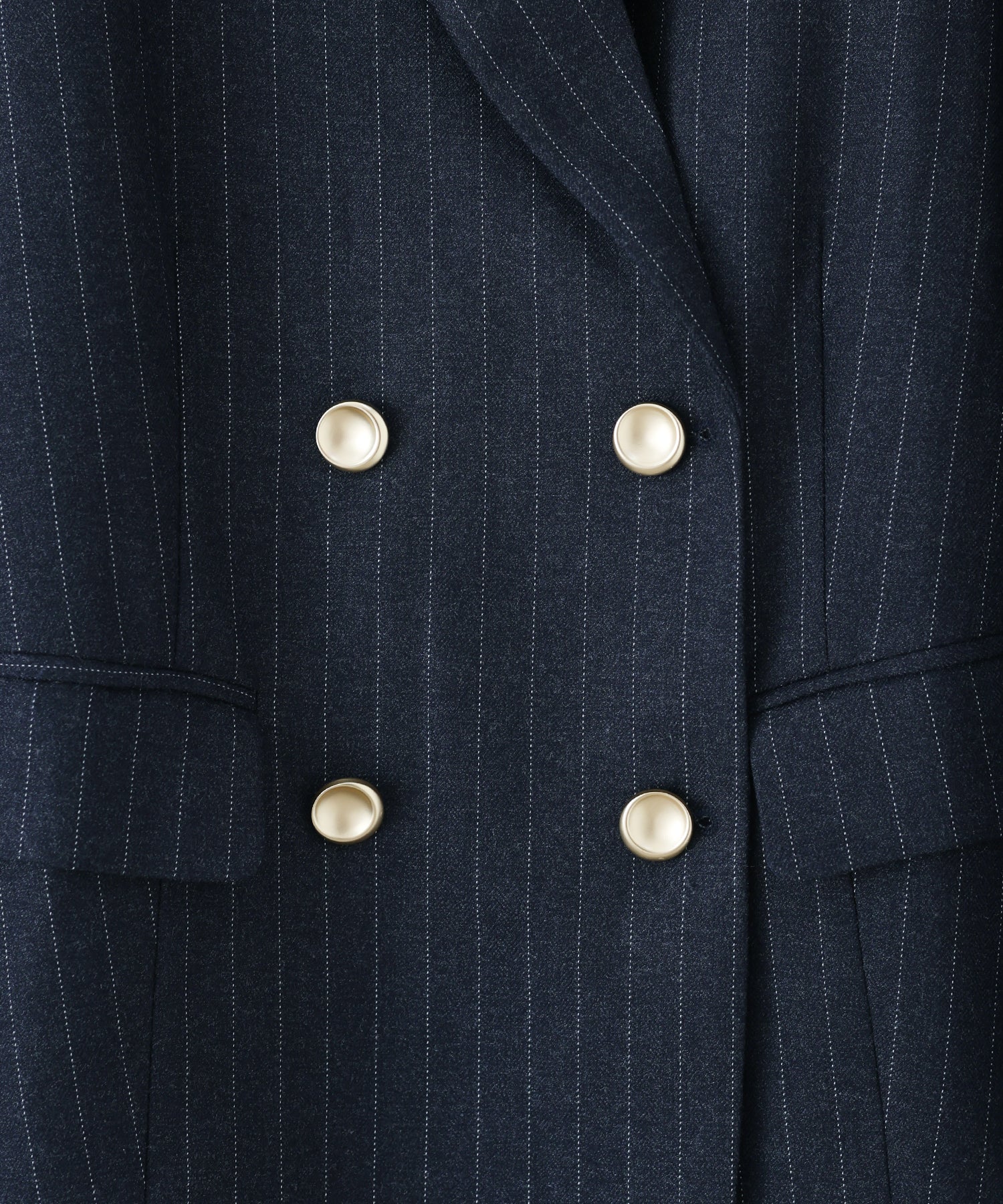 ピンストライプ柄がマニッシュな印象を与えるダブルテーラードジャケット。