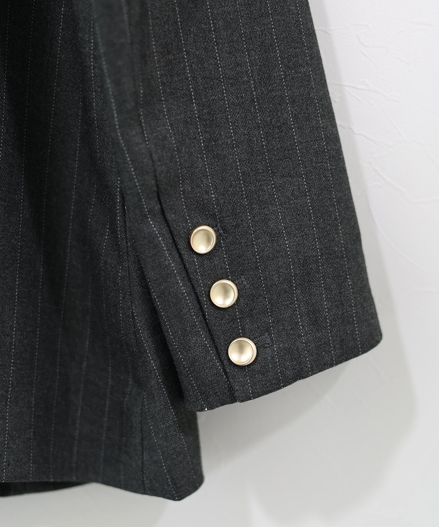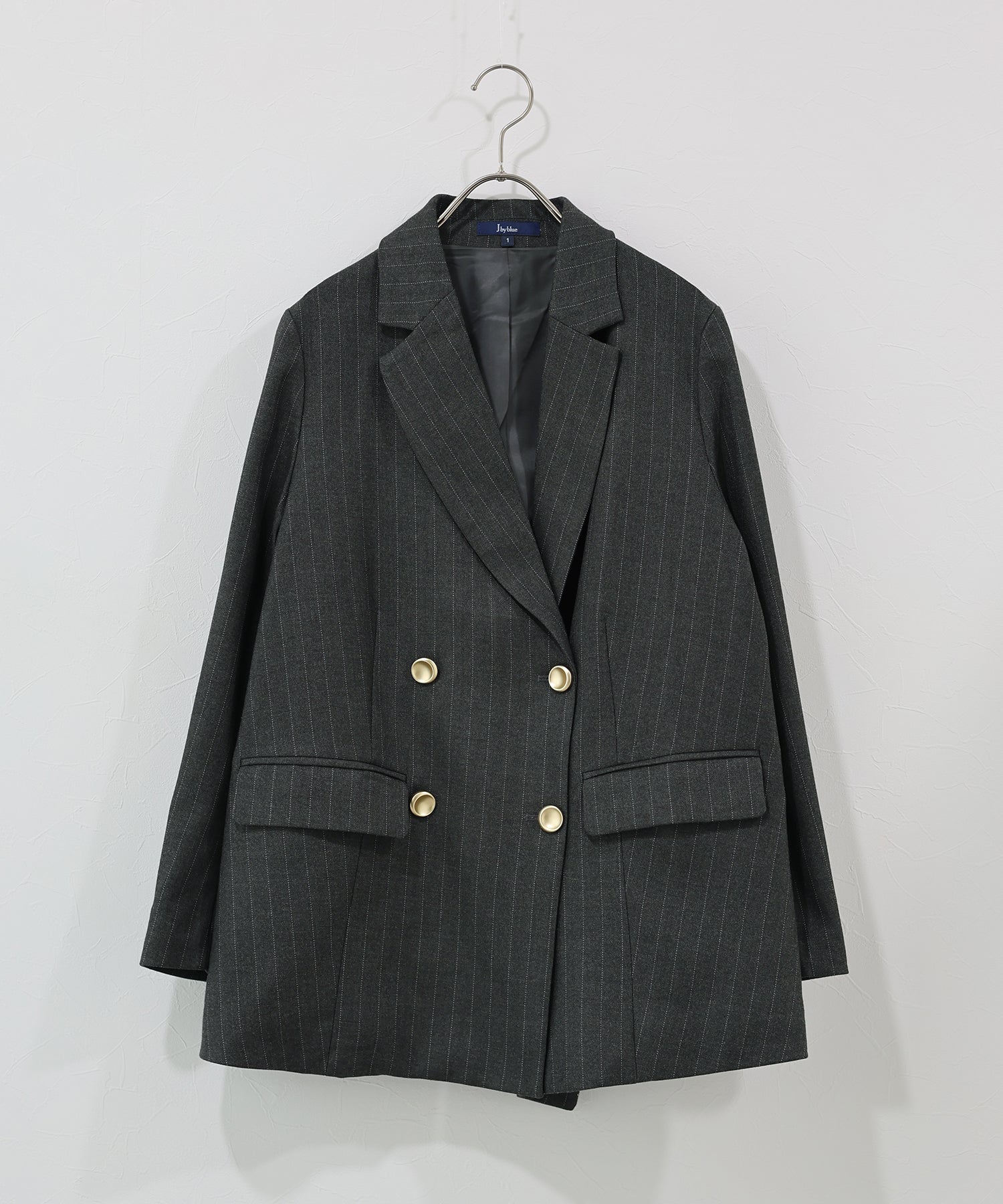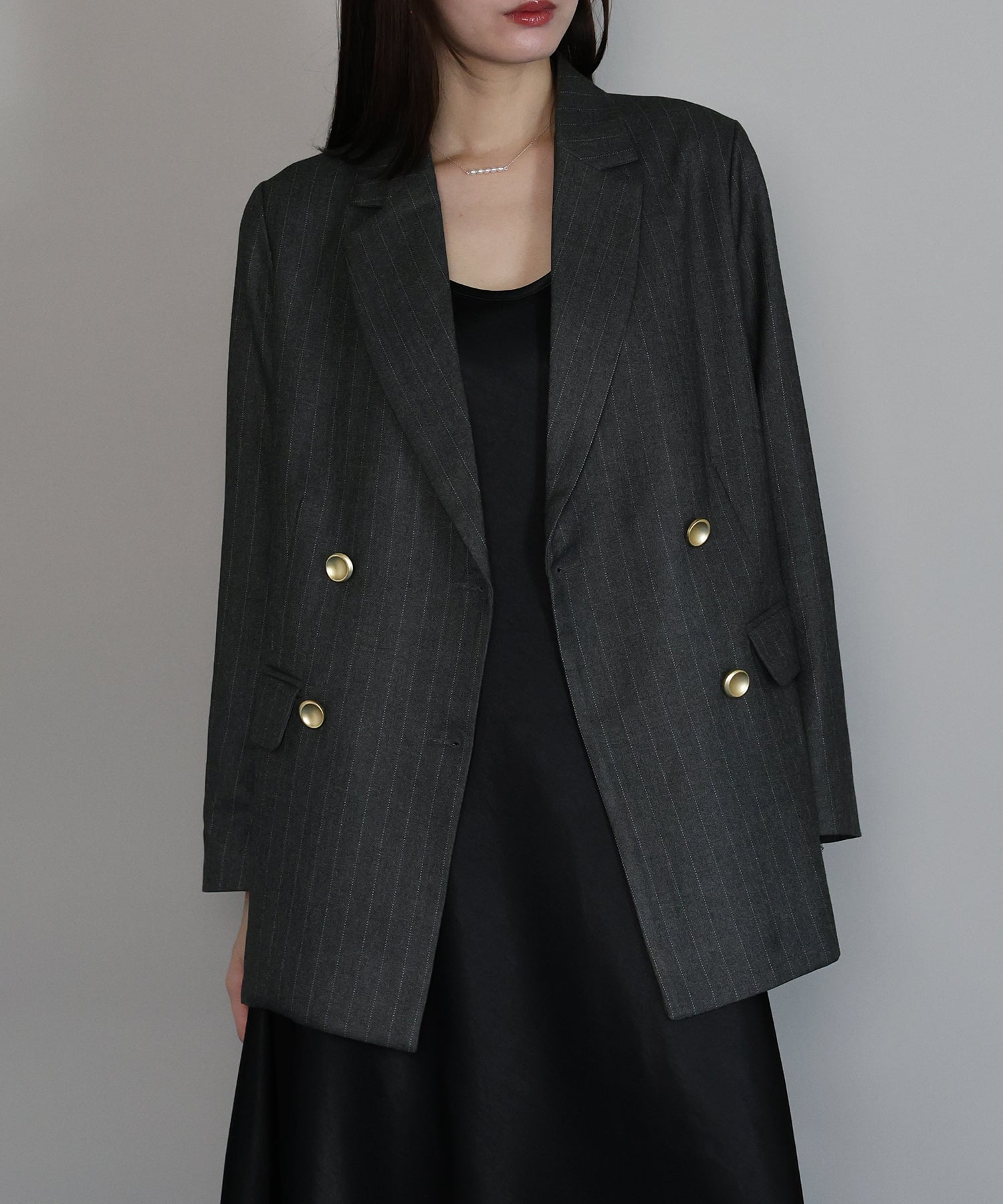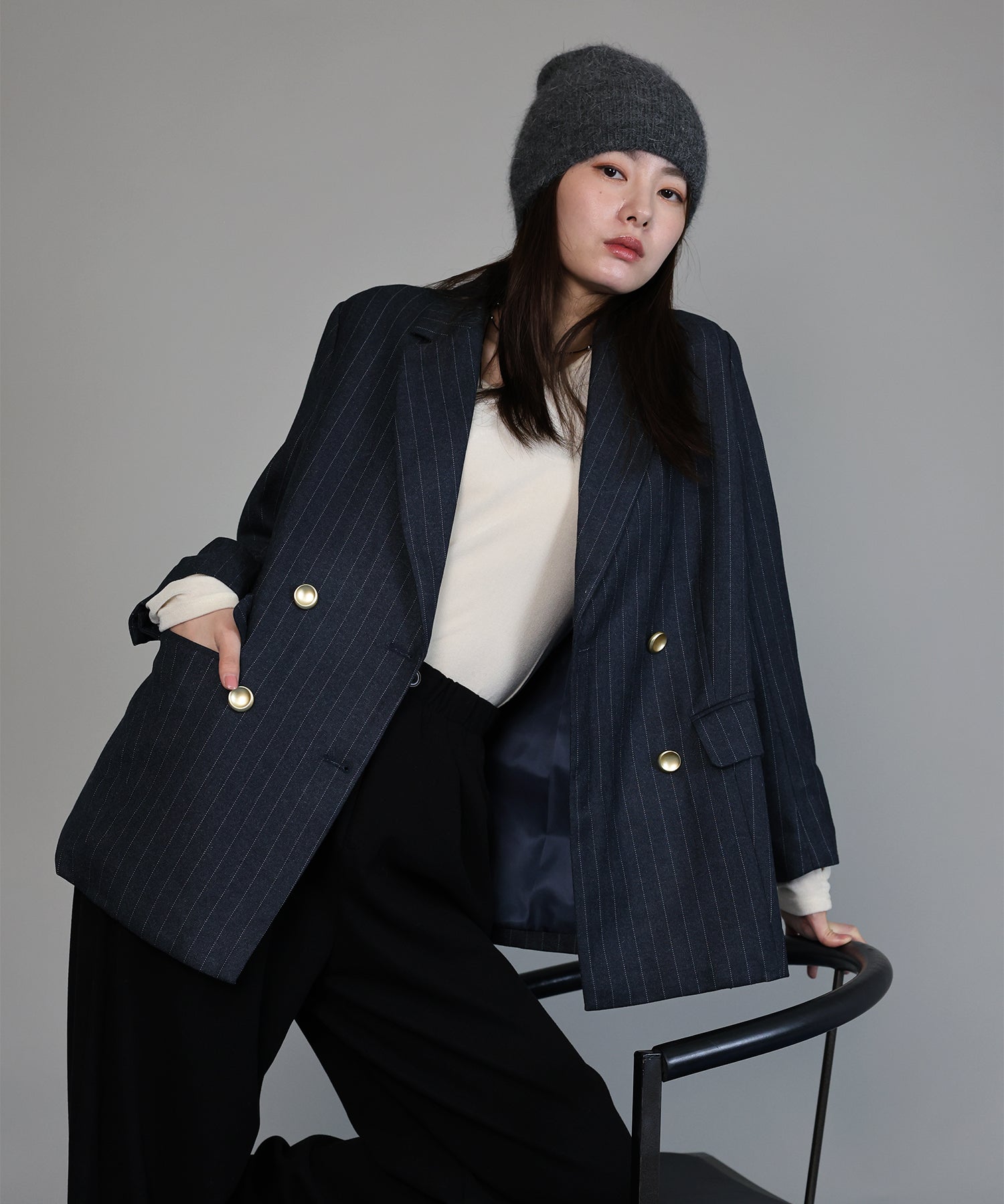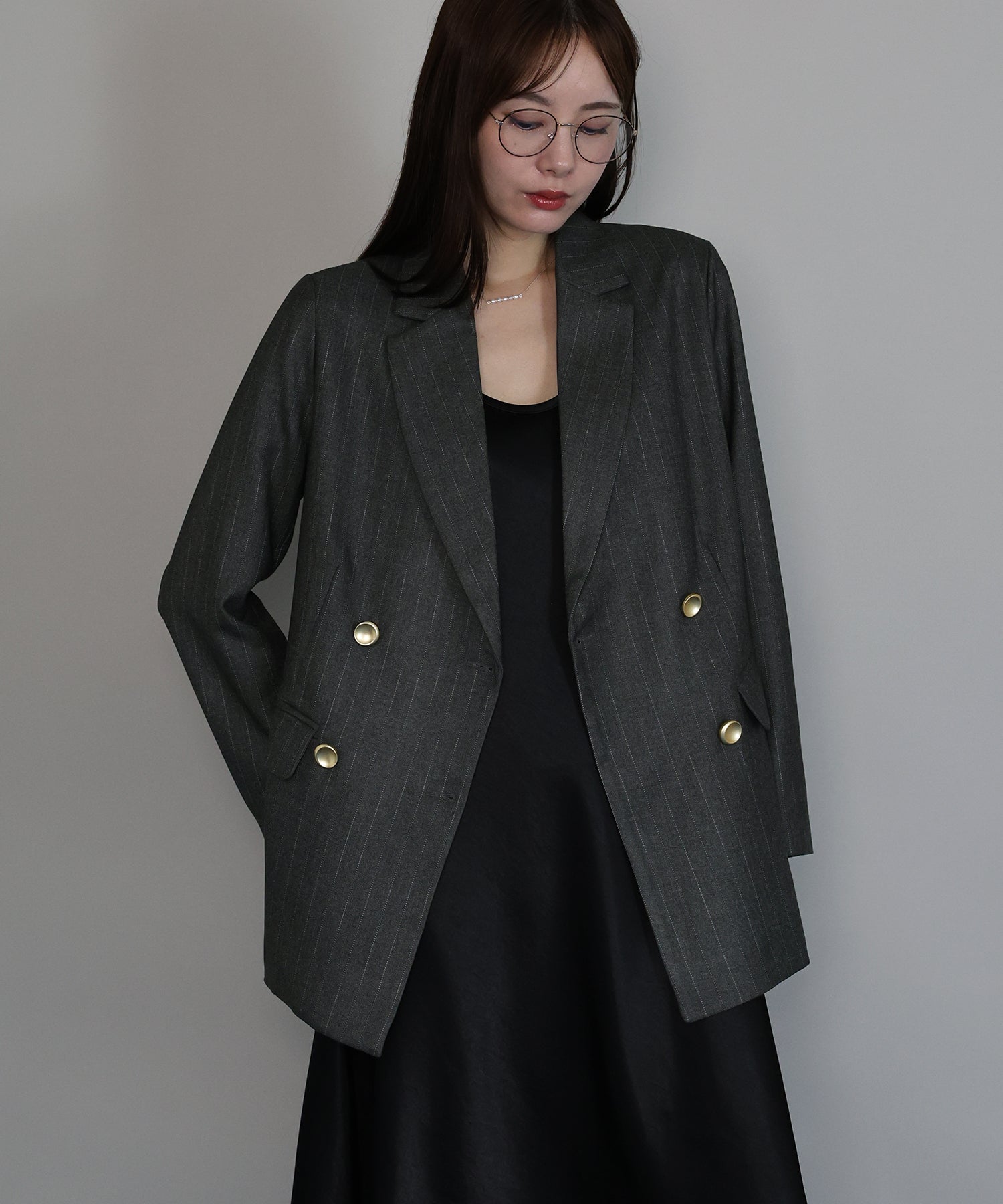 ピンストライプ柄がマニッシュな印象を与えるダブルテーラードジャケット。