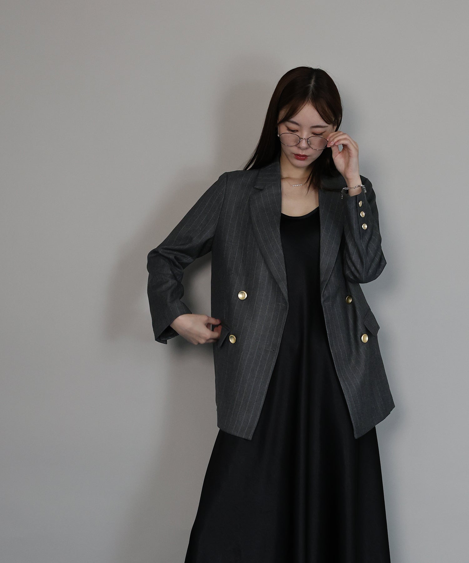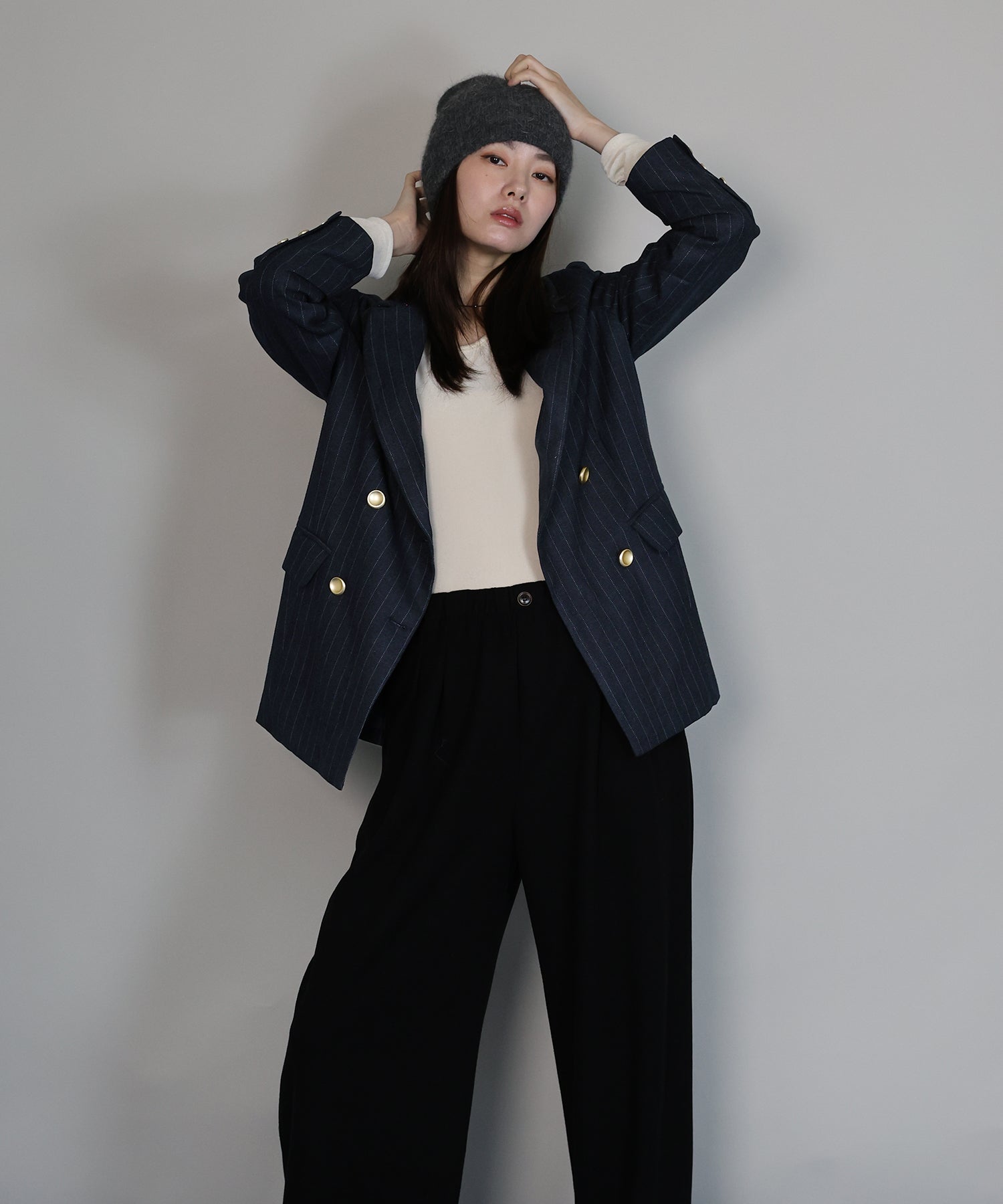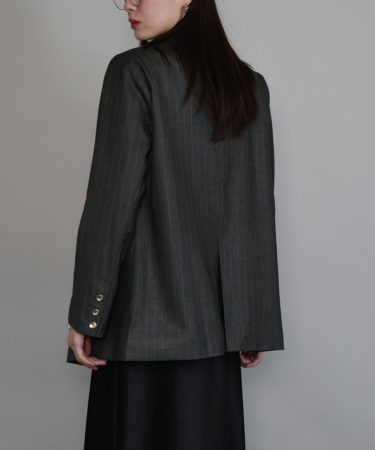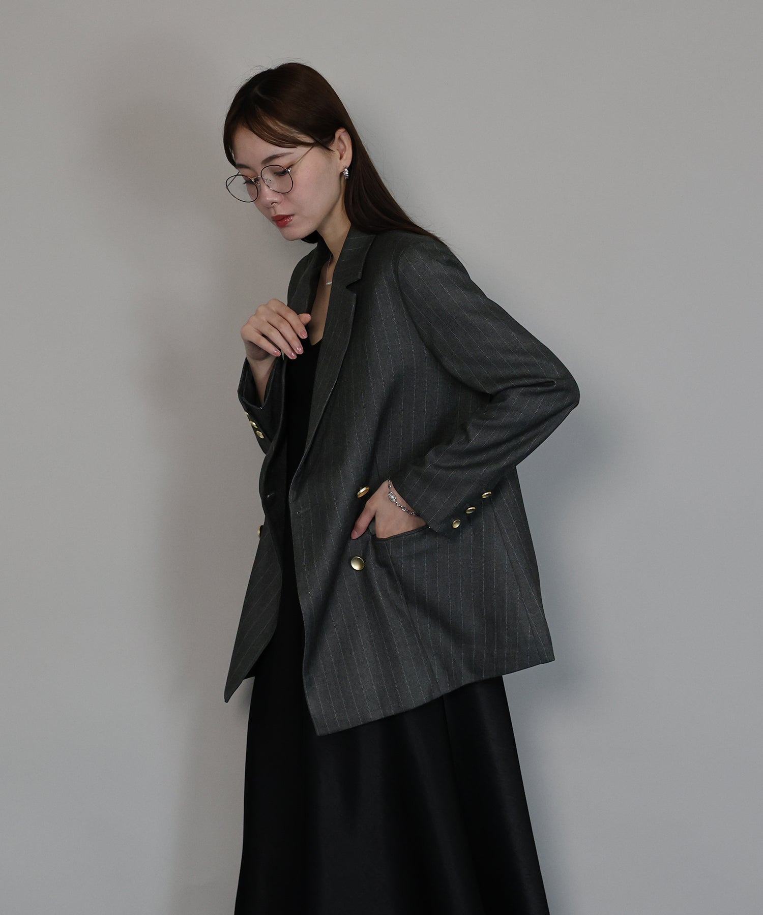 ピンストライプ柄がマニッシュな印象を与えるダブルテーラードジャケット。