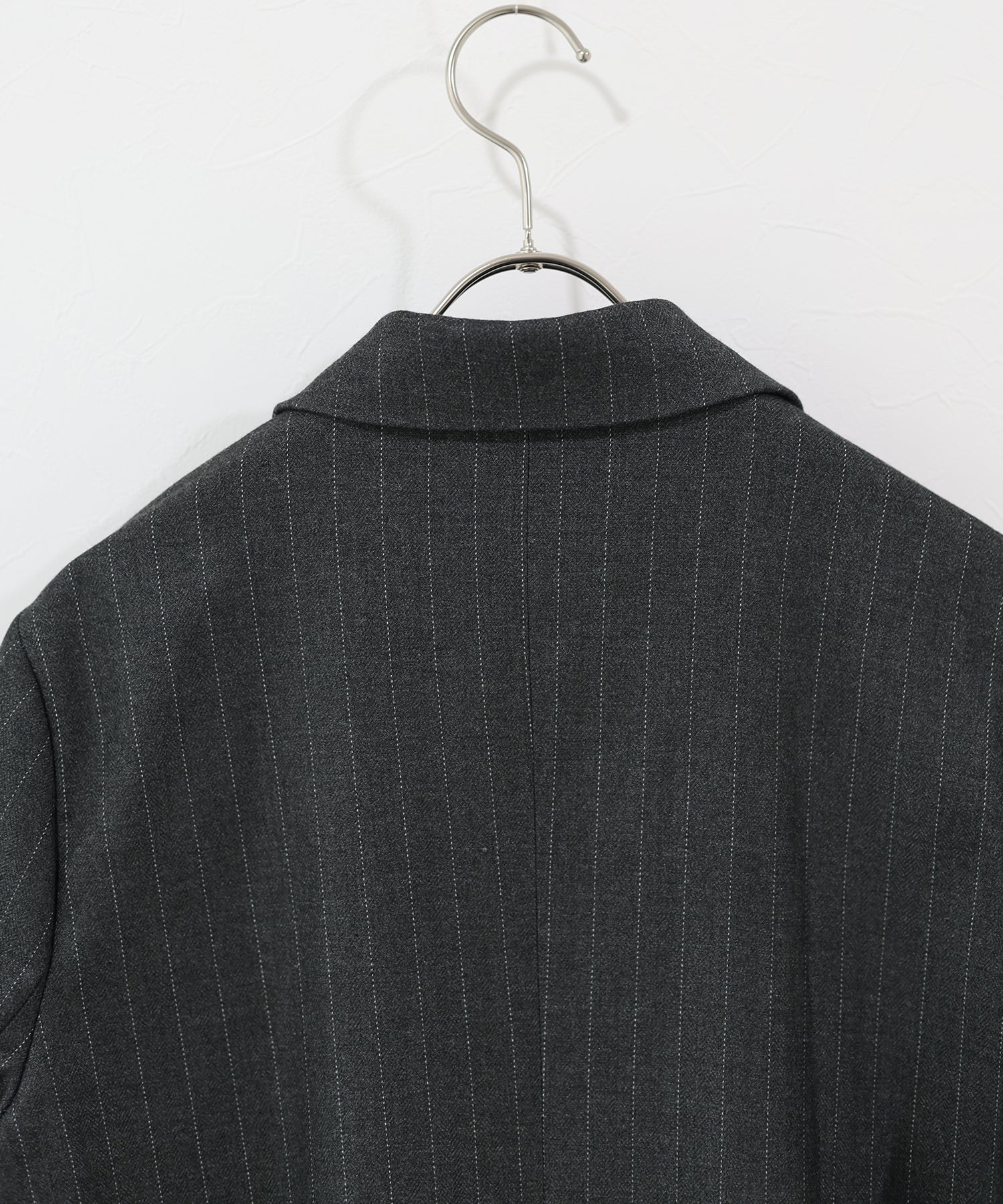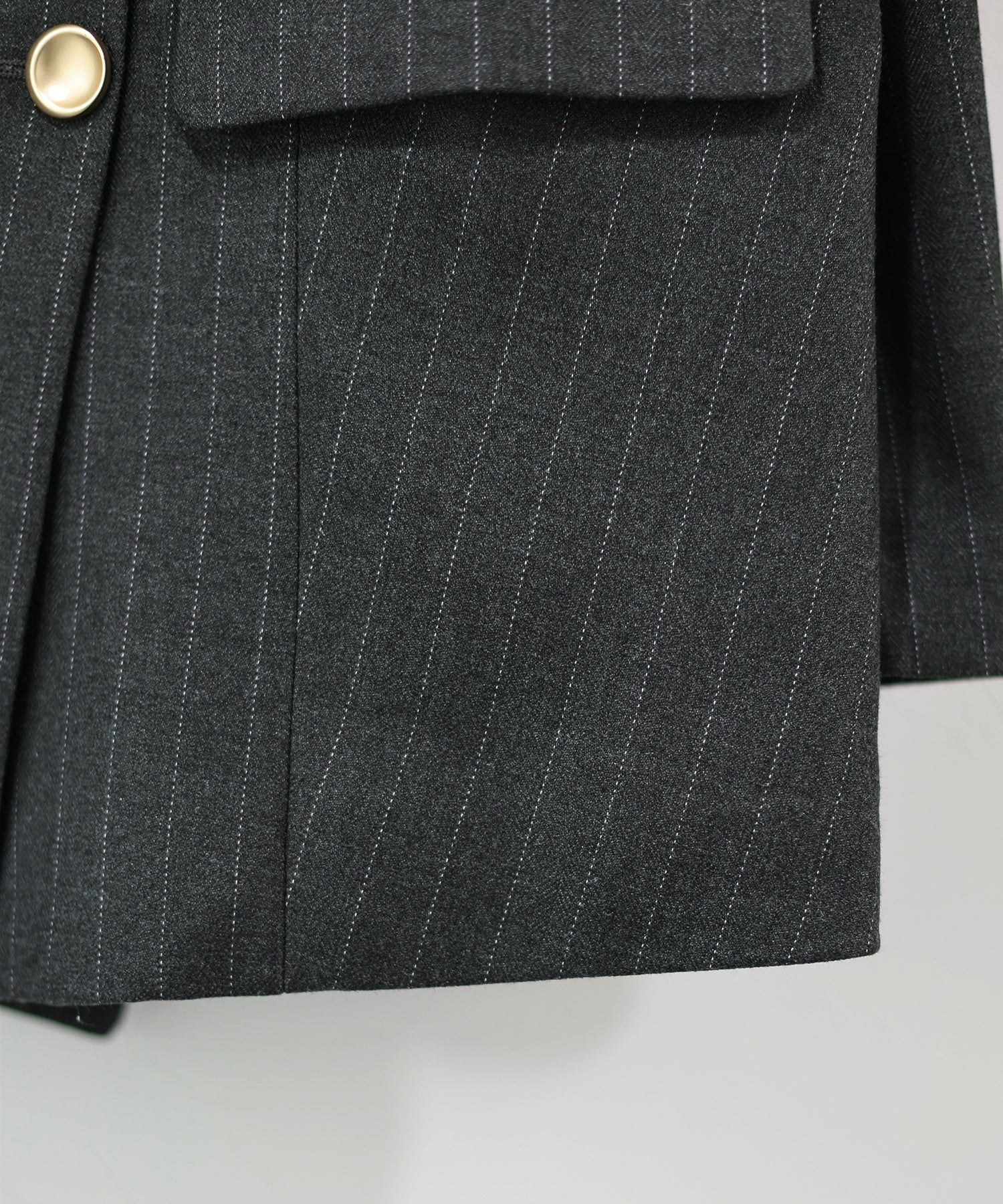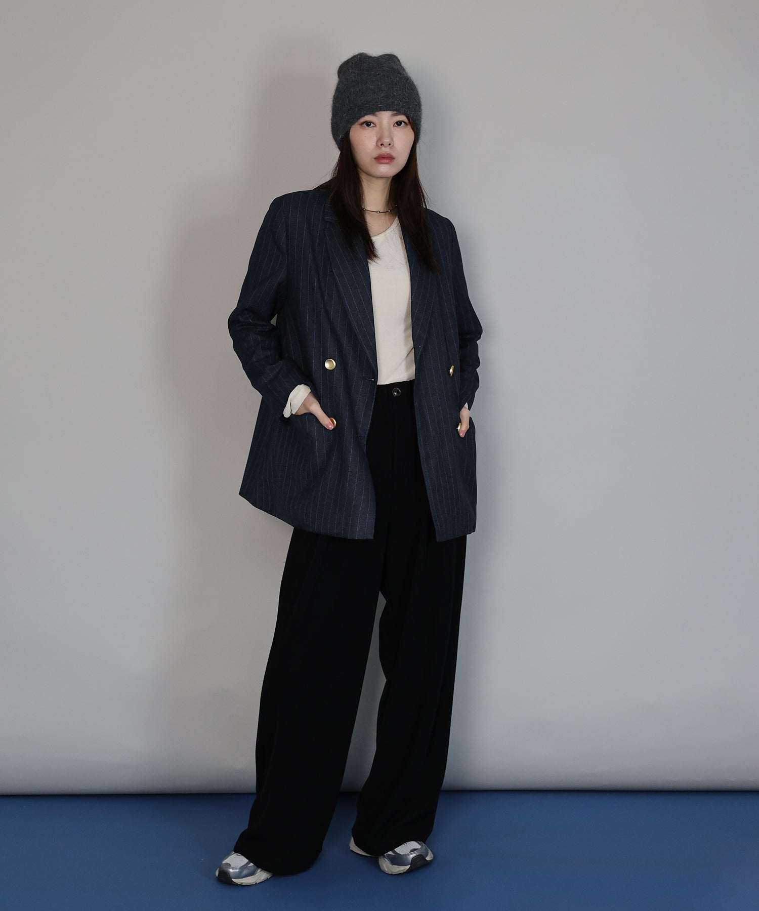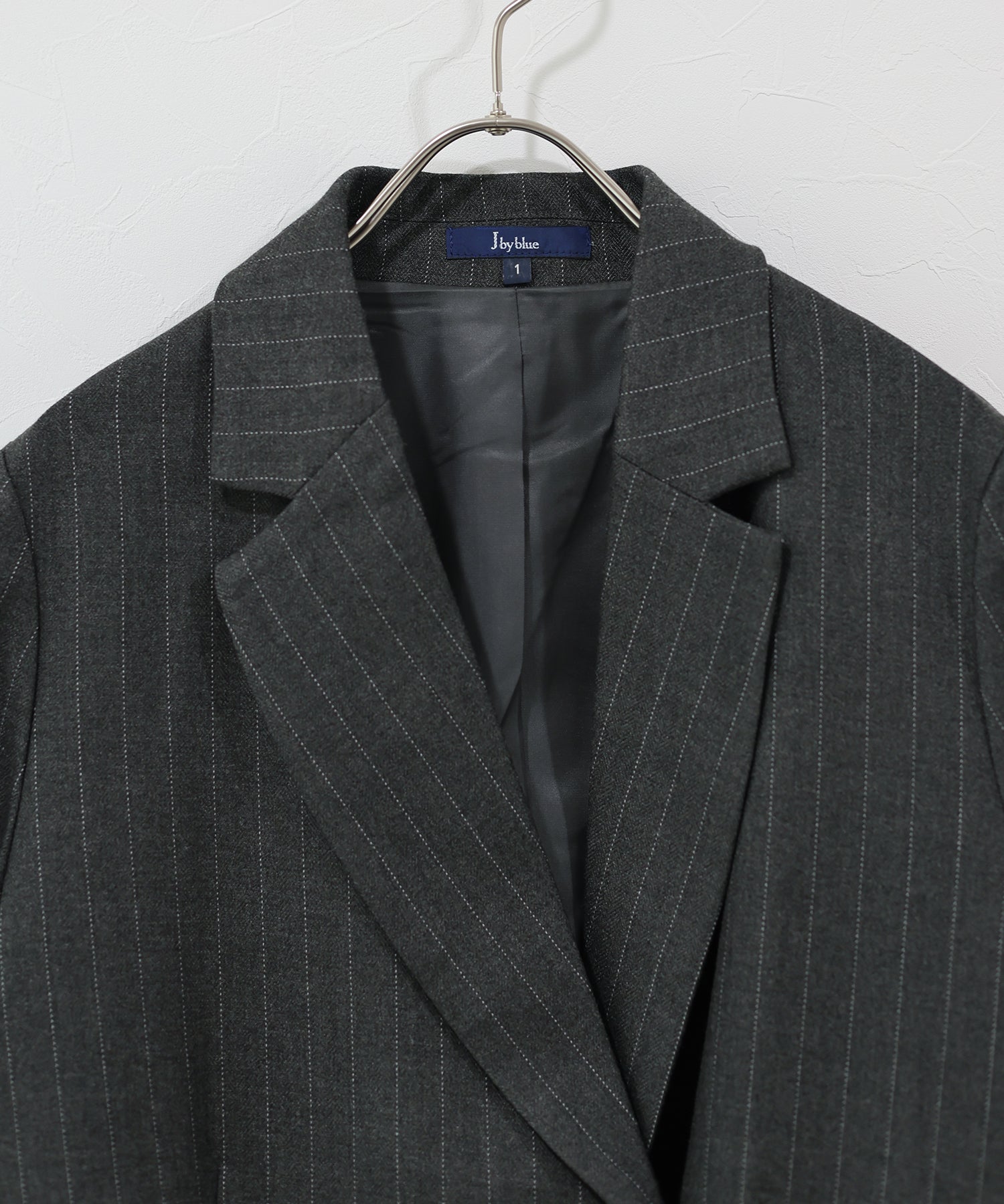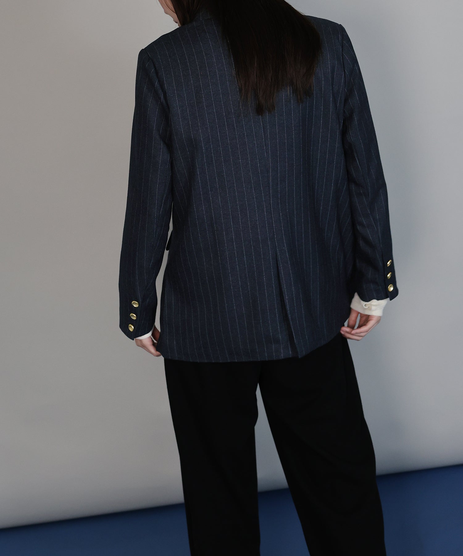 ピンストライプ柄がマニッシュな印象を与えるダブルテーラードジャケット。