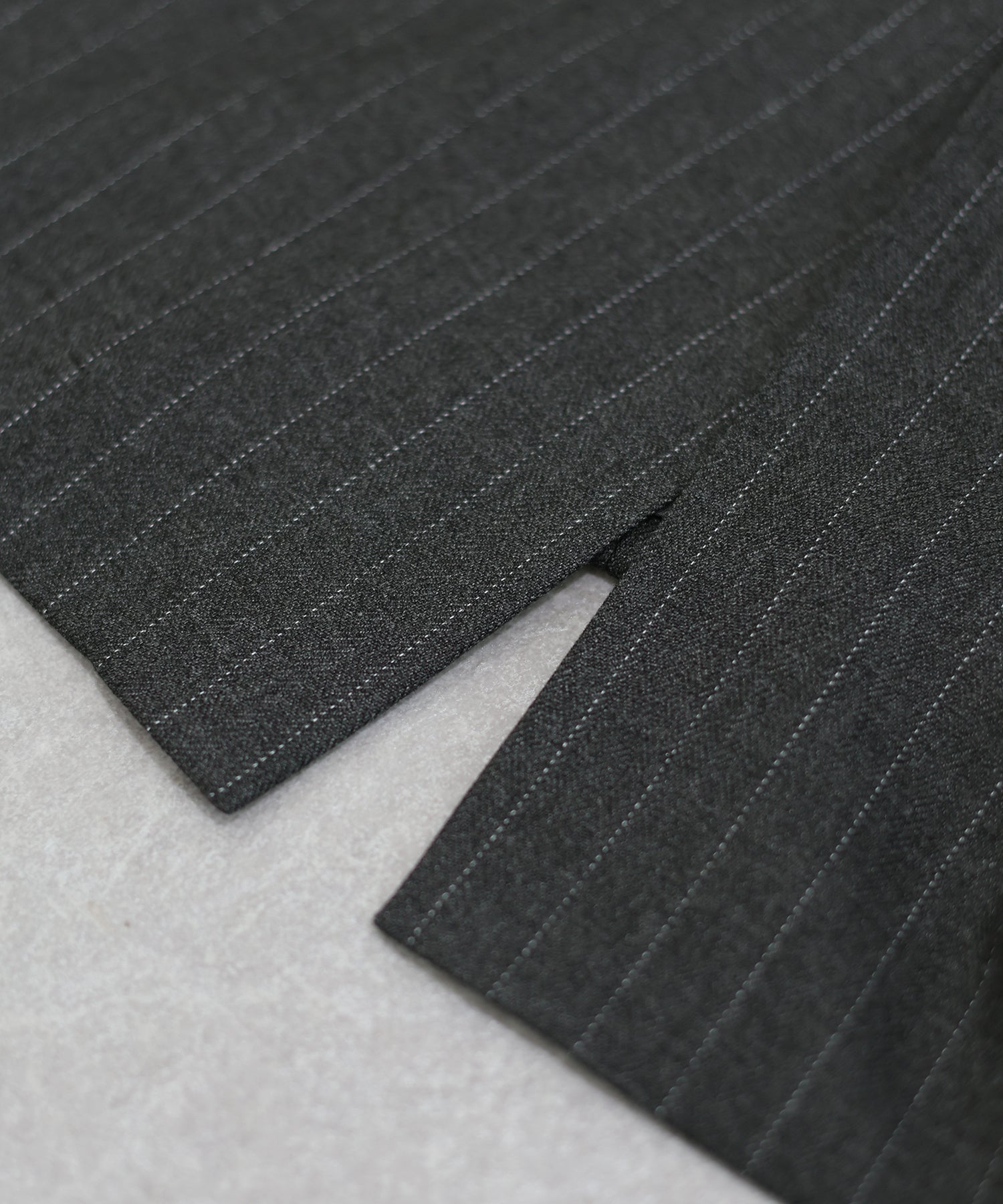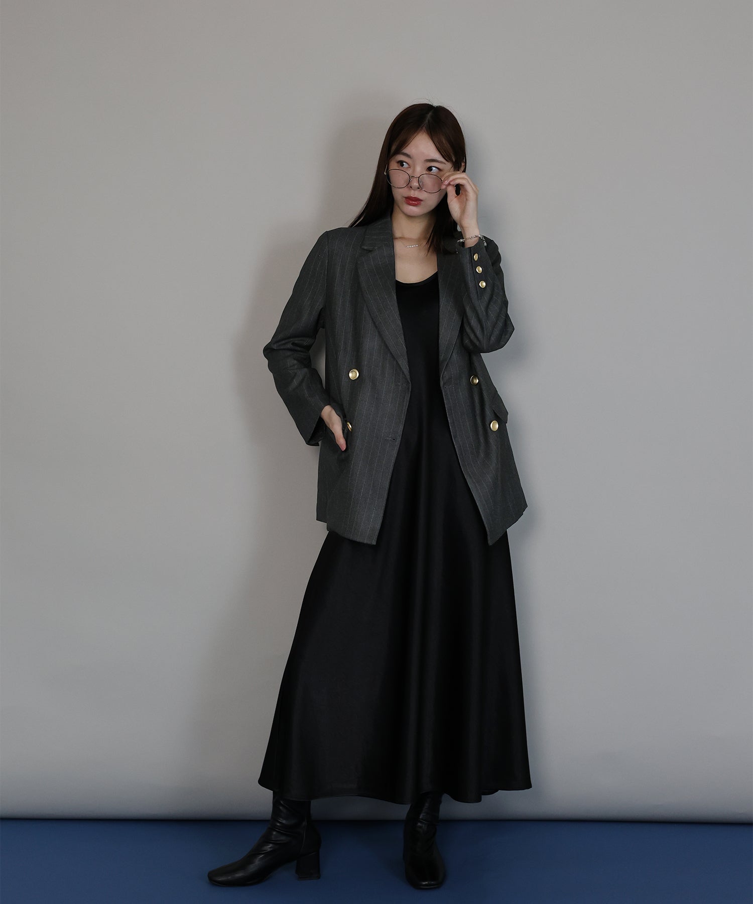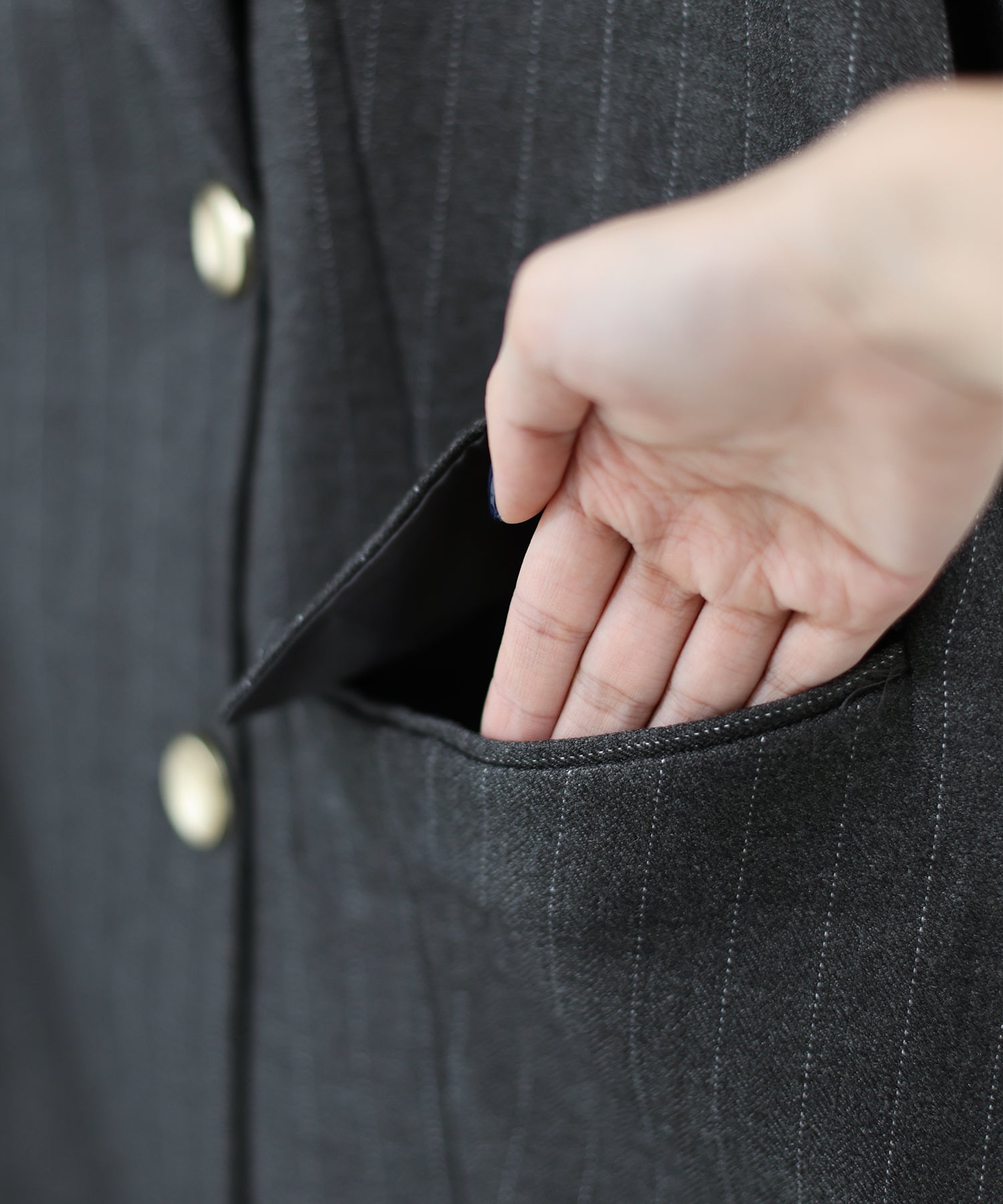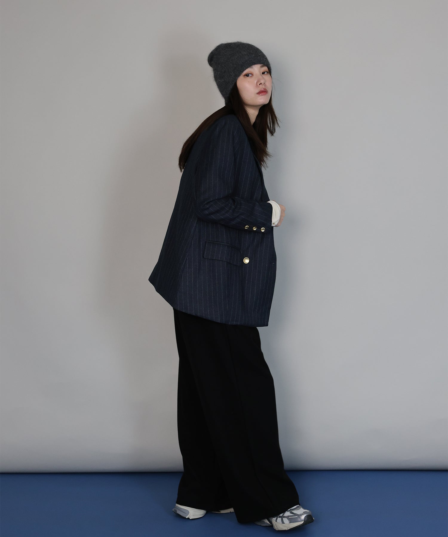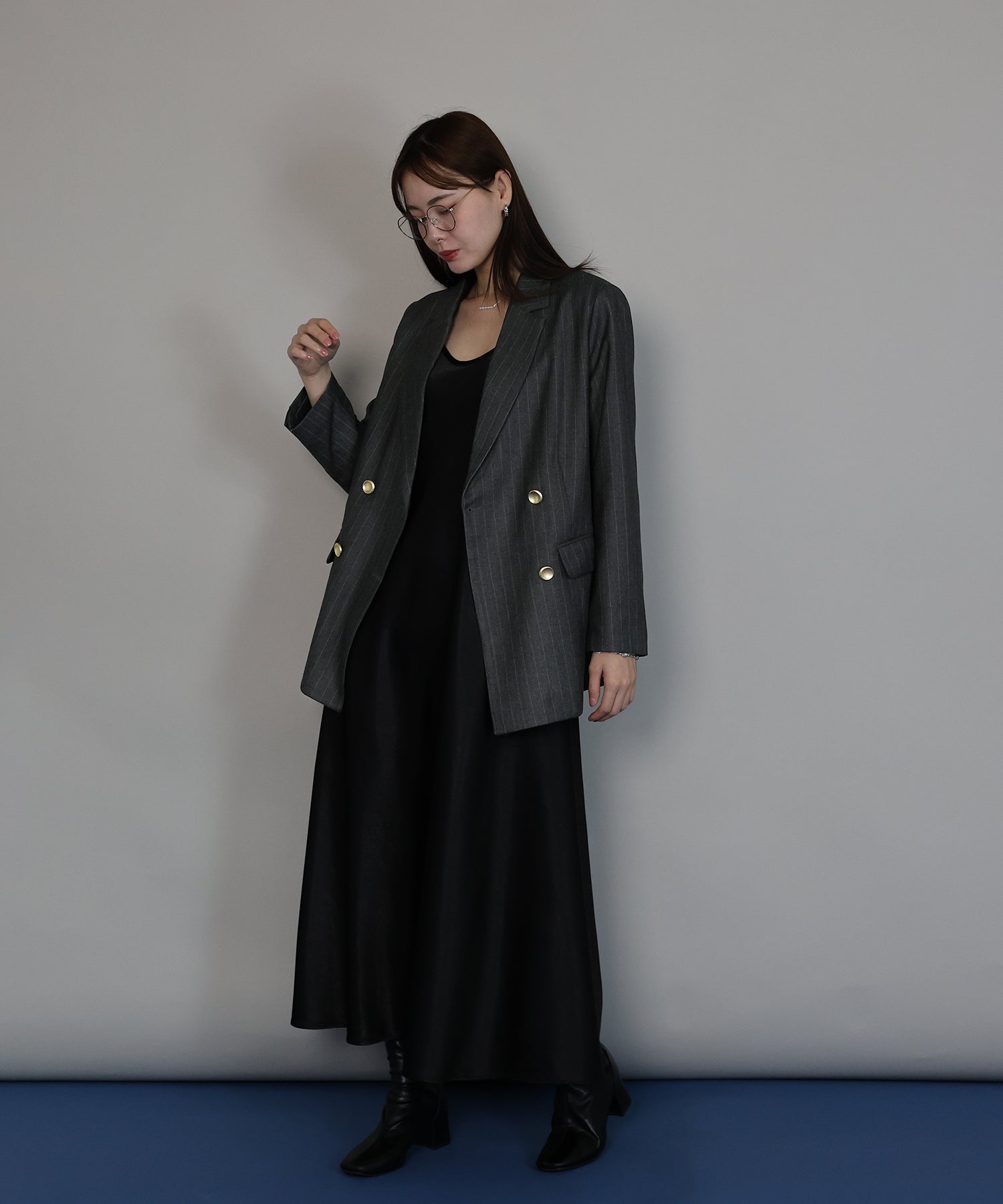 ピンストライプ柄がマニッシュな印象を与えるダブルテーラードジャケット。