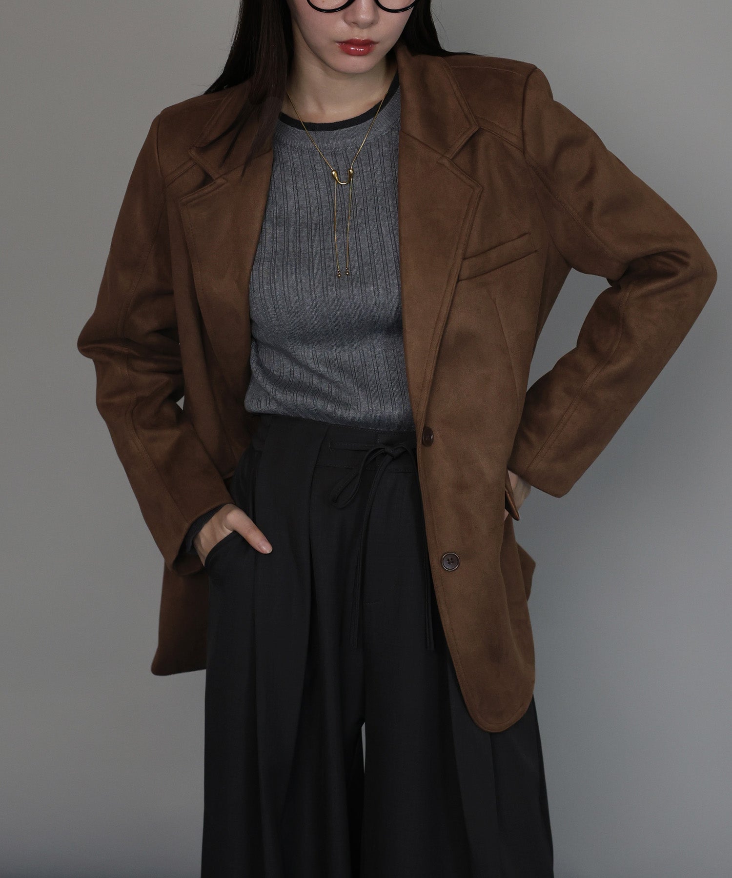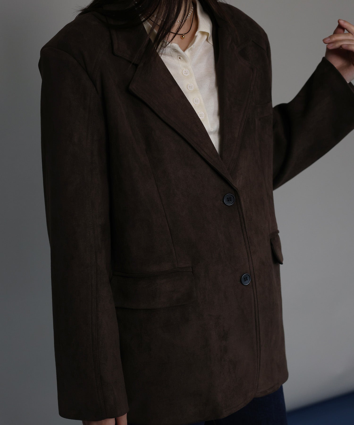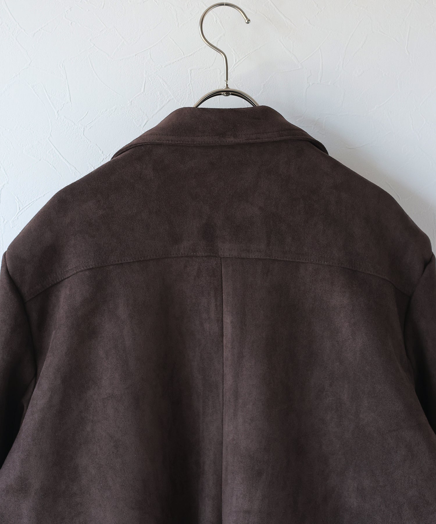 厚みとハリのあるスウェード生地が上品な存在感を放つテーラードジャケット。