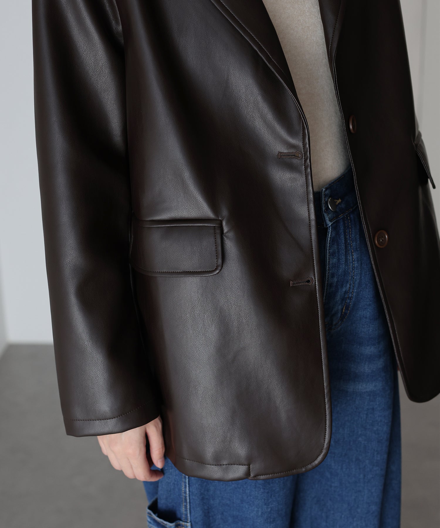 程よい厚みとハリのあるフェイクレザー素材が、上品で洗練された印象を与えるテーラードジャケット。