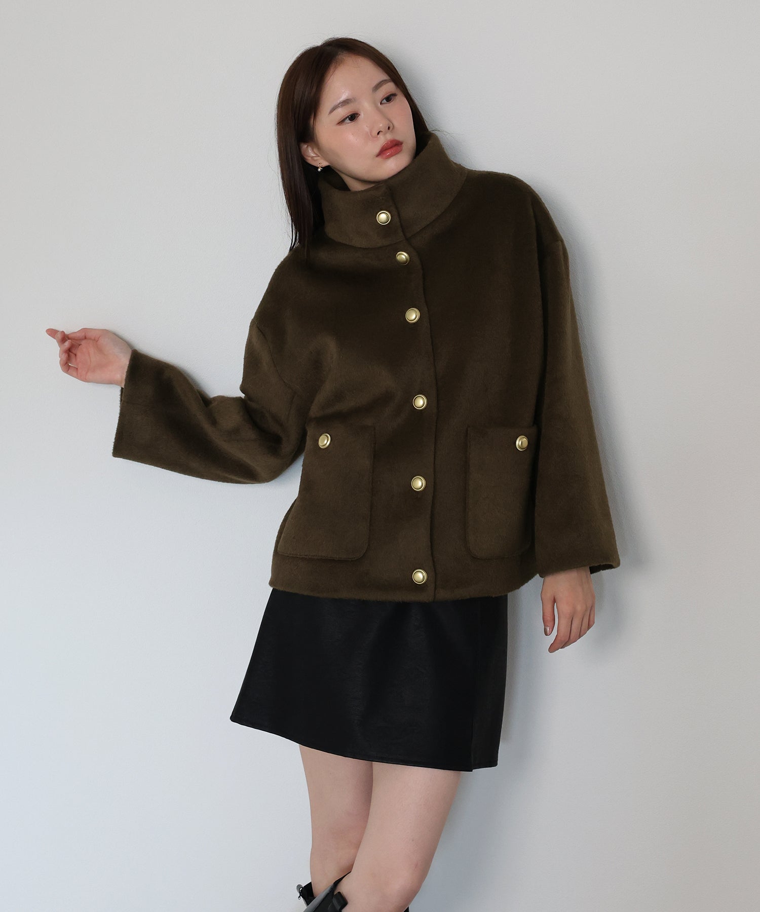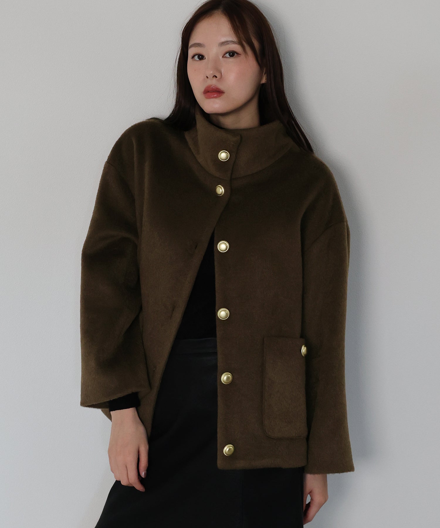 首元にそっと寄り添うスタンドカラーがお洒落なコート。