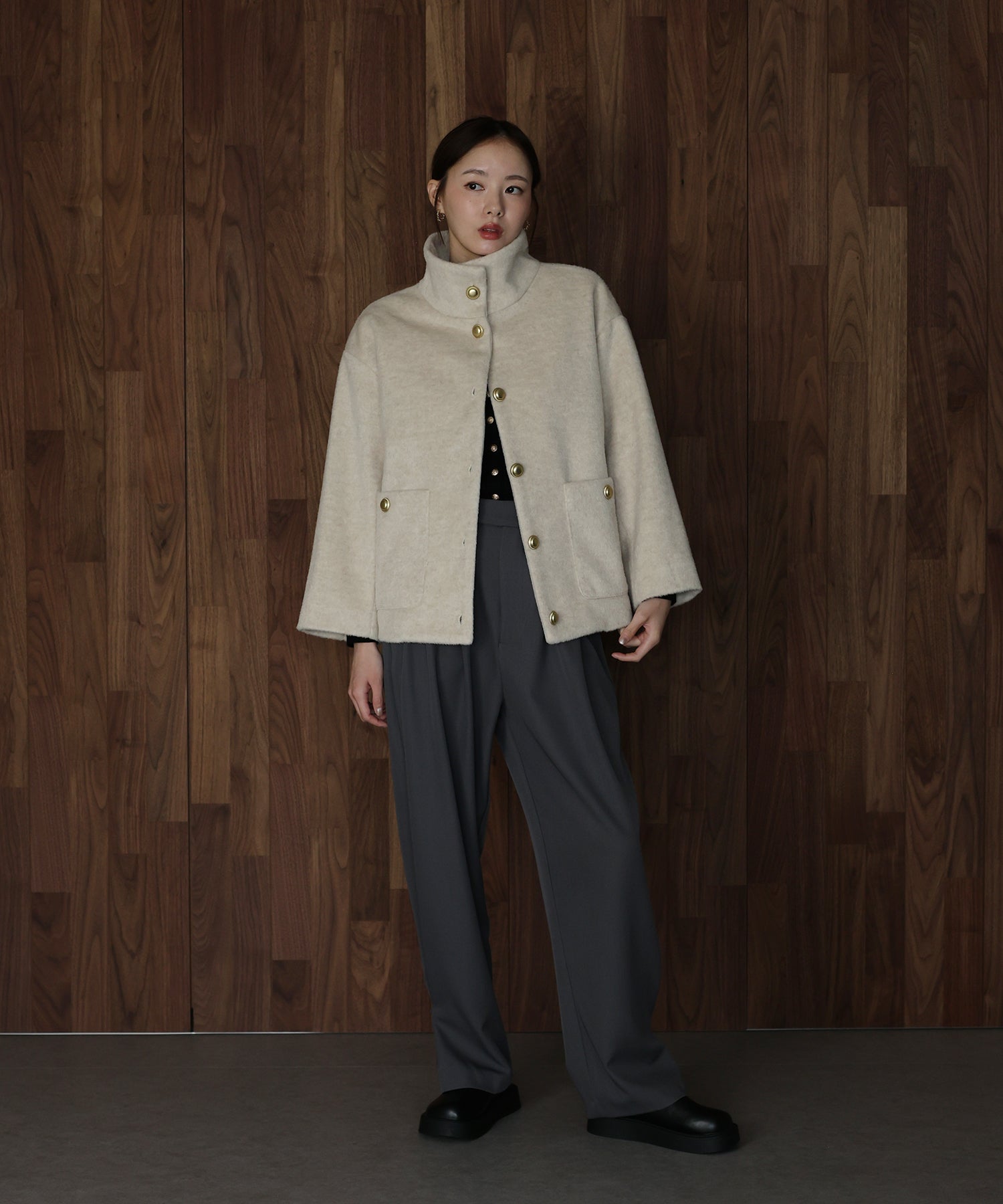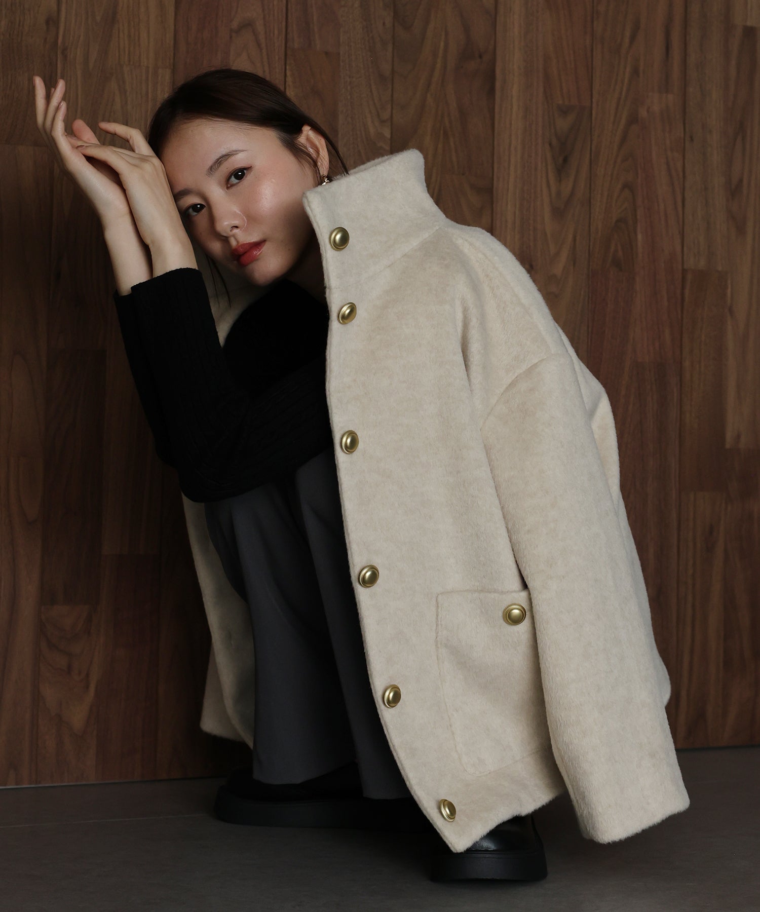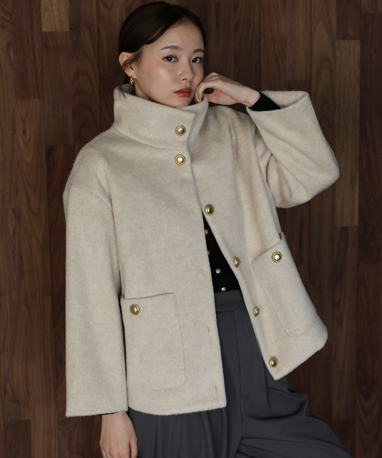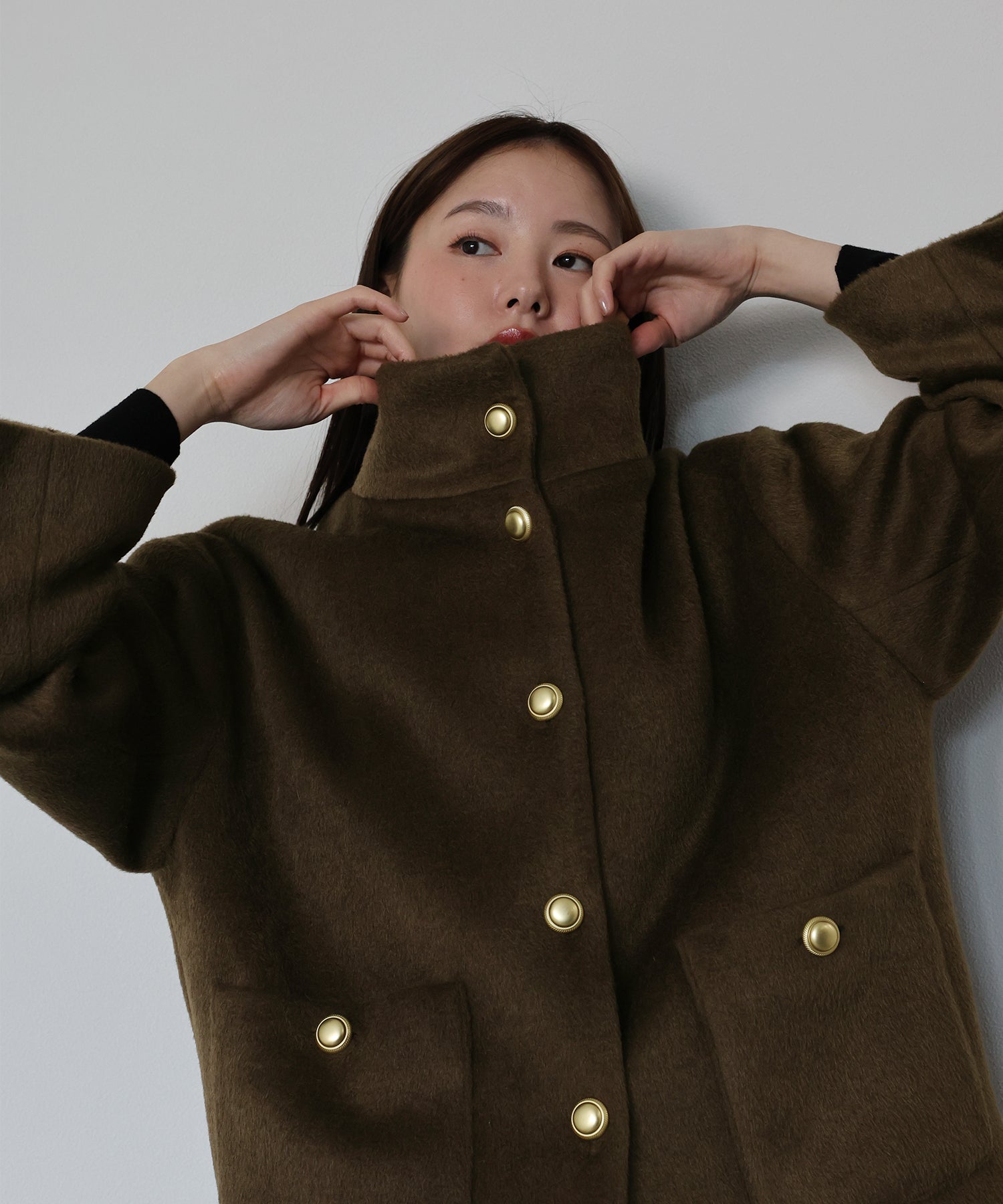柔らかな立ち上がりの襟が顔まわりをふんわりと包み込み、上品で穏やかな雰囲気を引き立ててくれます。