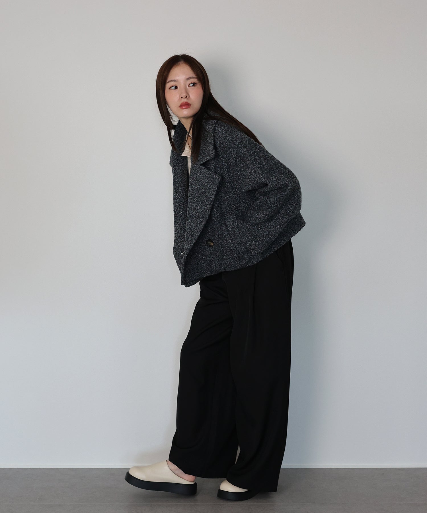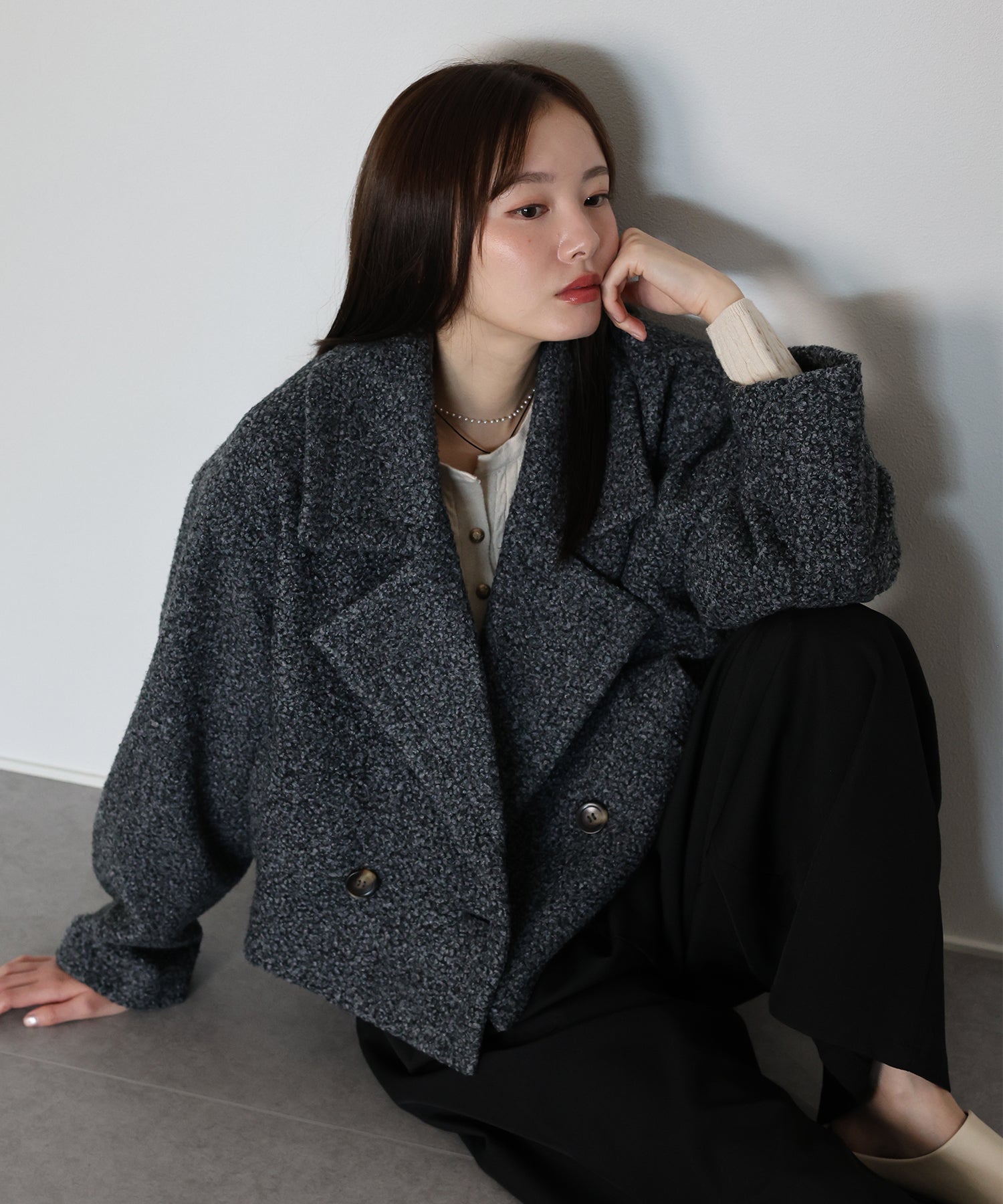大きめのテーラード襟が印象的で、顔まわりに華やかさとこなれ感をプラスします。