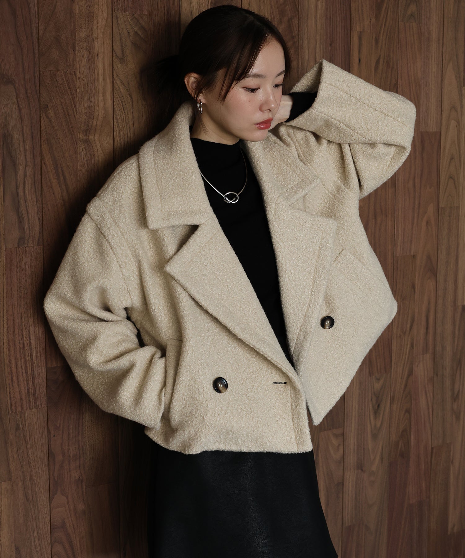 柔らかく、ふわふわとしたプードルボア素材がシーズンムードを高めるショートコート。