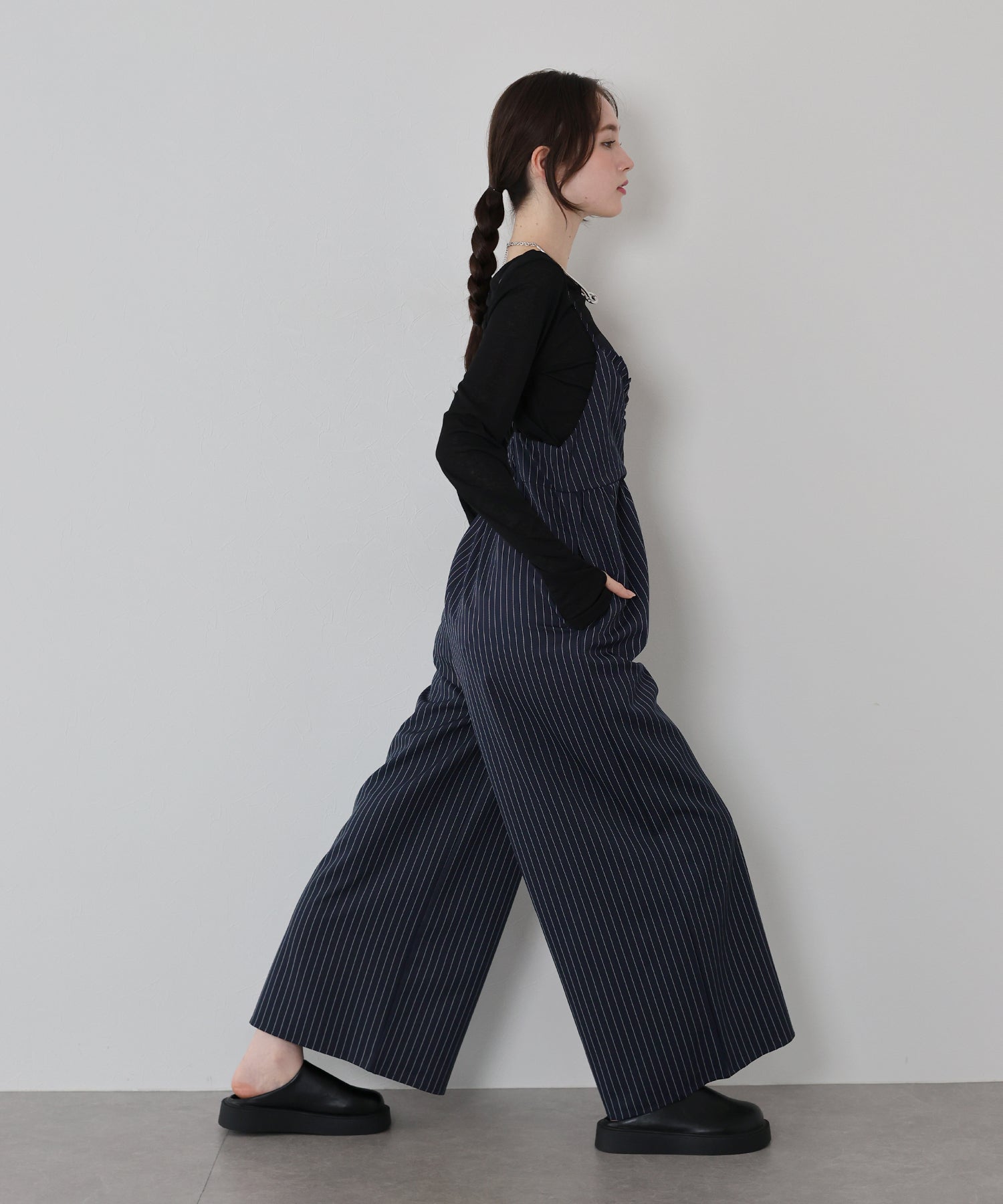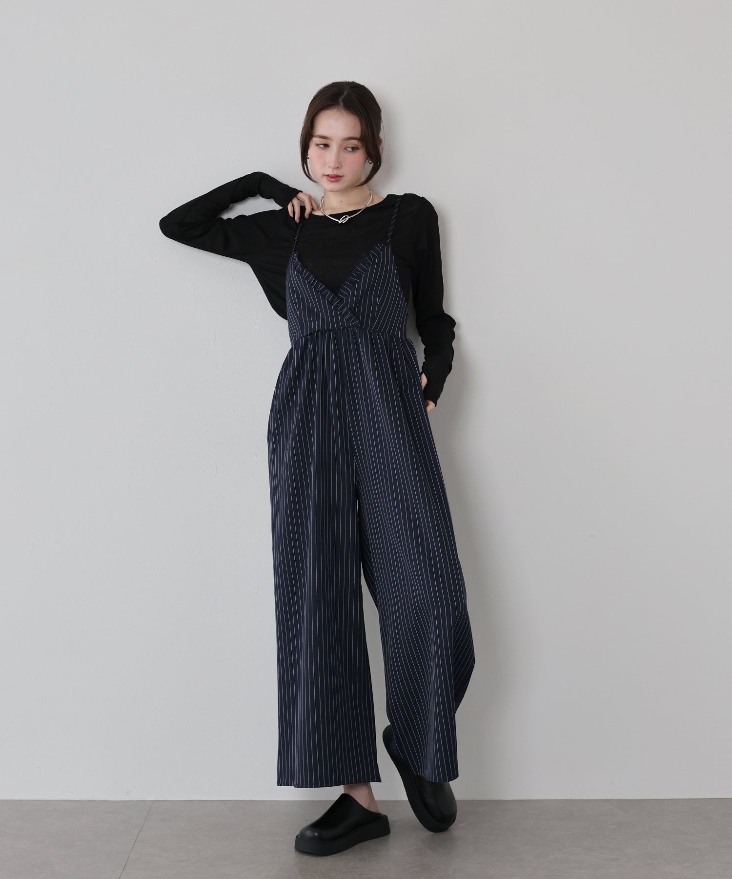 ピンストライプ柄でスタイリッシュな印象を与えるオールインワン。