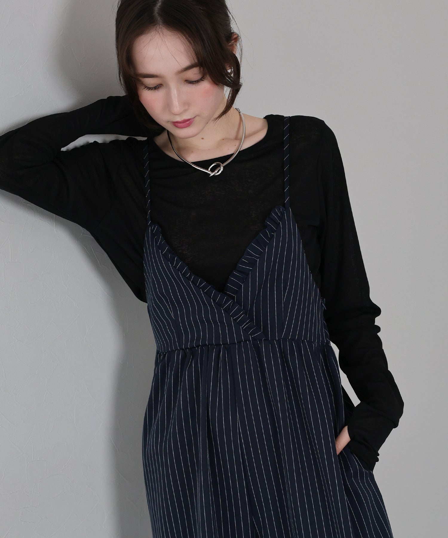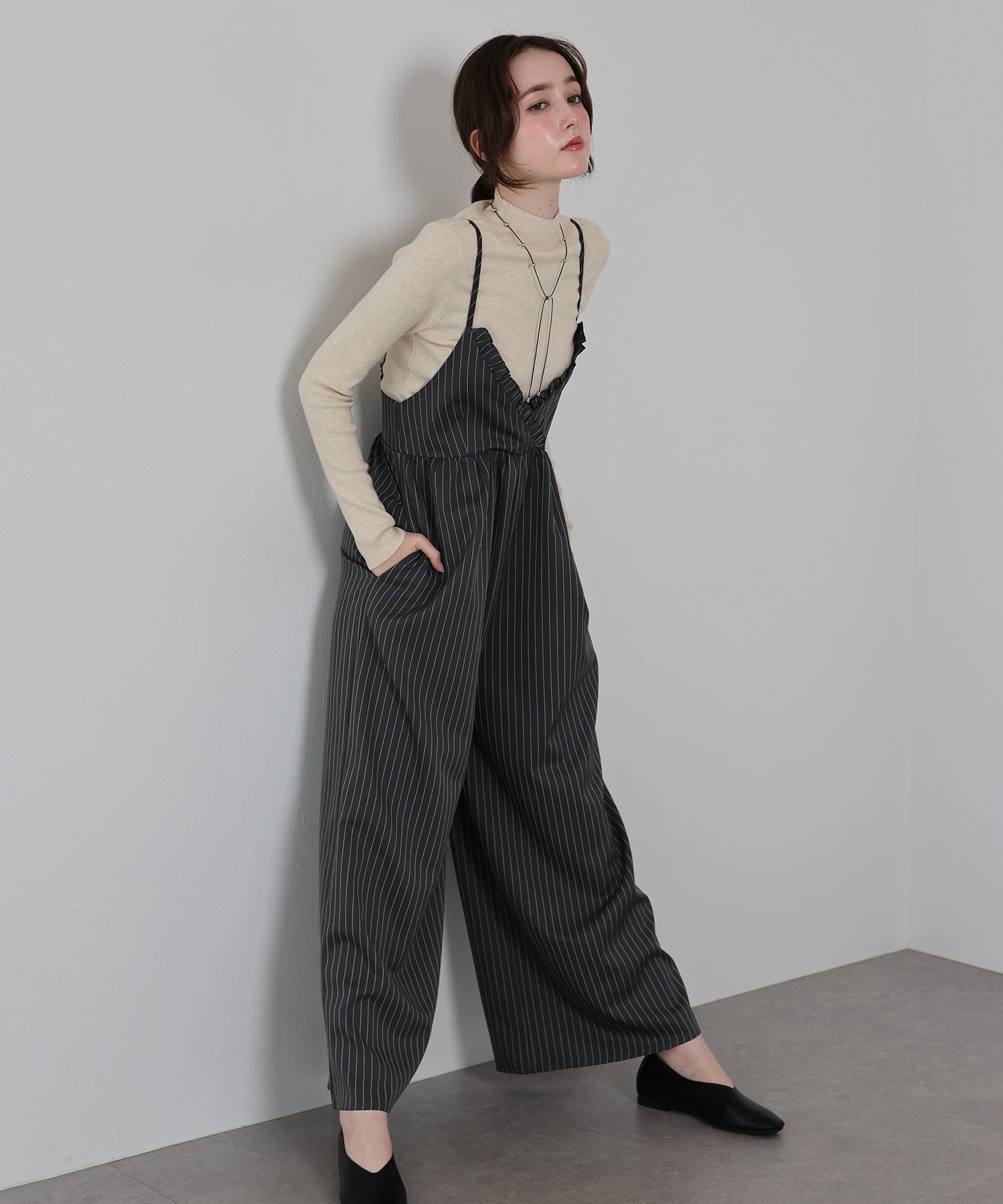 ピンストライプ×フリルが映える上品モードなオールインワン
