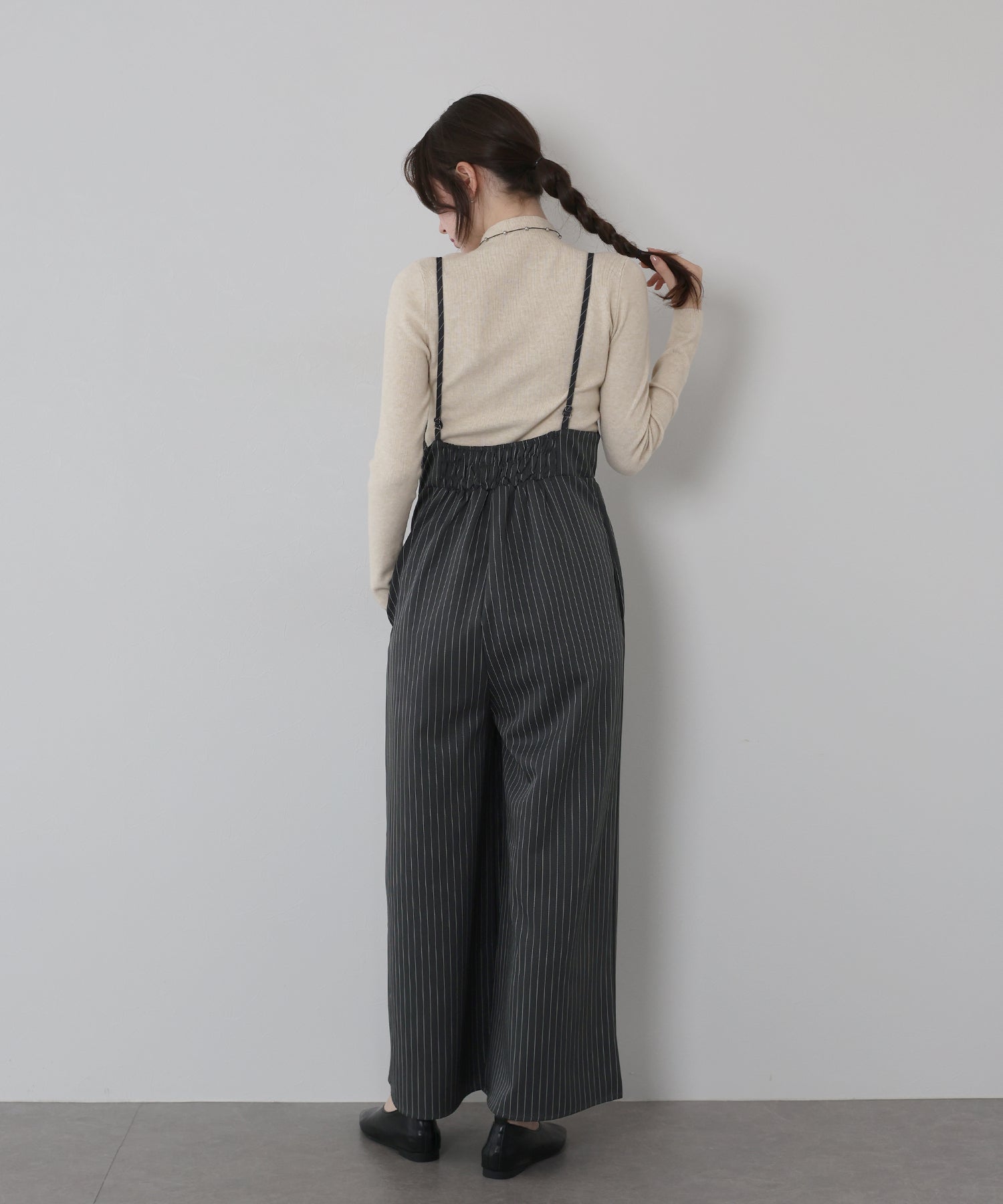 パンツ部分はややワイドめのラインで、脚のラインを拾わずすっきりと縦長シルエットを強調。