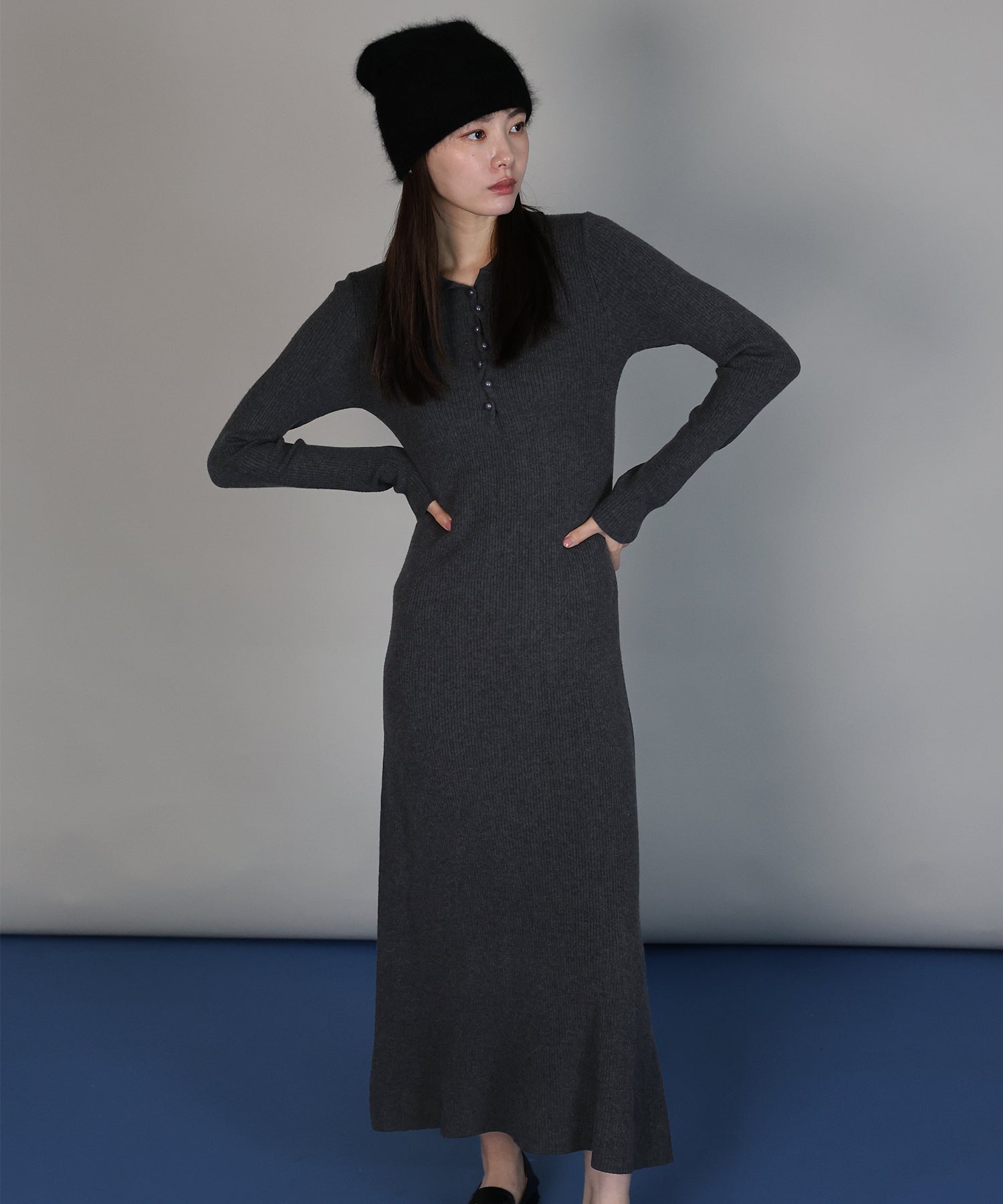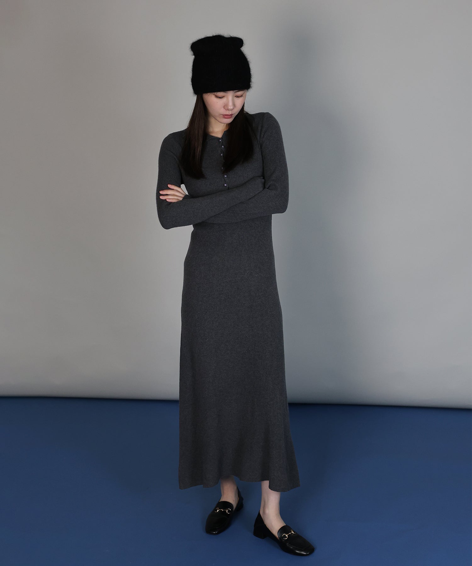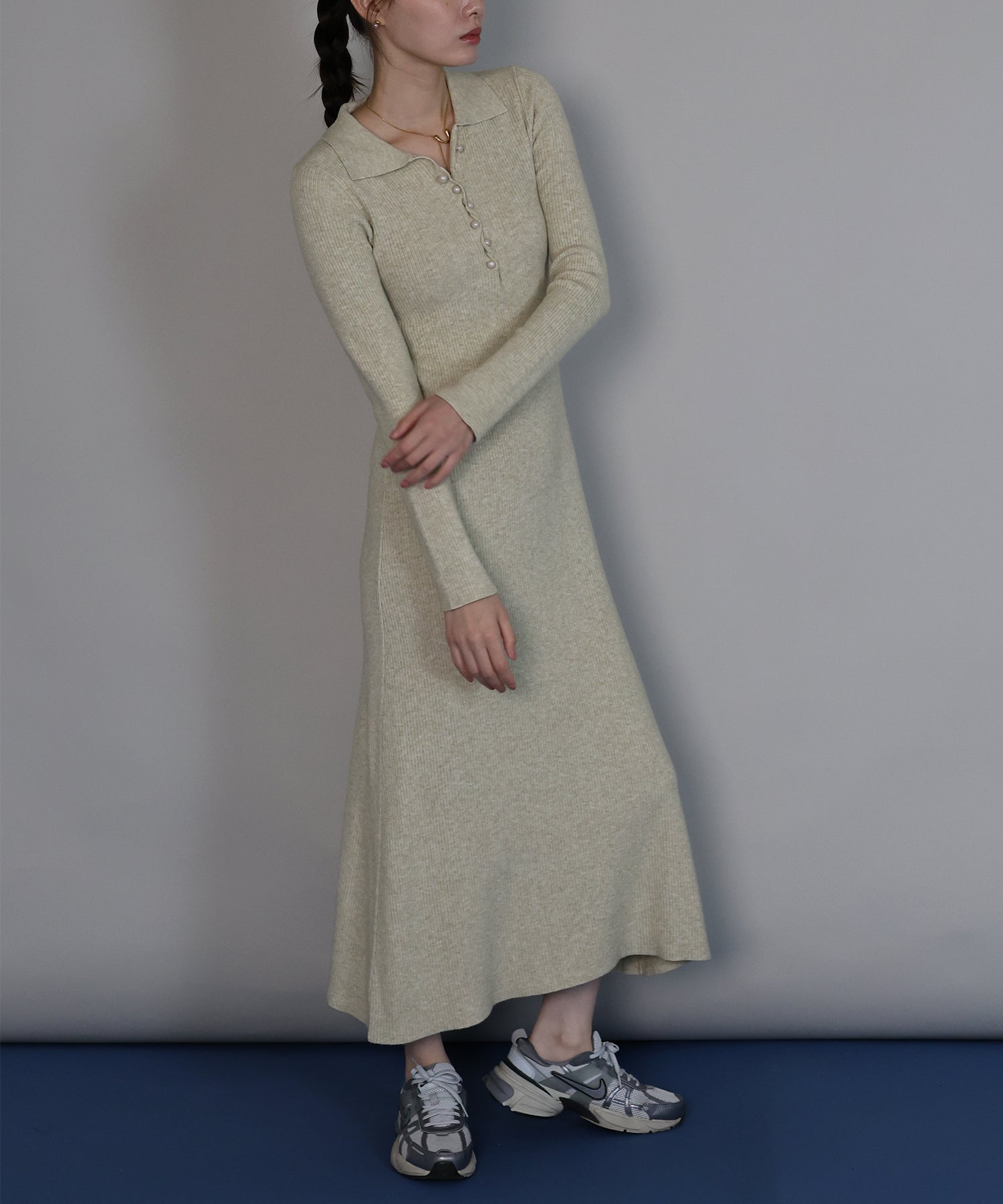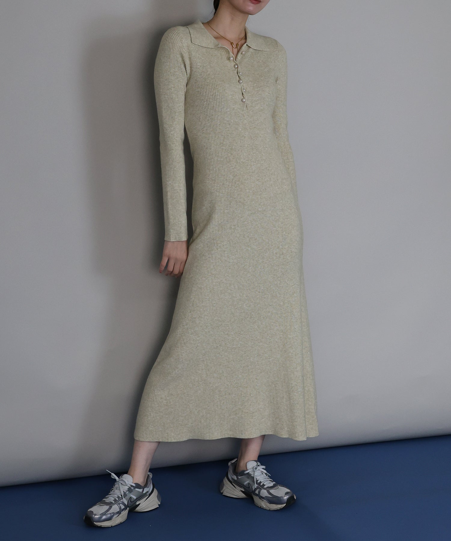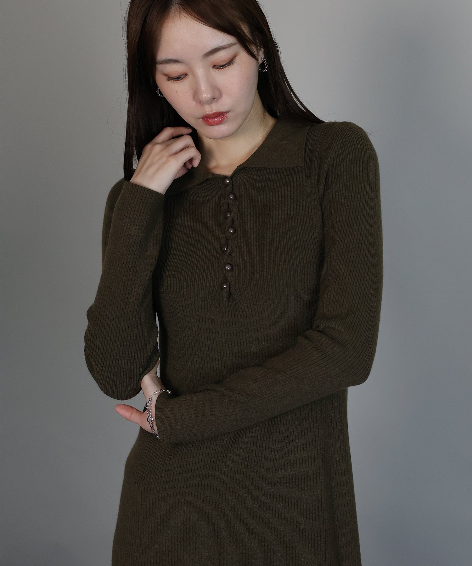 交互に配置されたデザインボタンが目を引くロングニットワンピース。