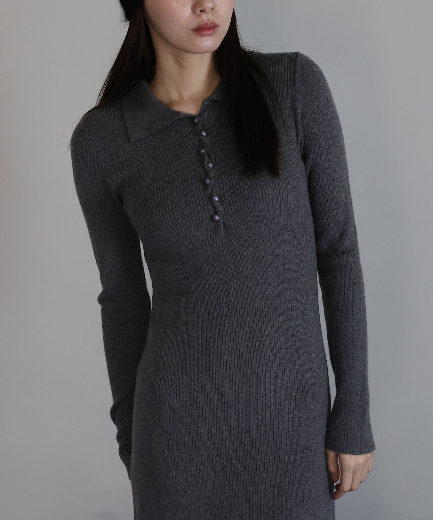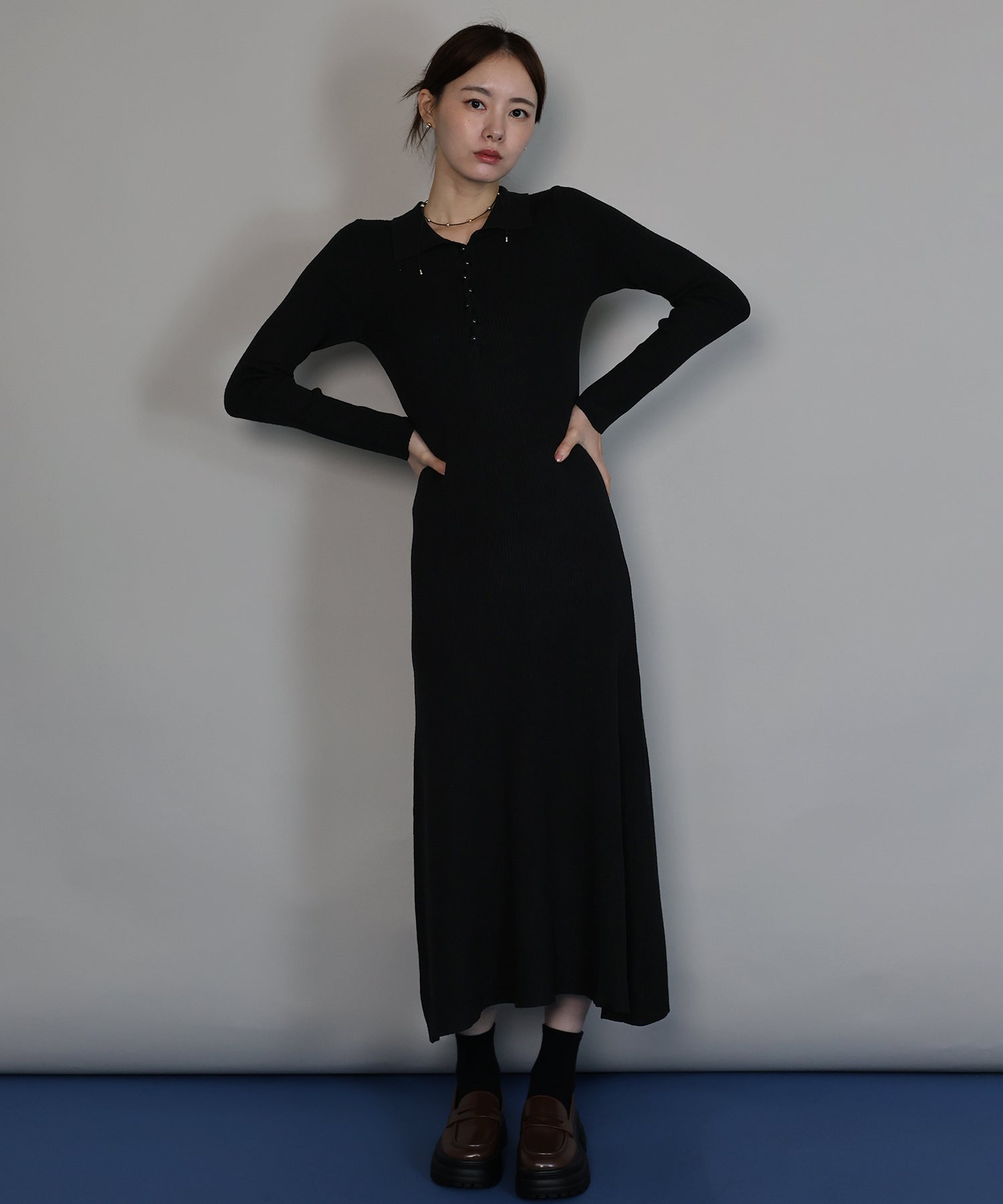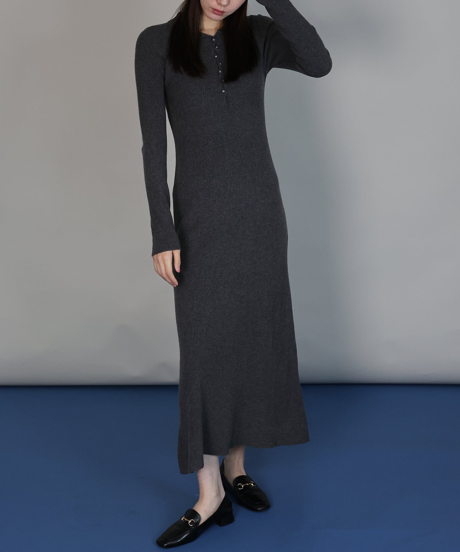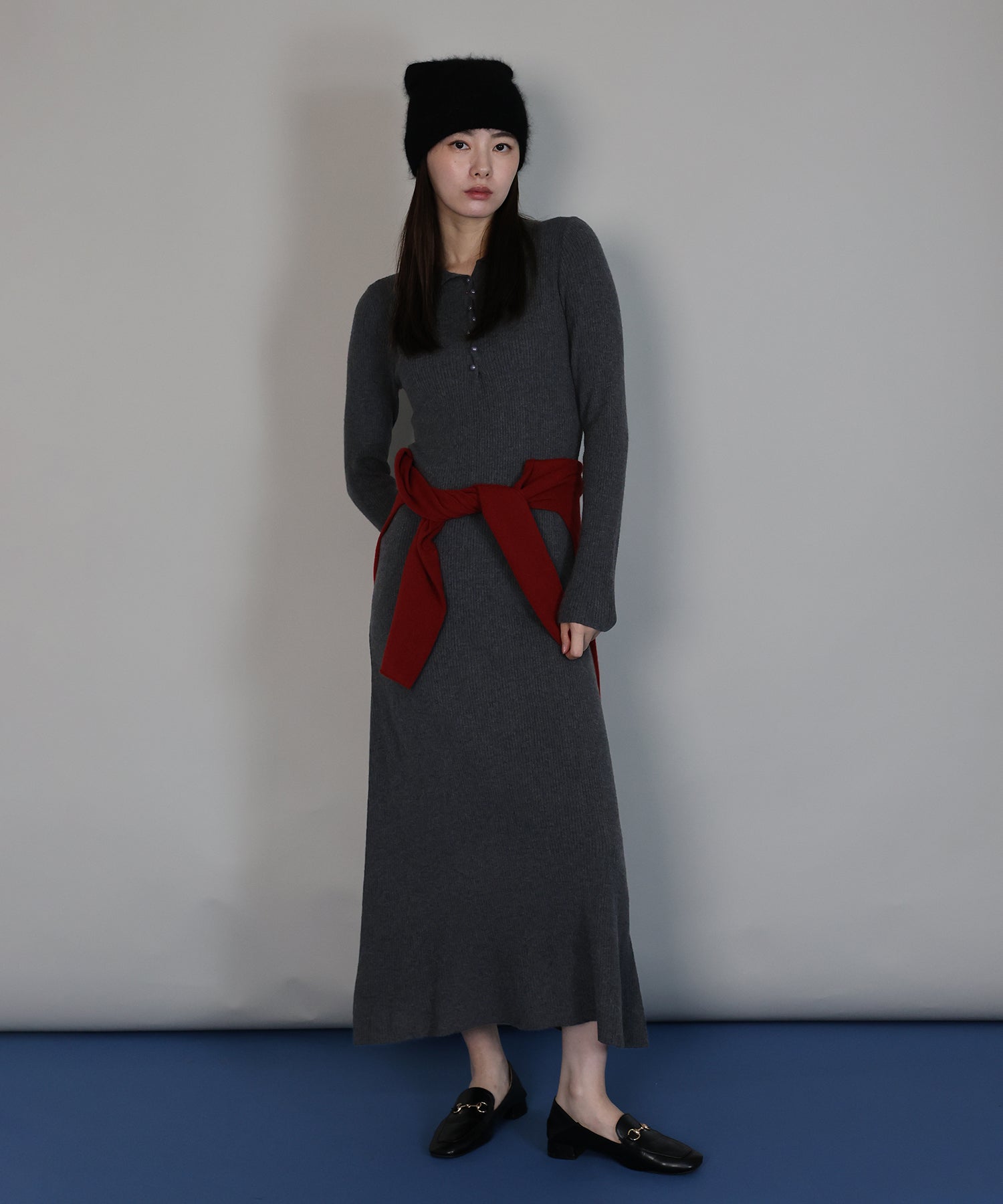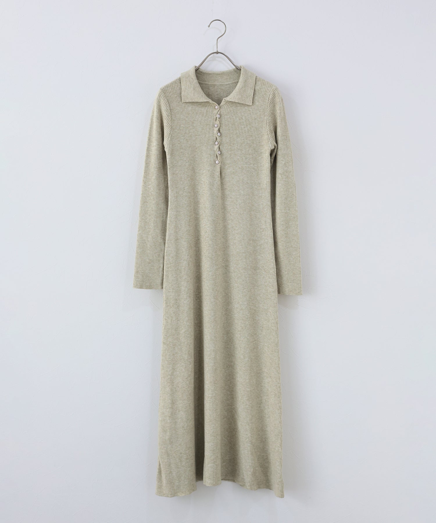 交互に配置されたデザインボタンが目を引くロングニットワンピース。