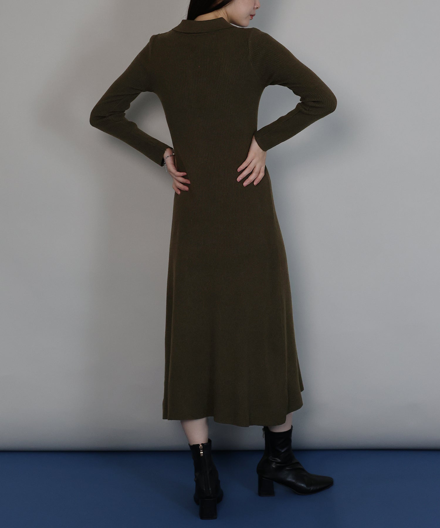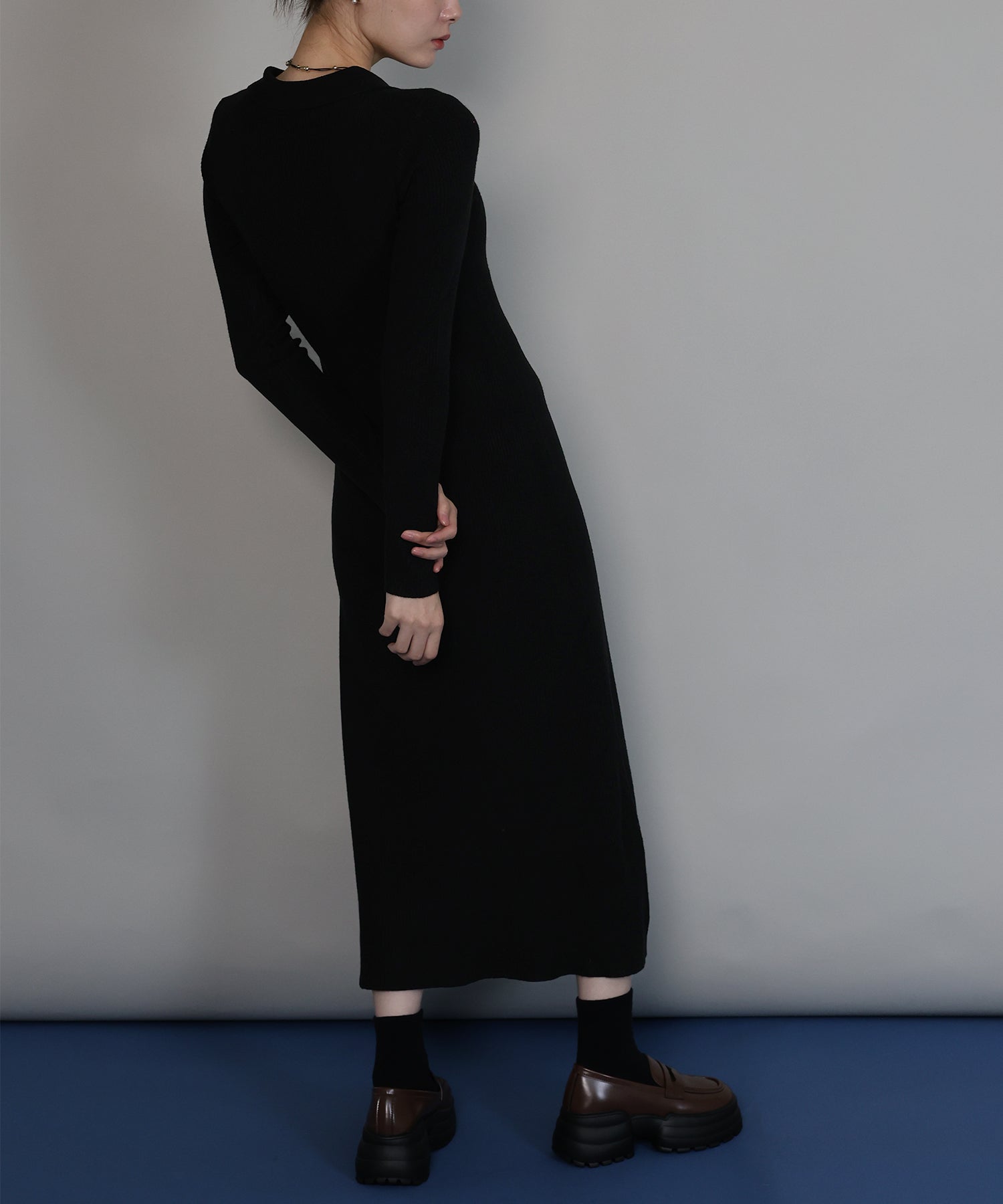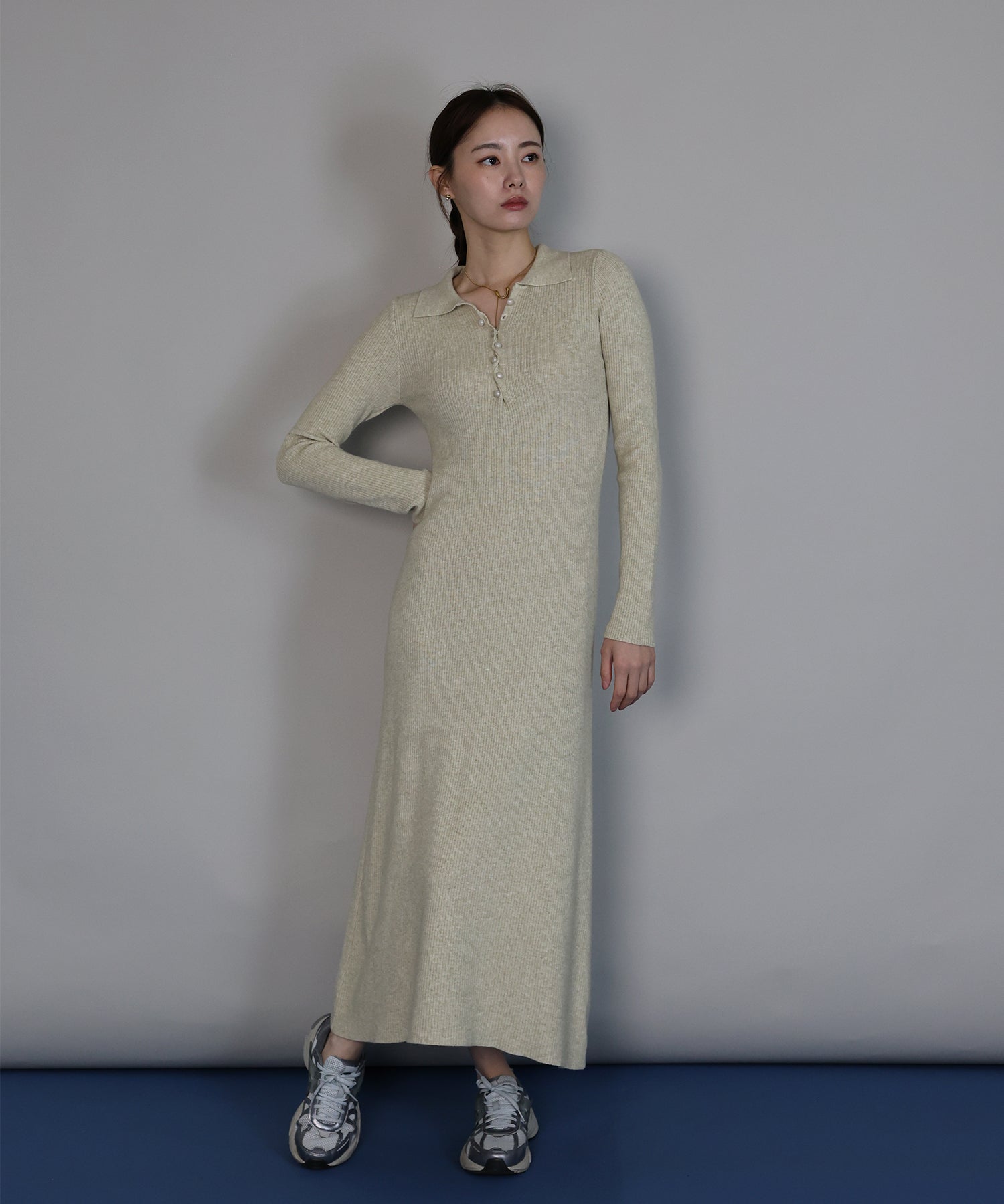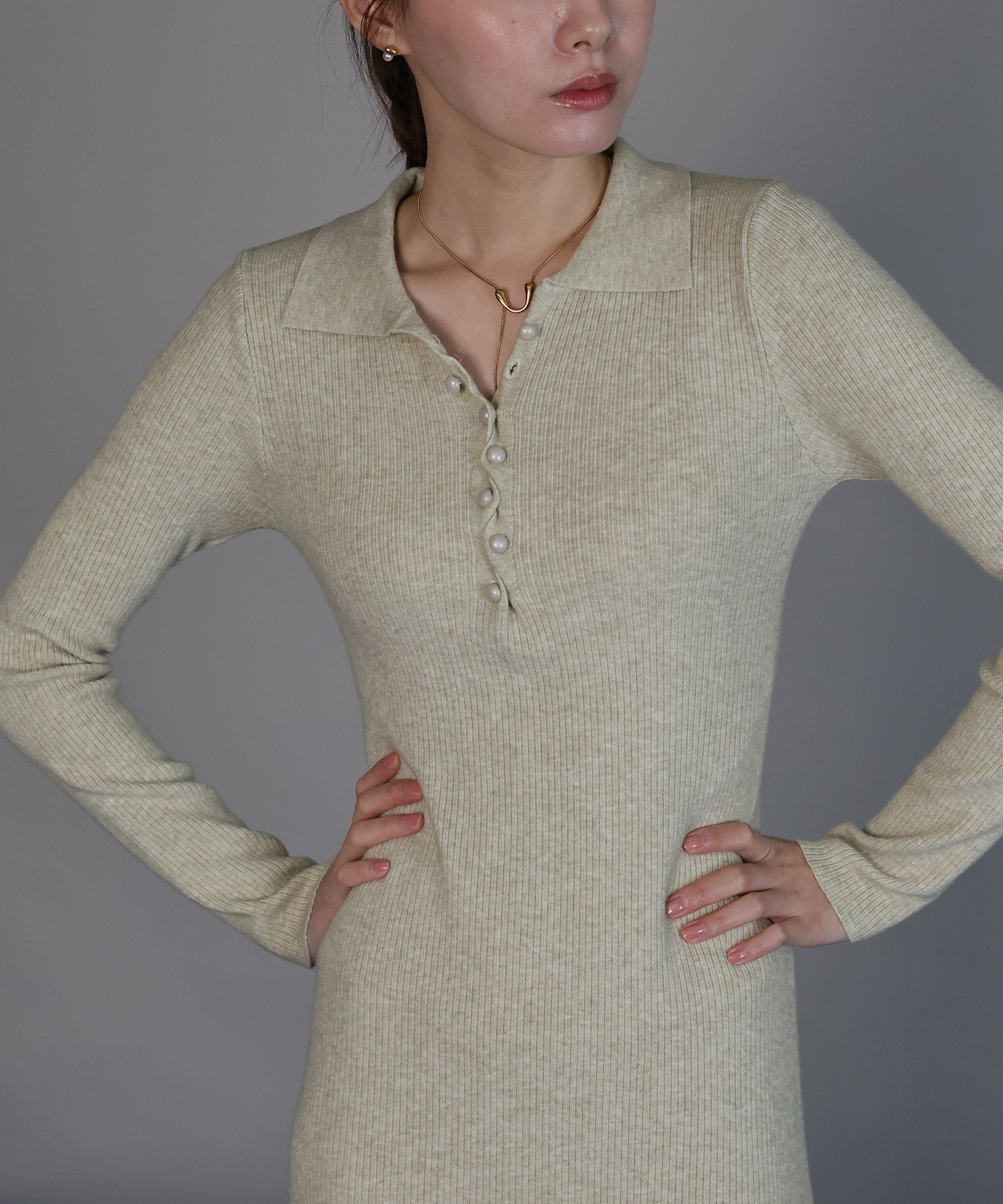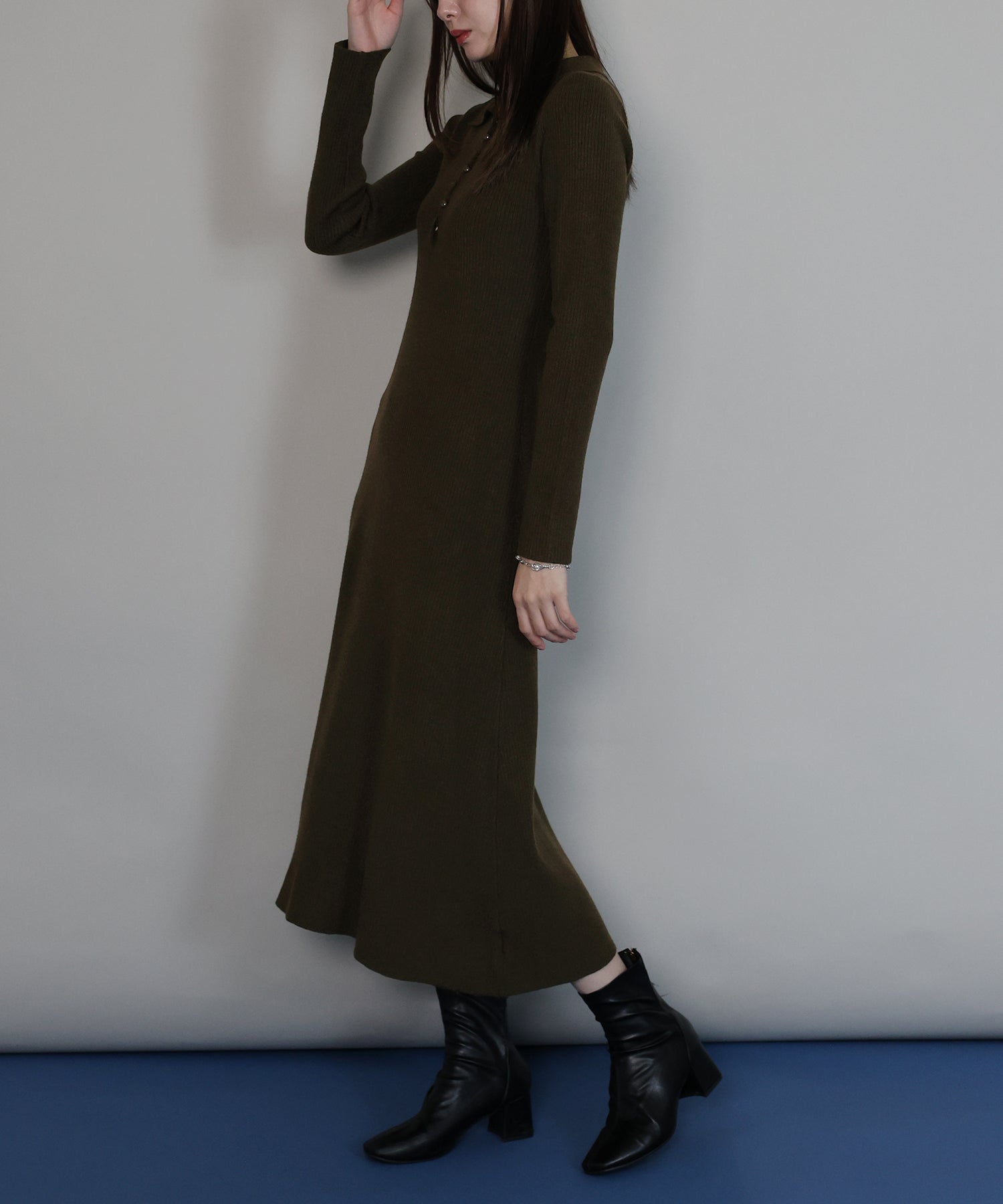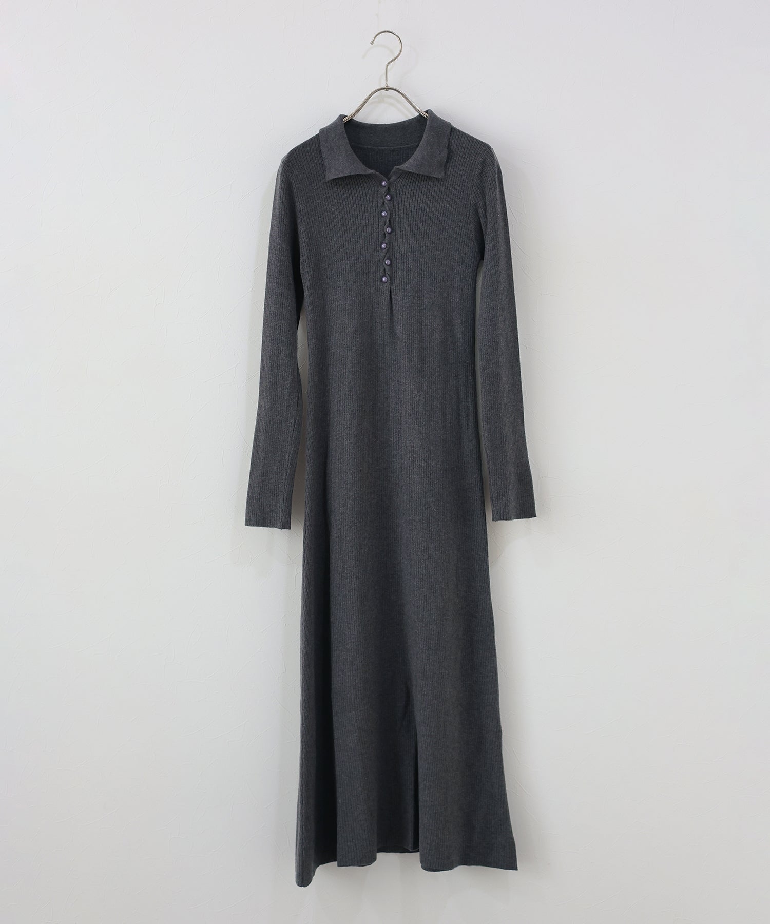 交互に配置されたデザインボタンが目を引くロングニットワンピース。