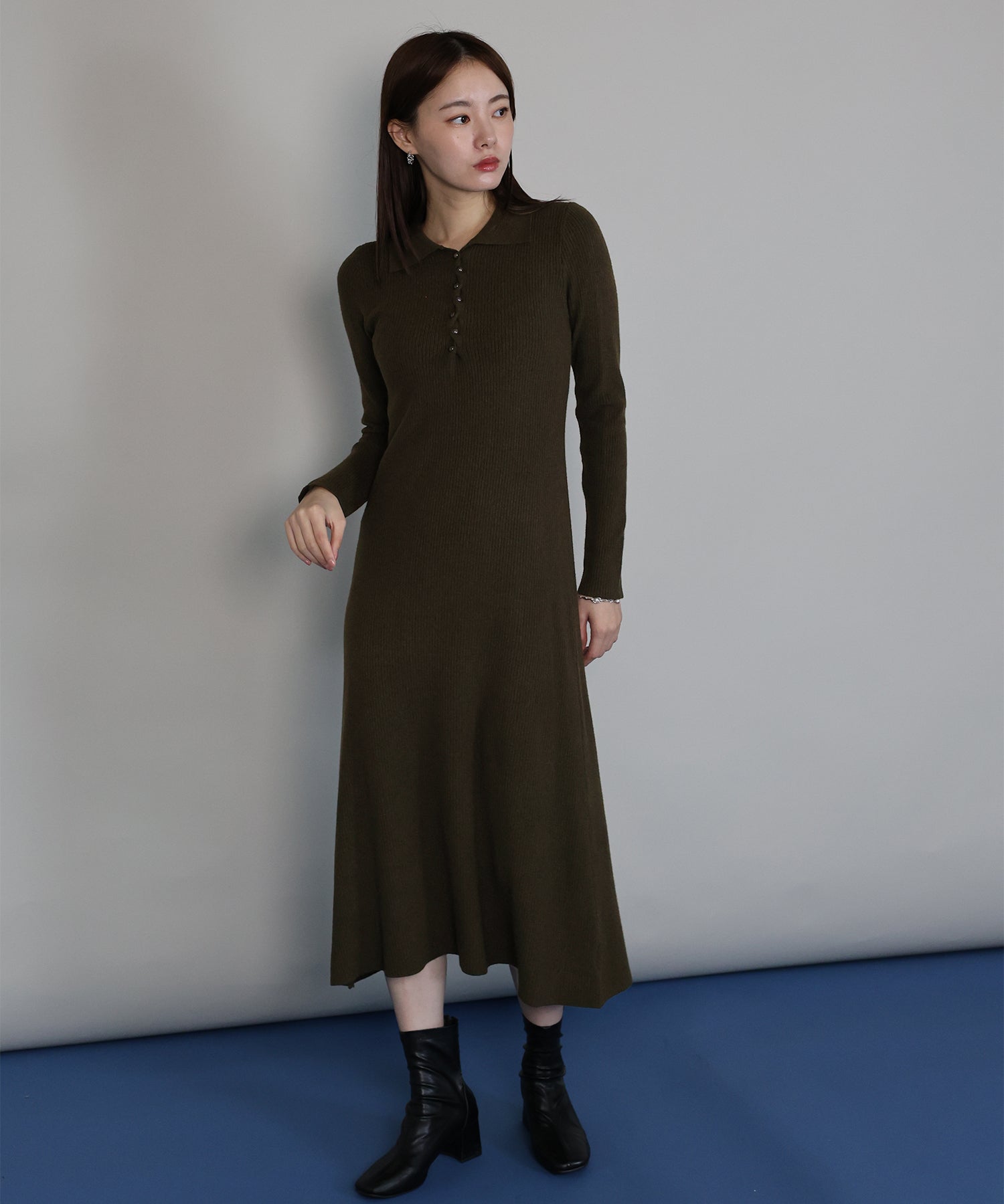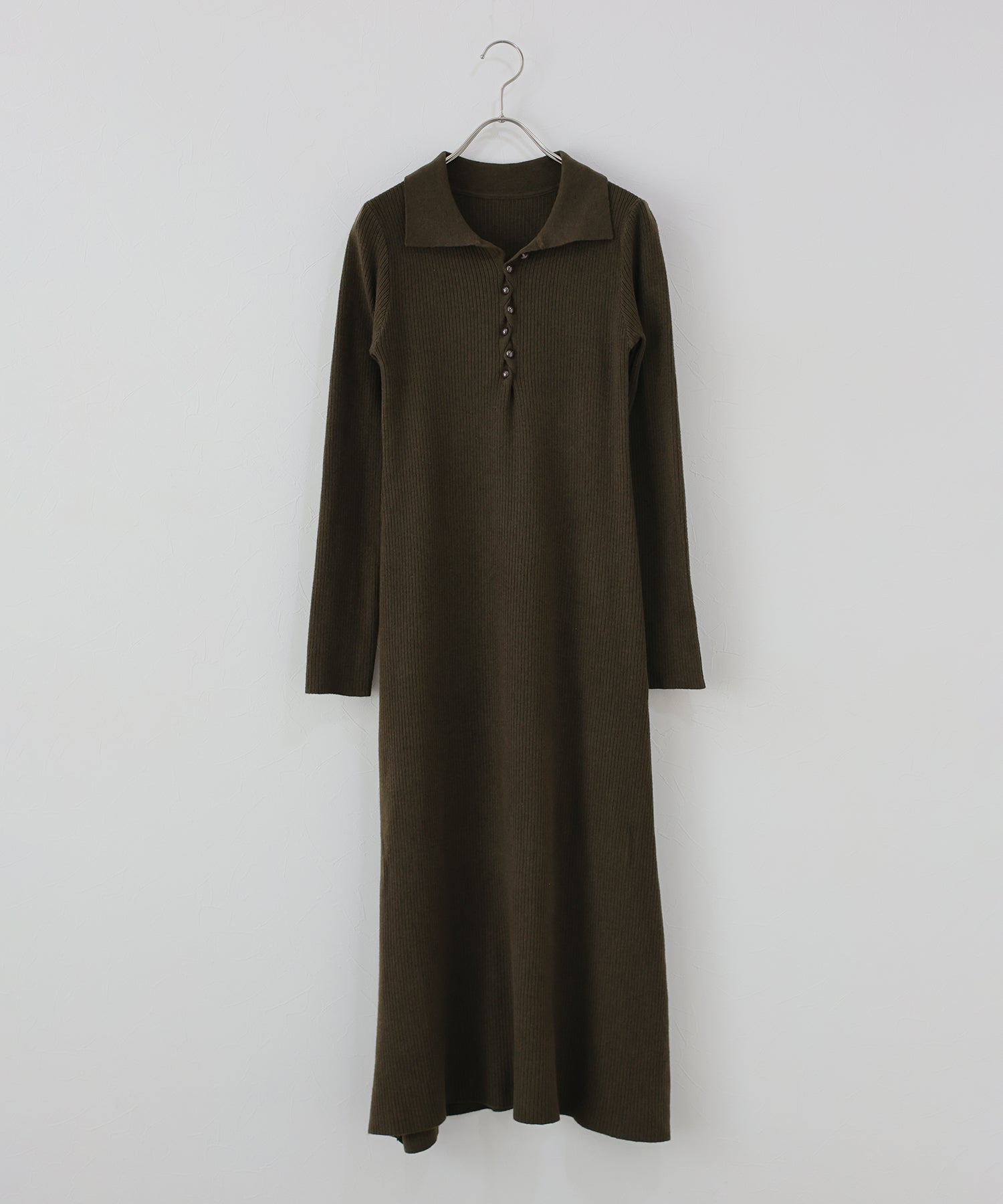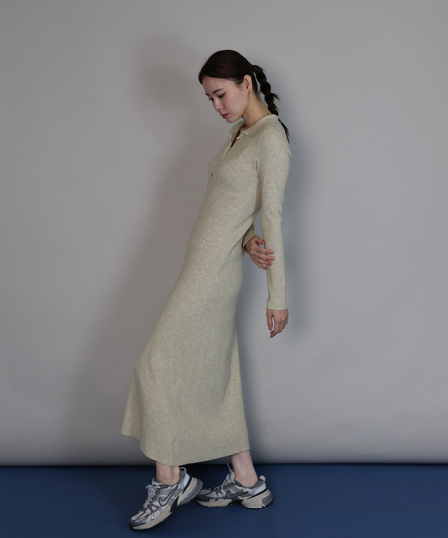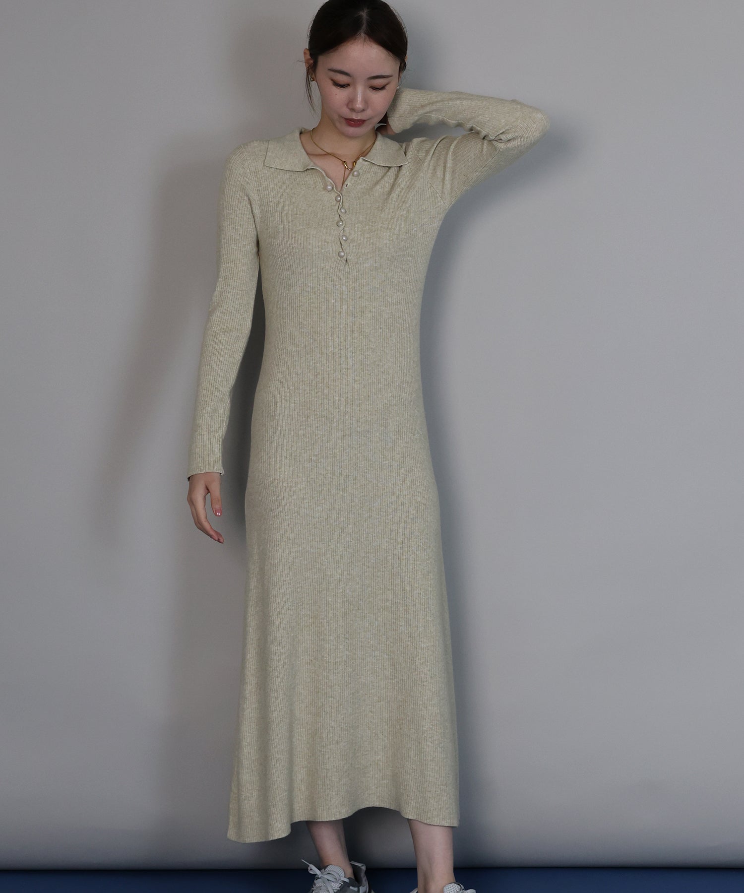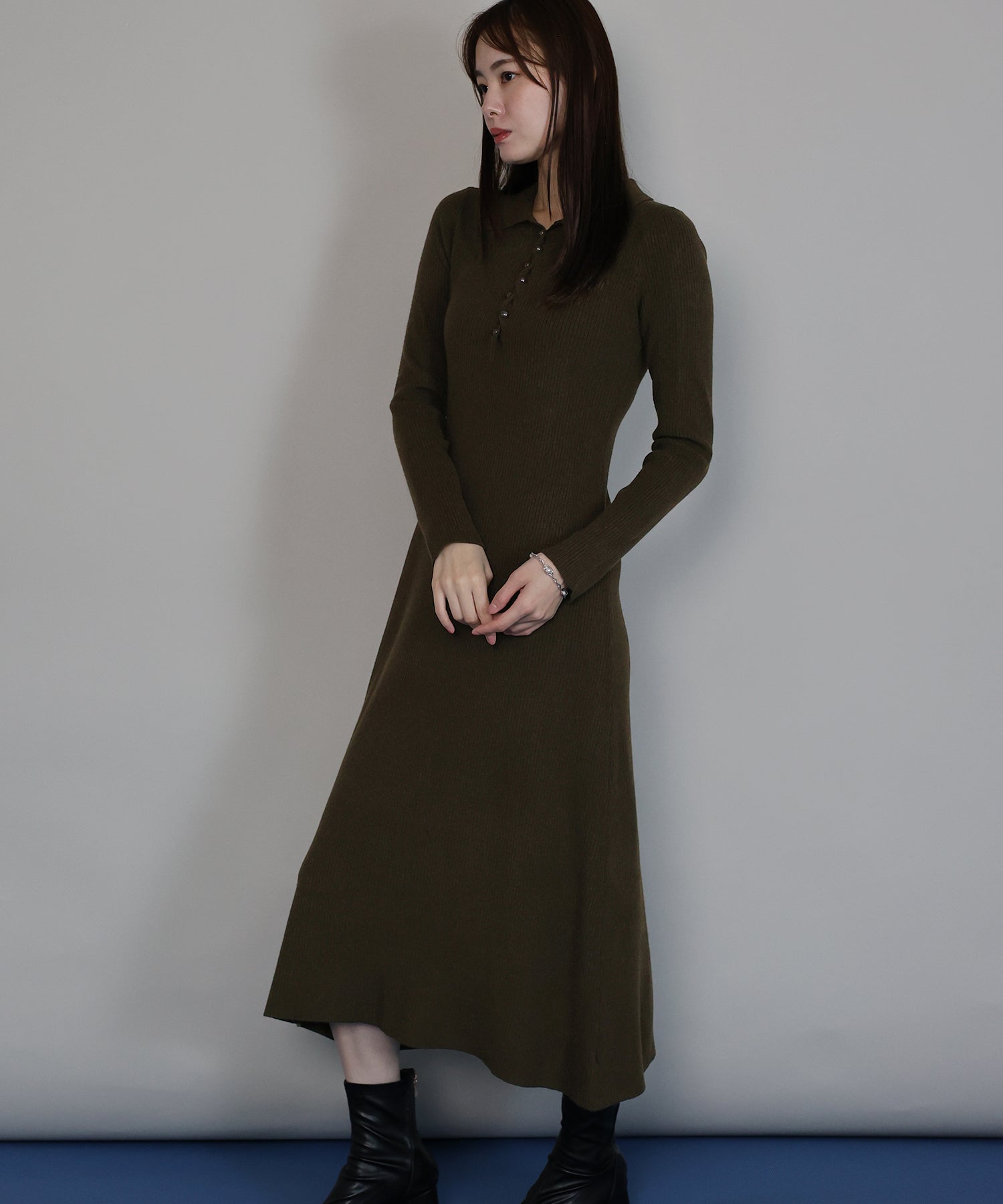 交互に配置されたデザインボタンが目を引くロングニットワンピース。