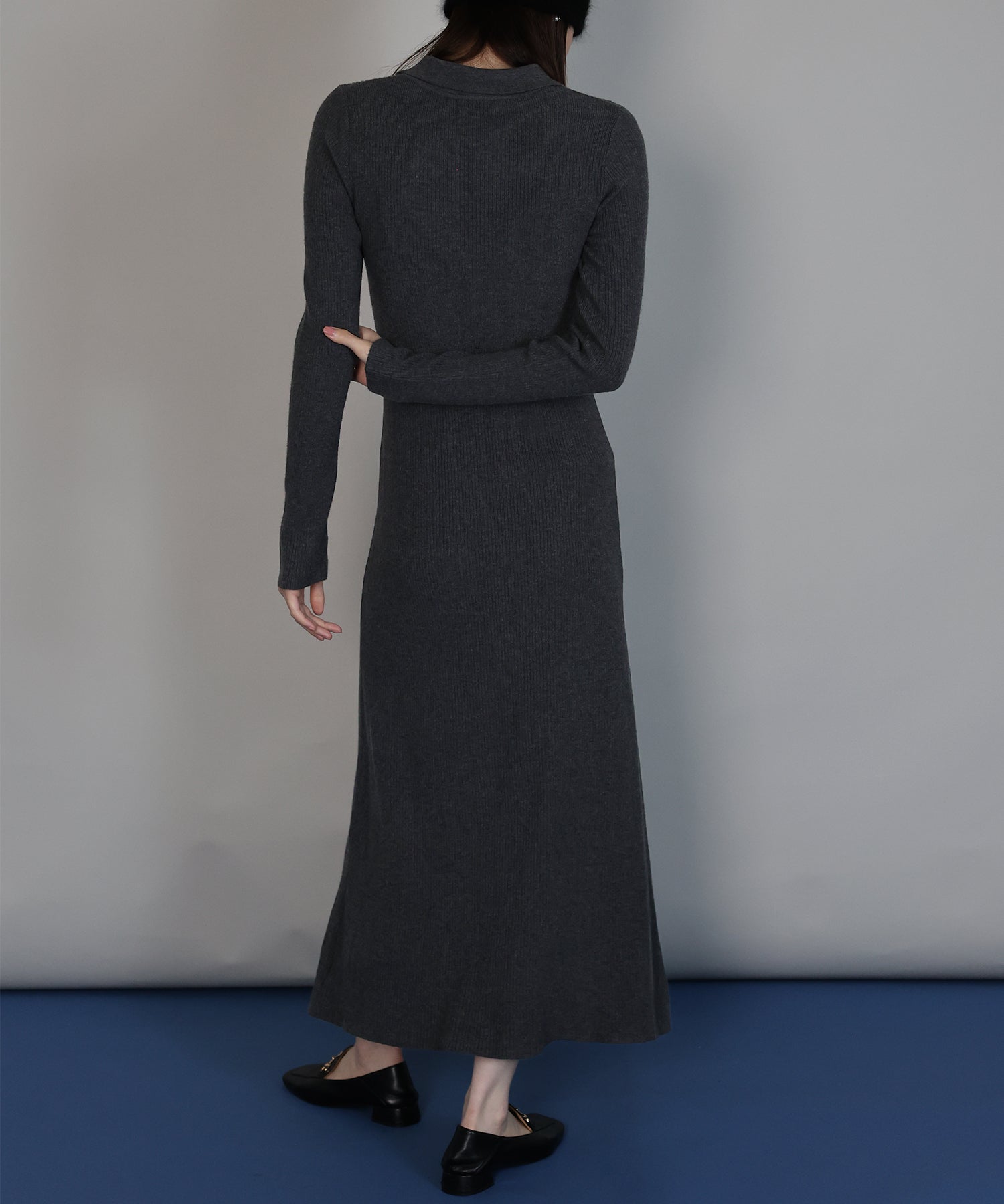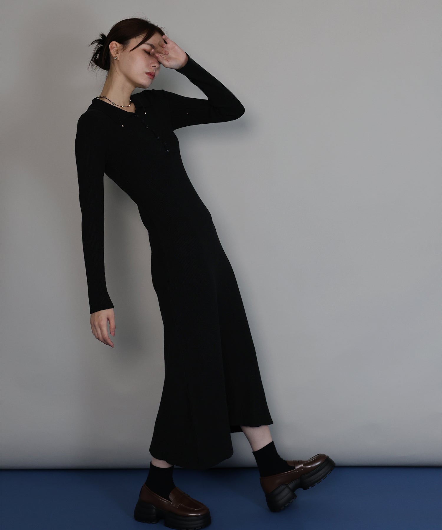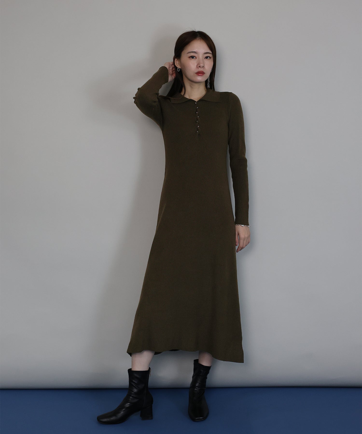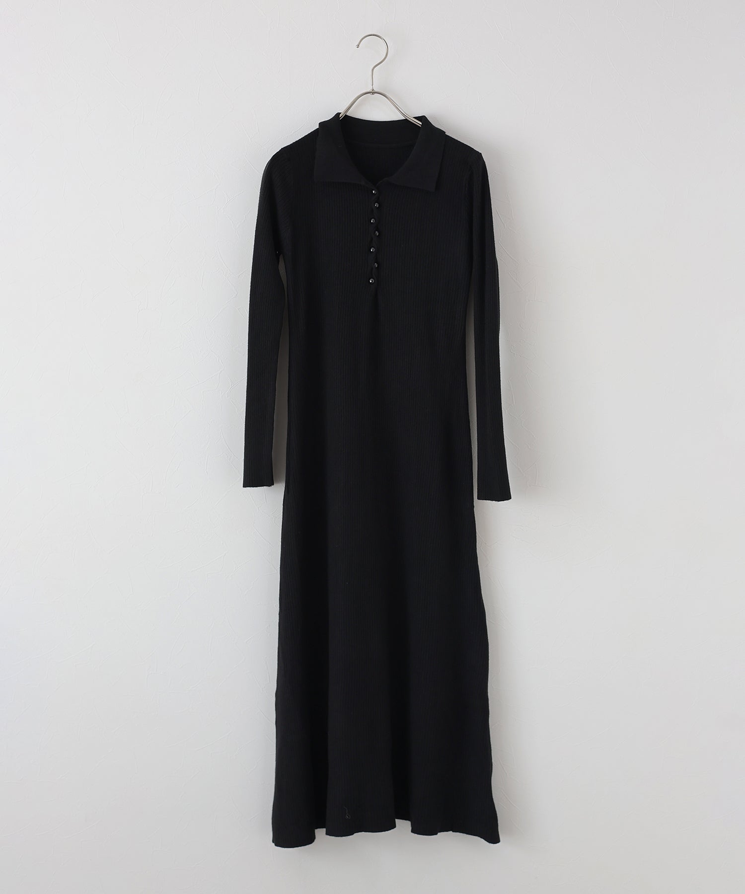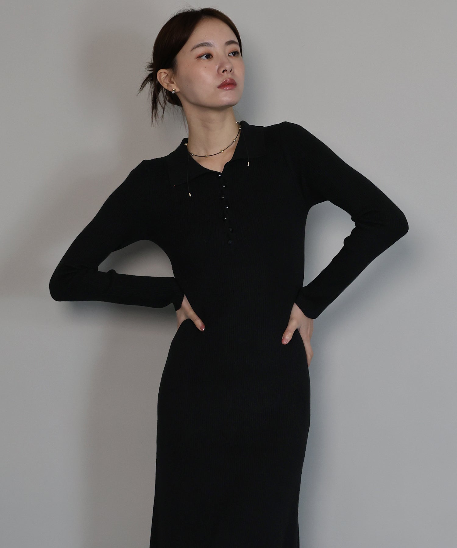 交互に配置されたデザインボタンが目を引くロングニットワンピース。