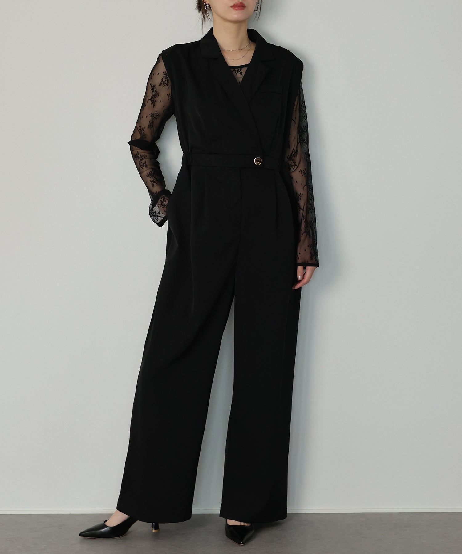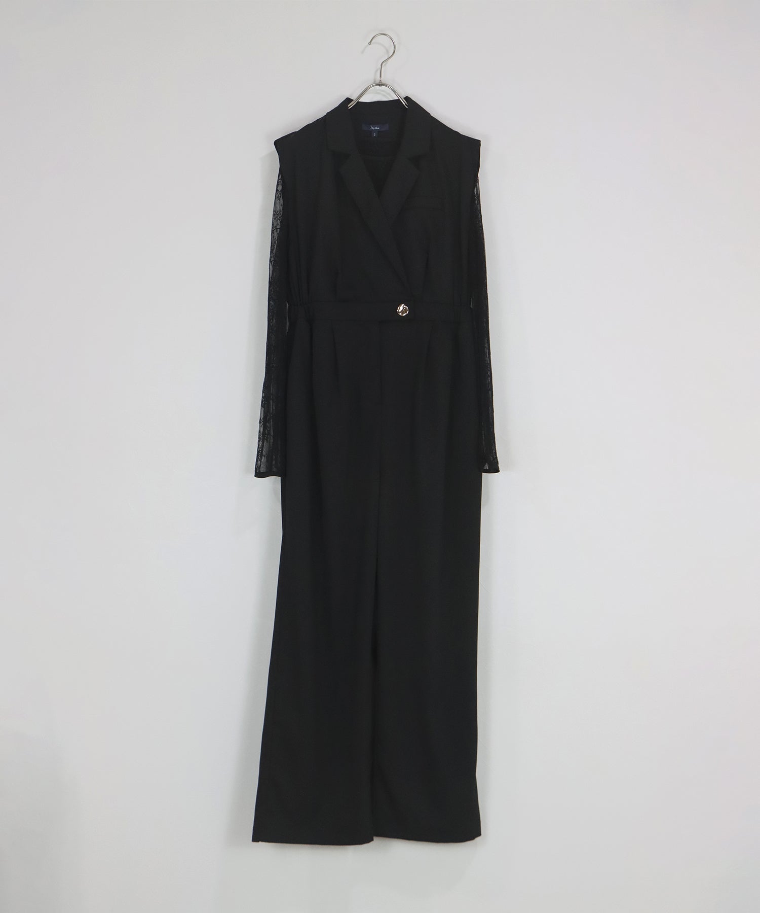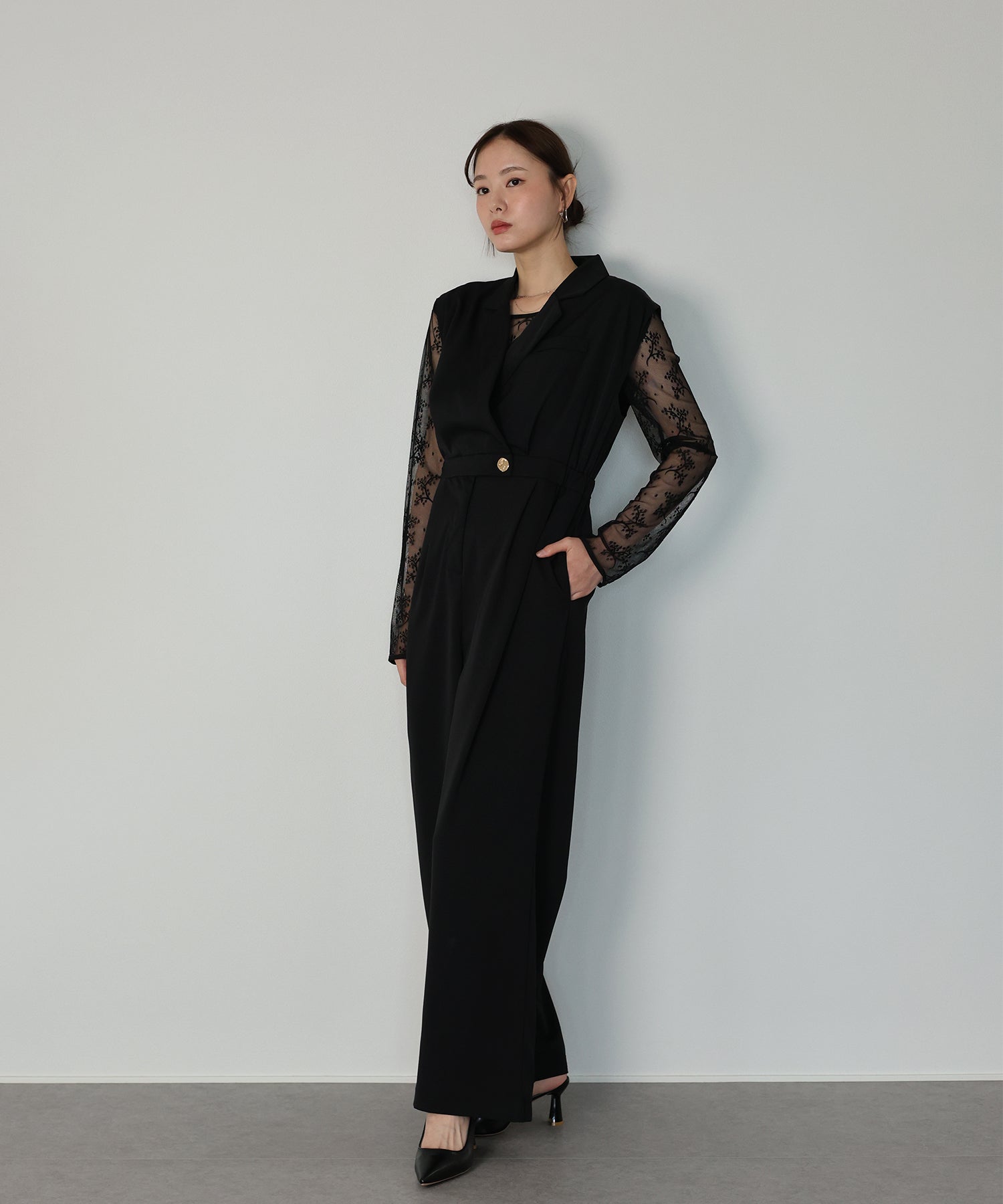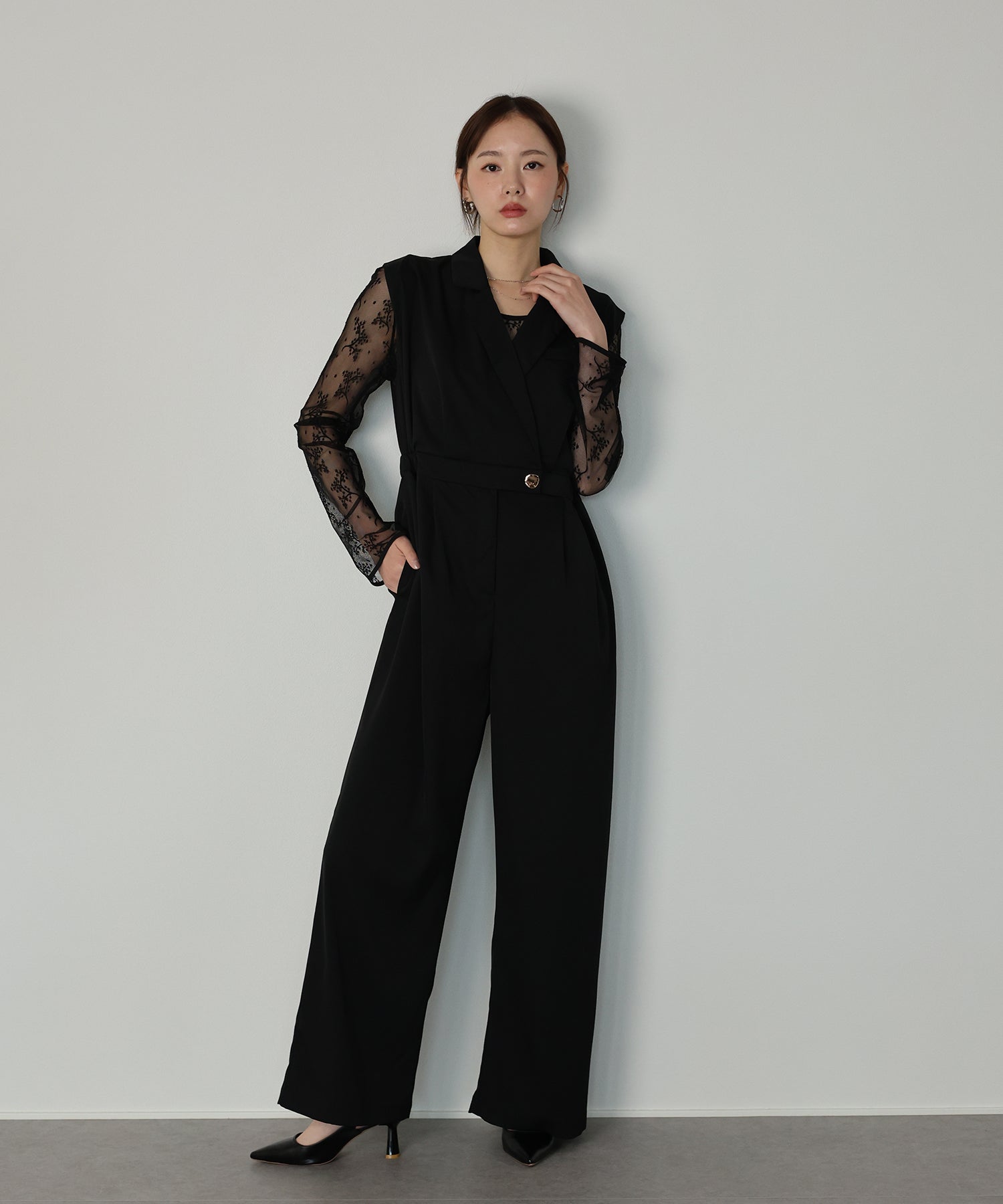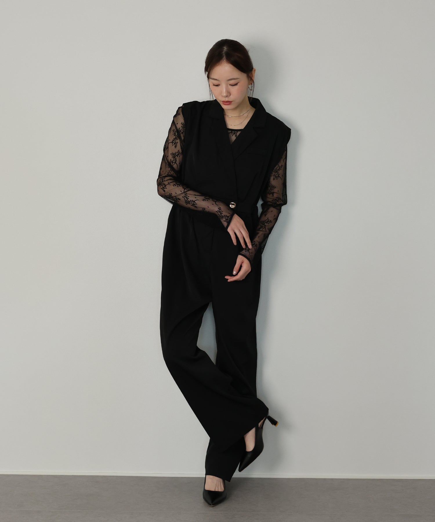 テーラードオールインワンパンツドレス+ジャガードチュールトップスSET