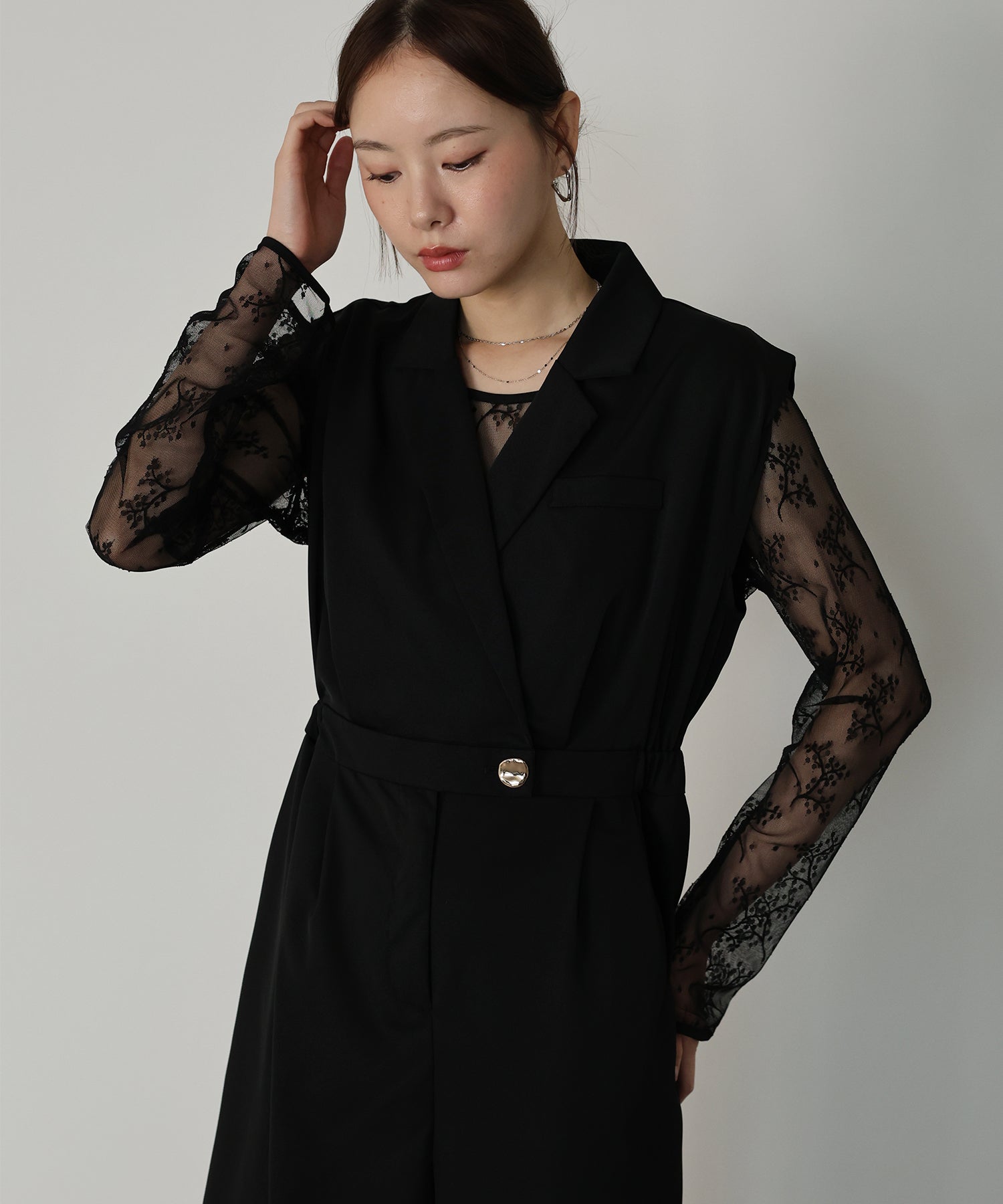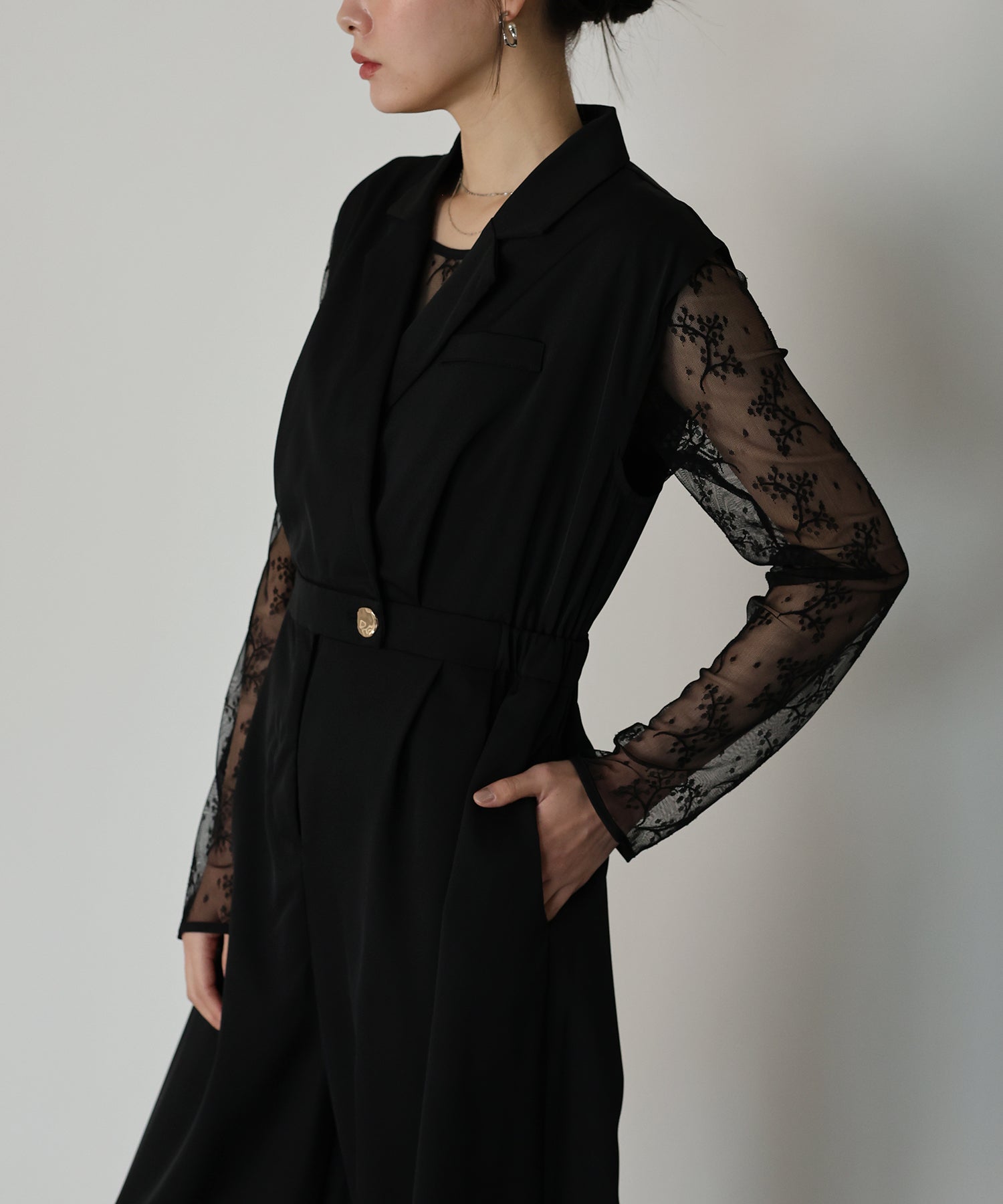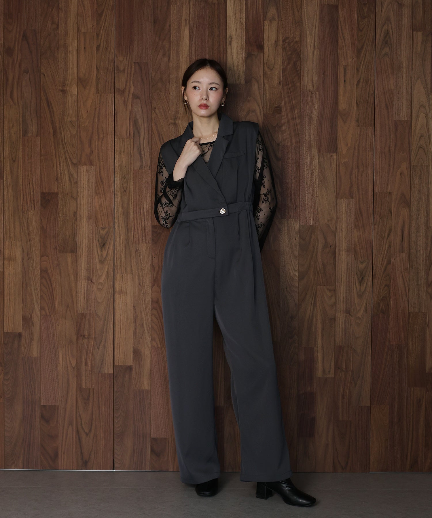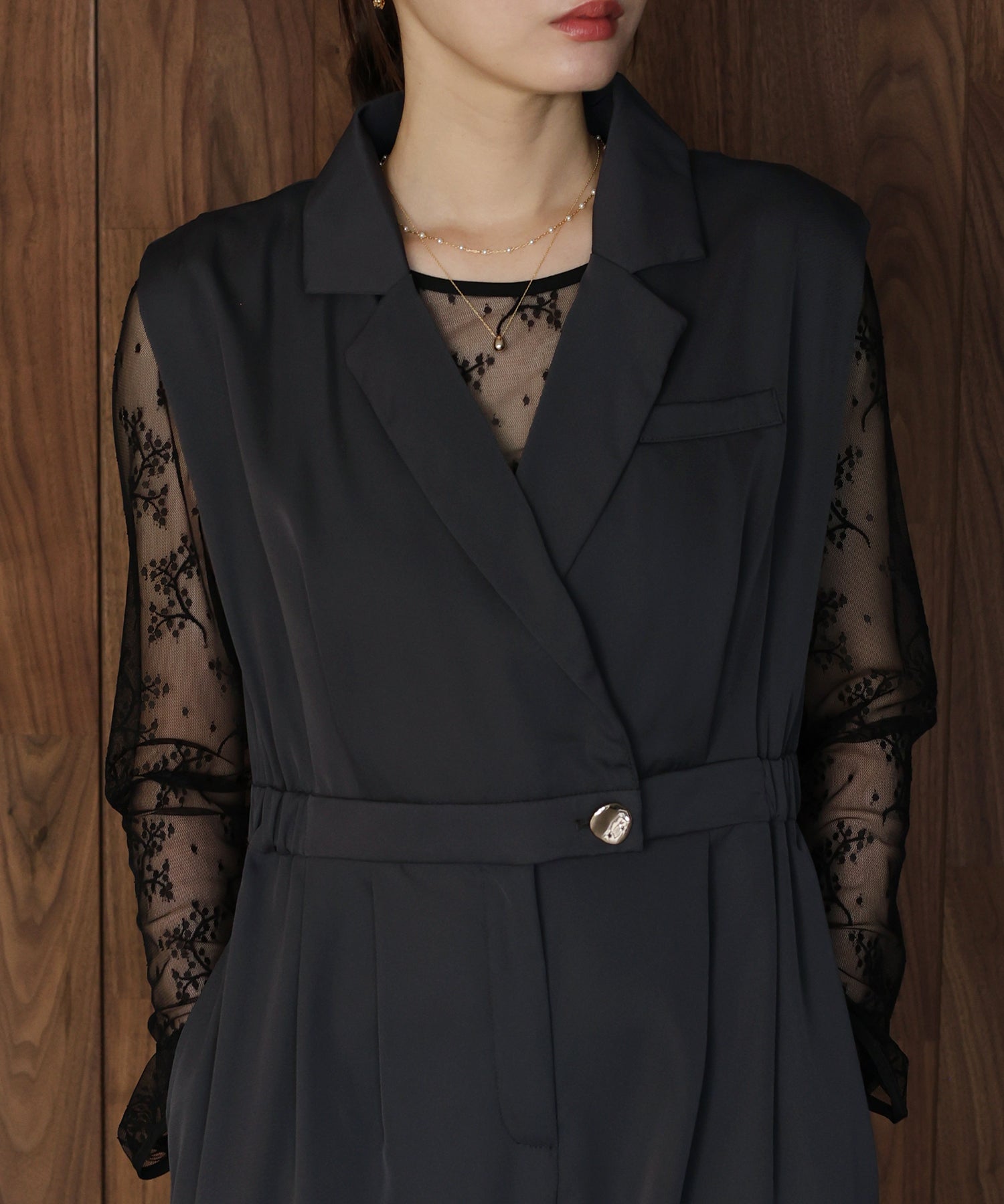 テーラードオールインワンパンツドレス+ジャガードチュールトップスSET