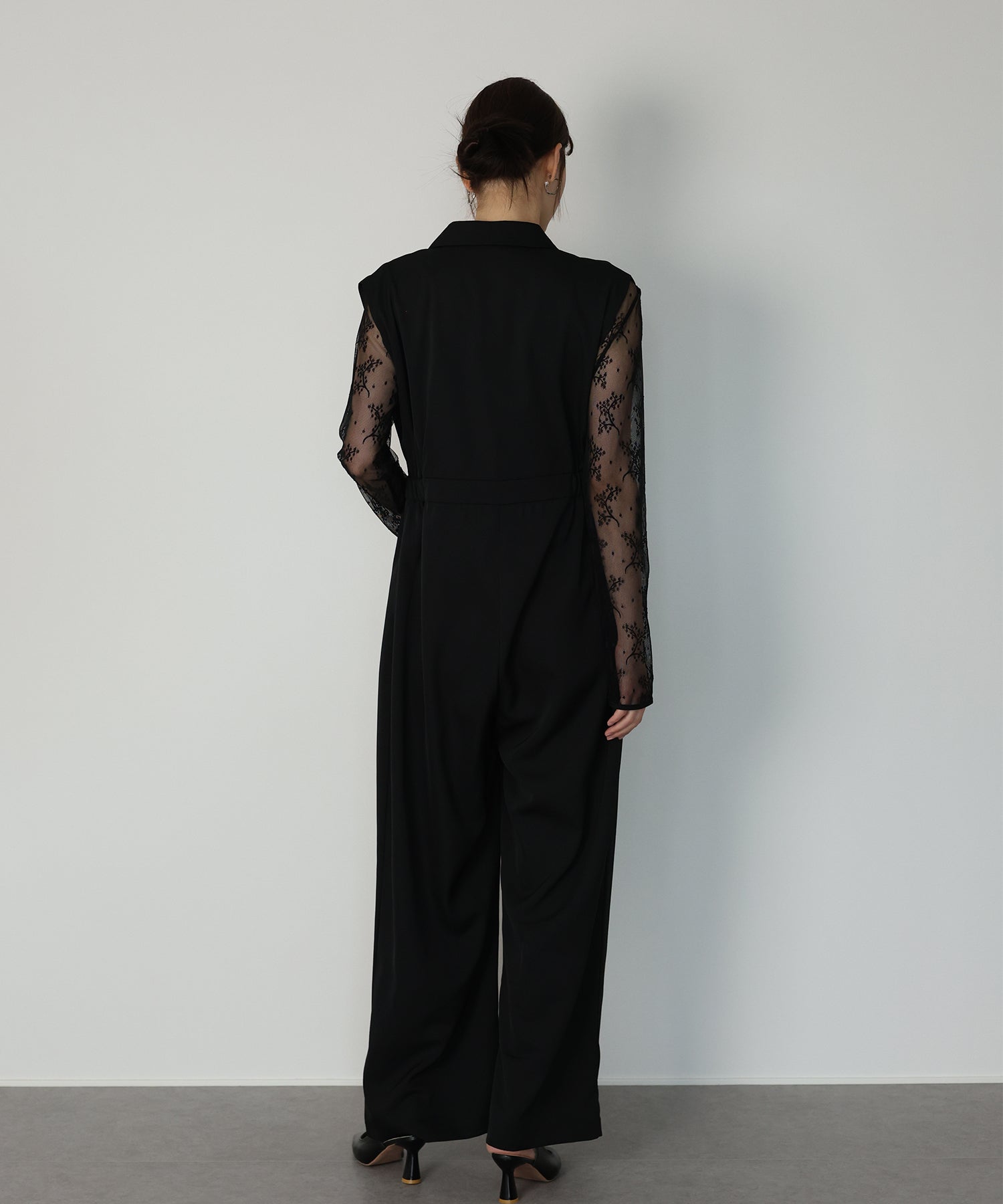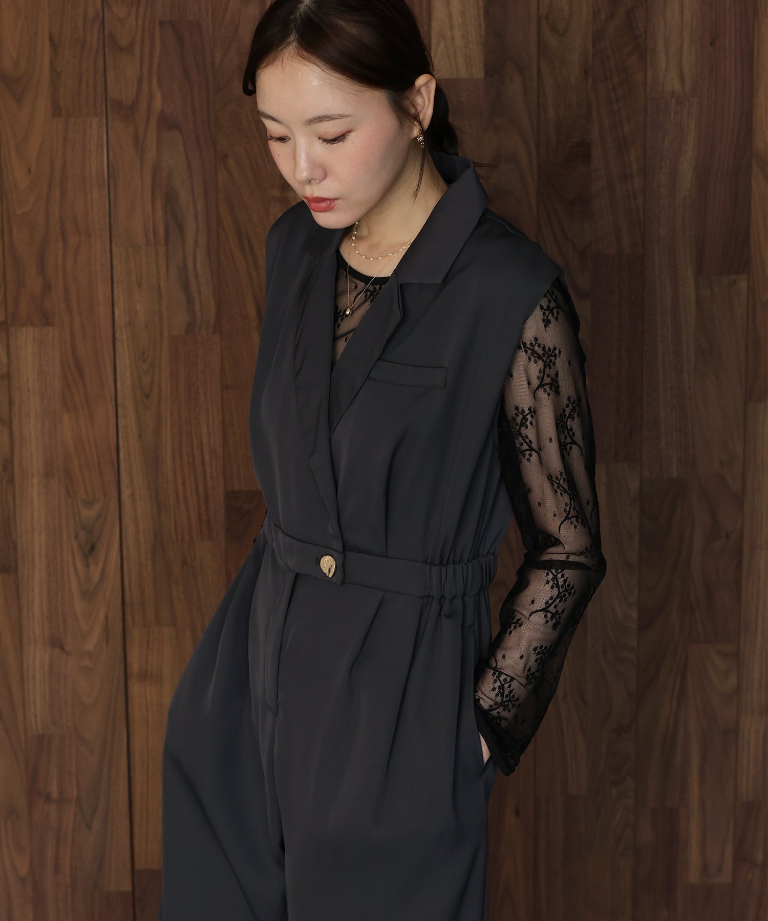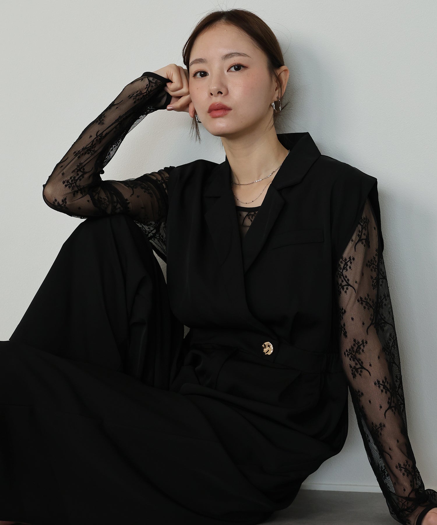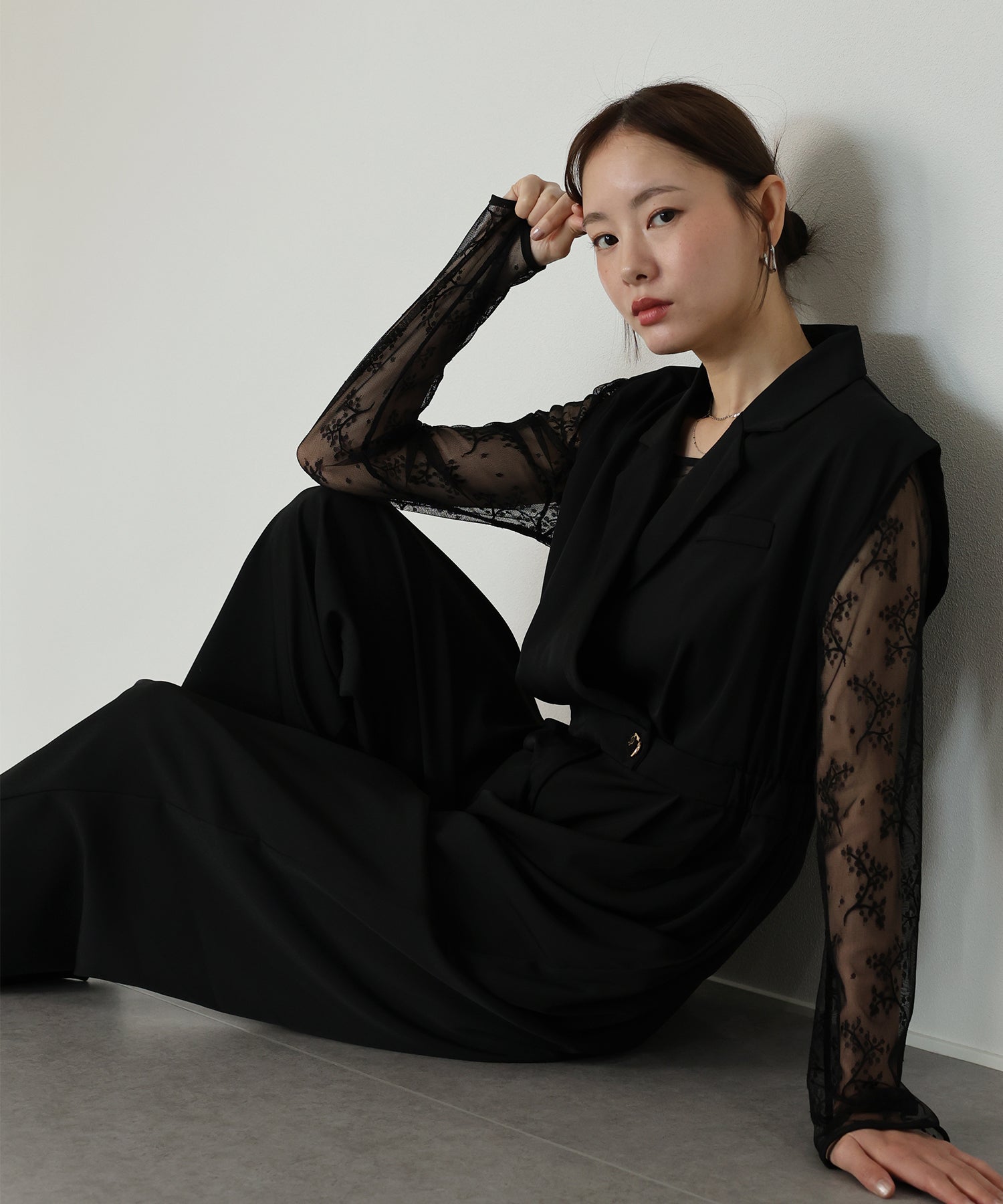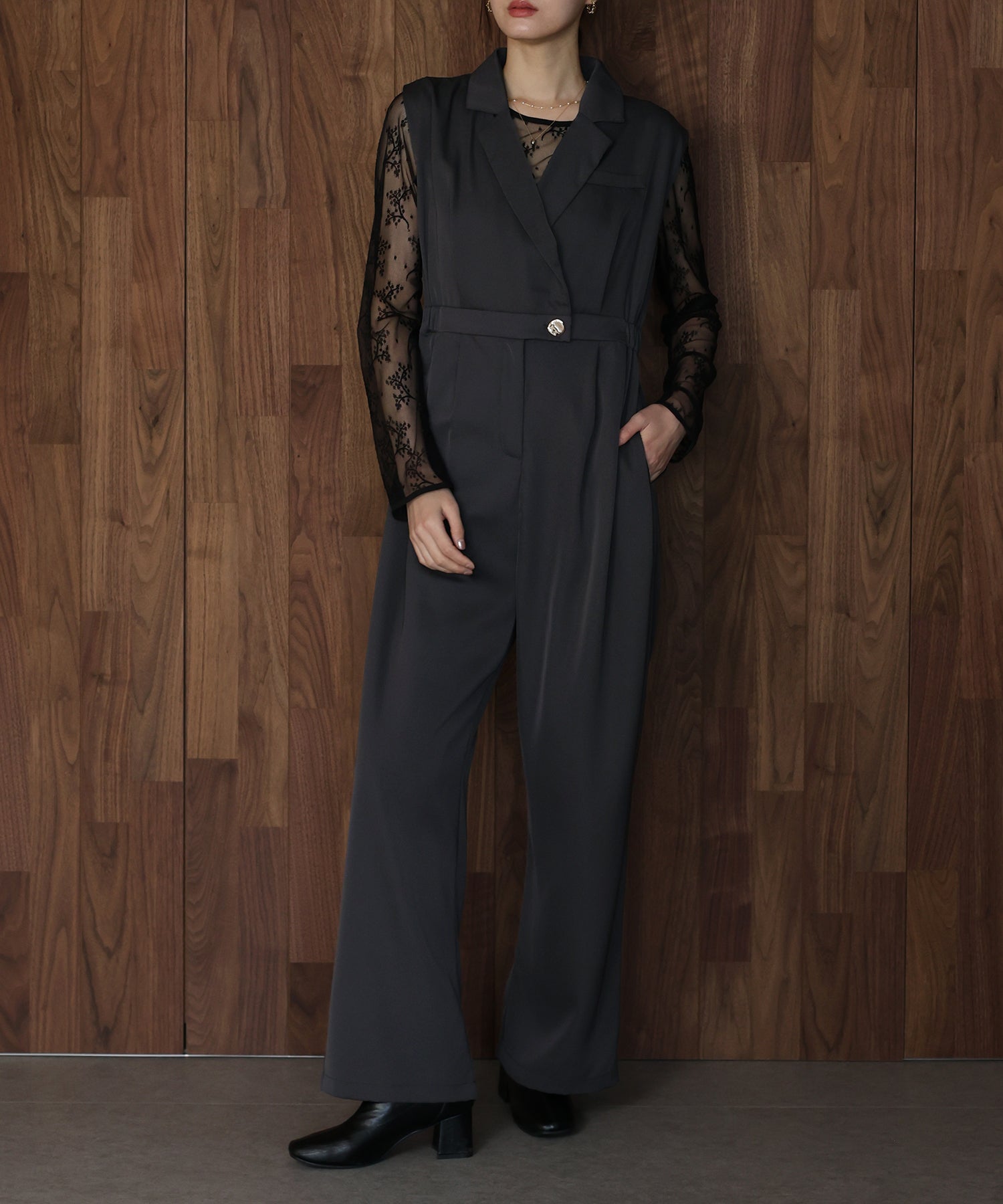 テーラードオールインワンパンツドレス+ジャガードチュールトップスSET
