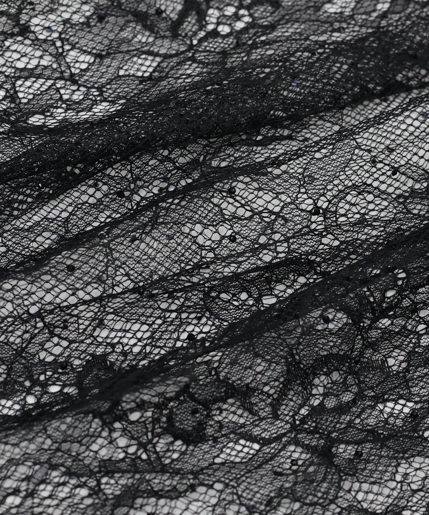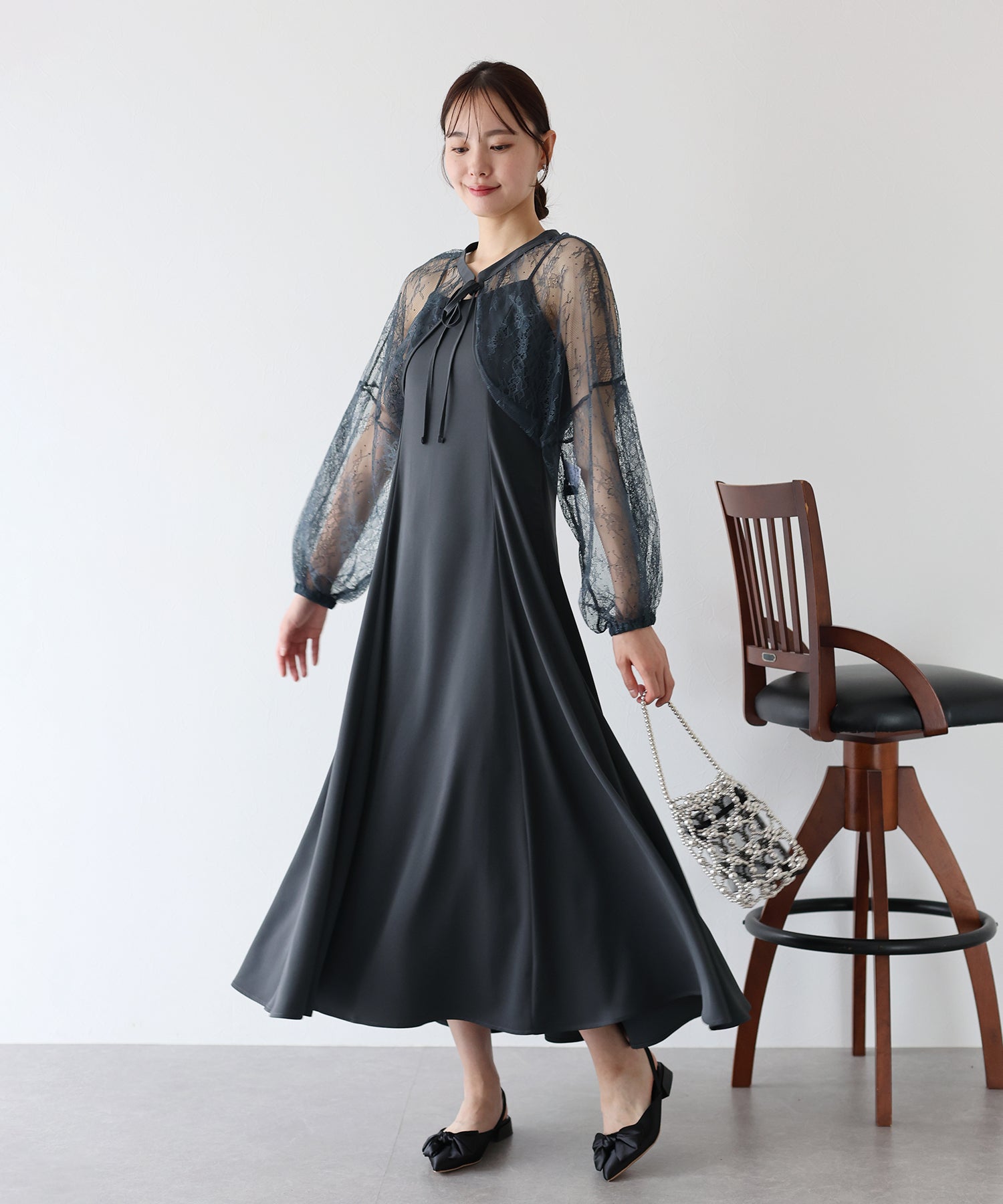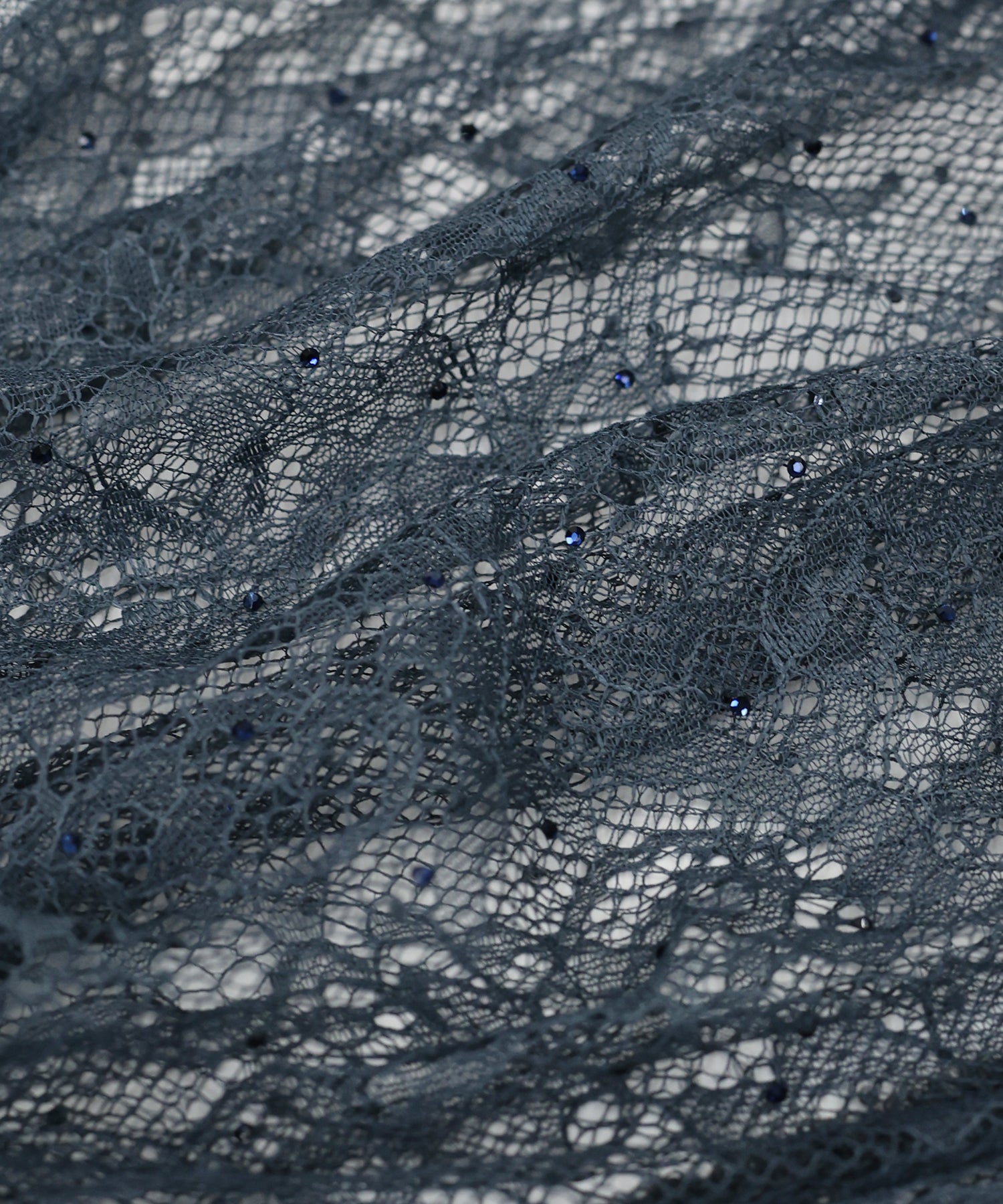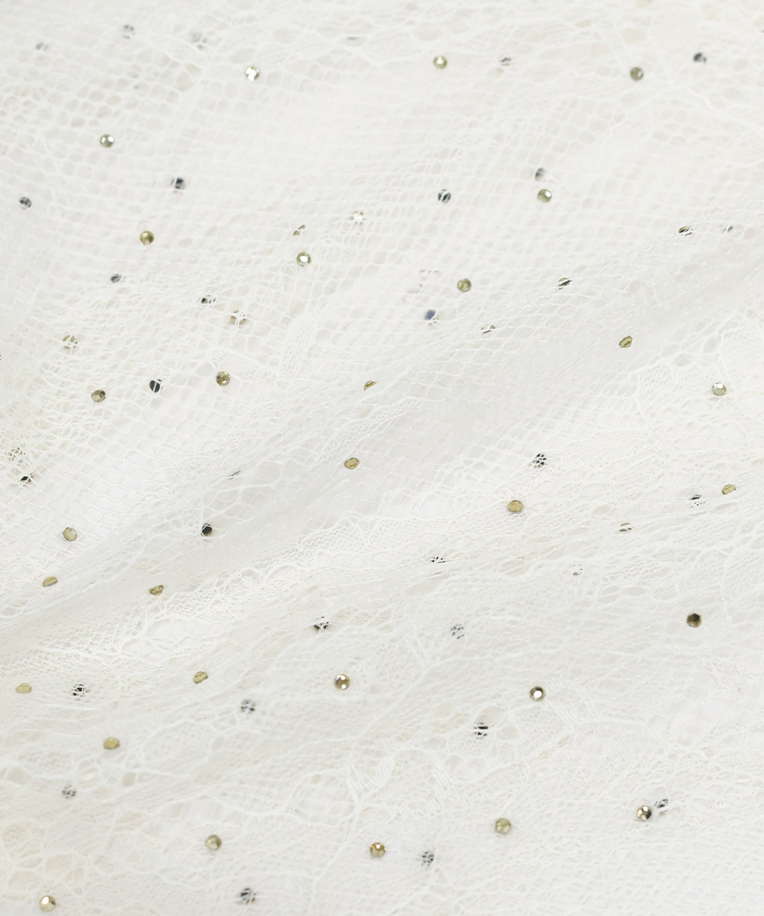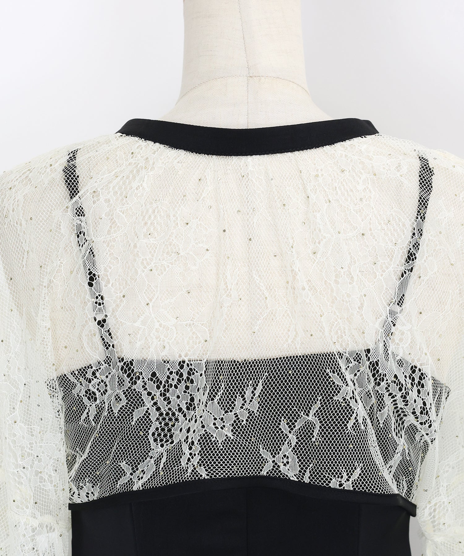 トップス:ビジュー付きレース素材 ワンピース:光沢のあるつるっとした合繊素材 |